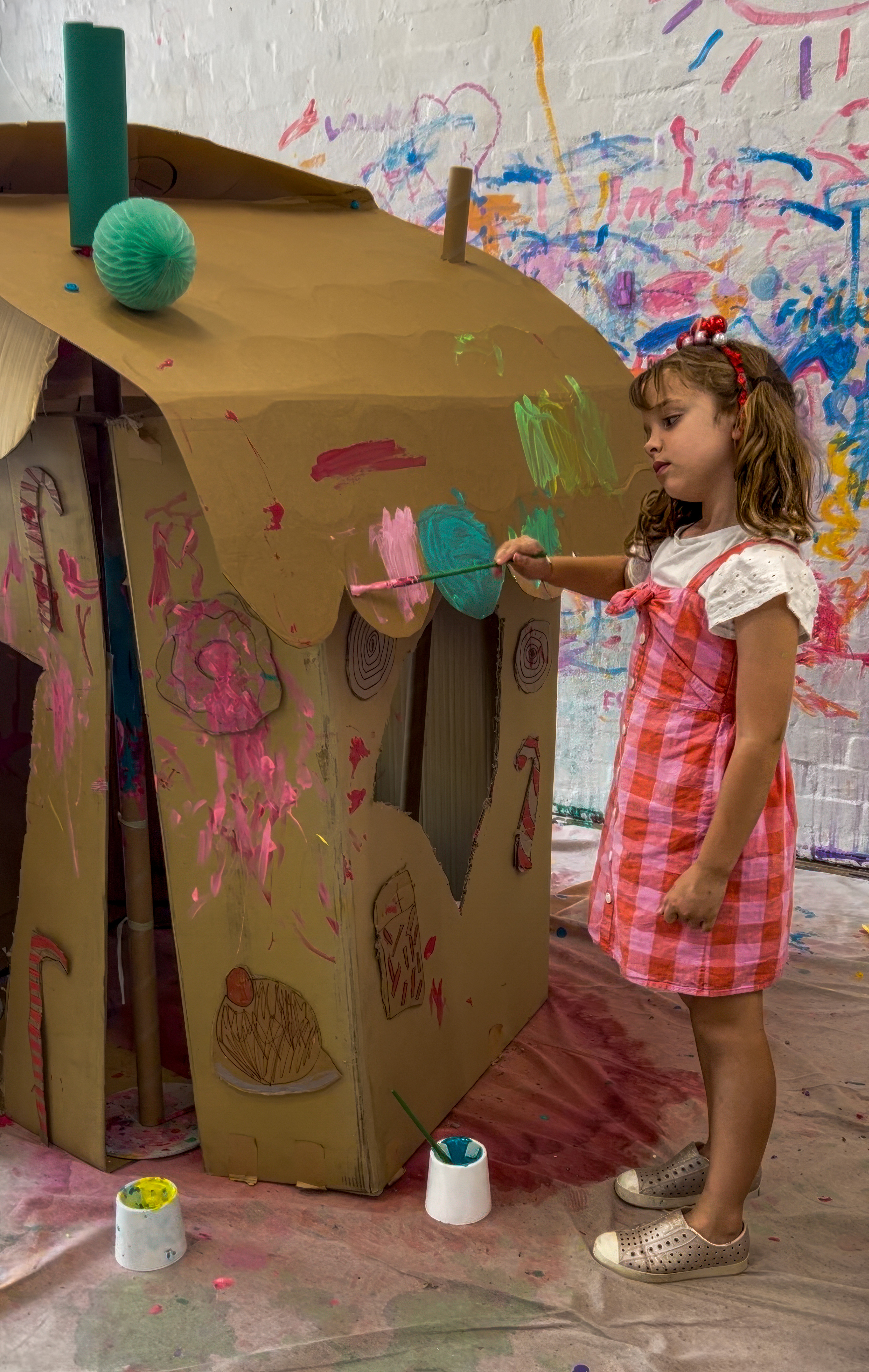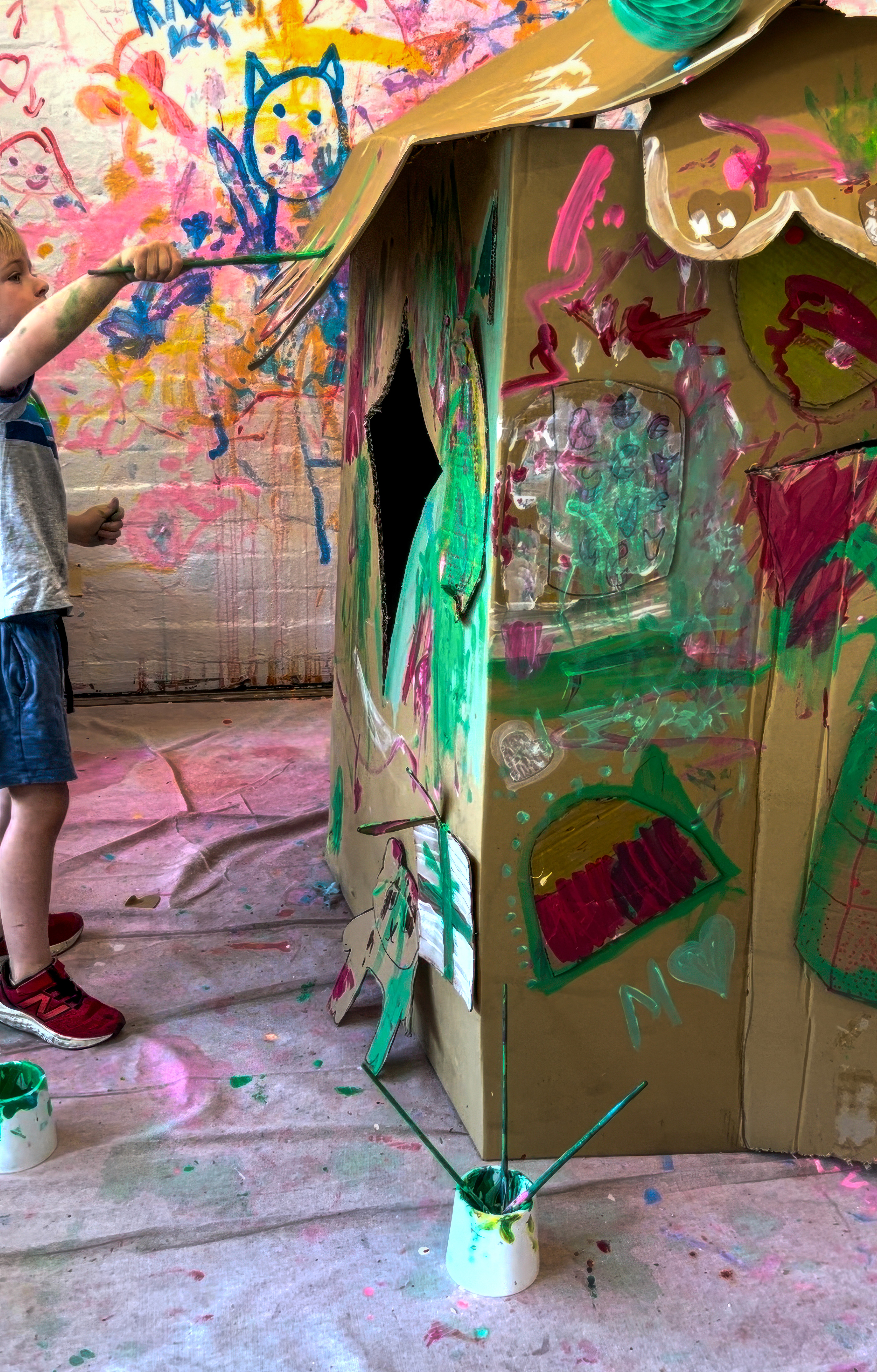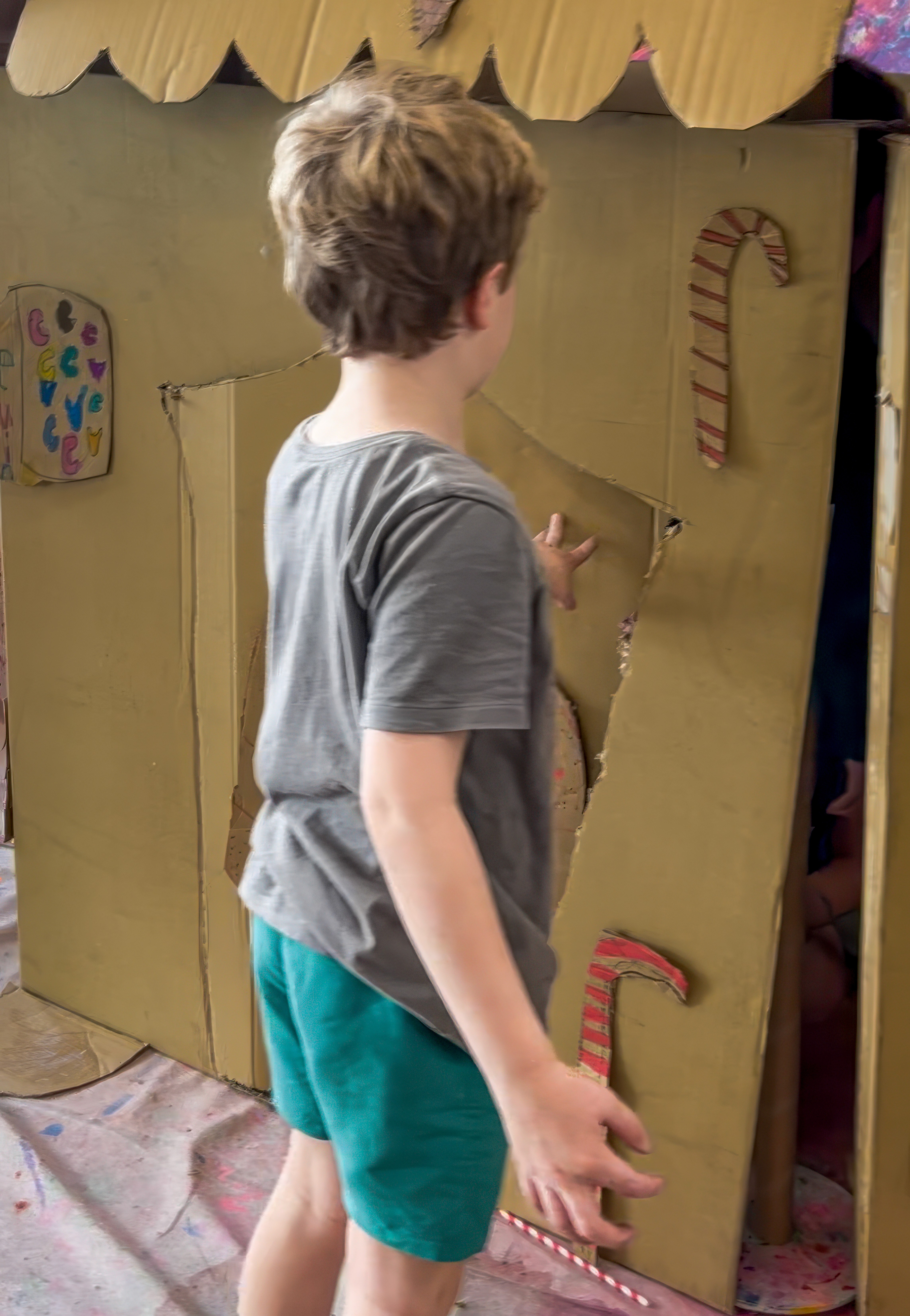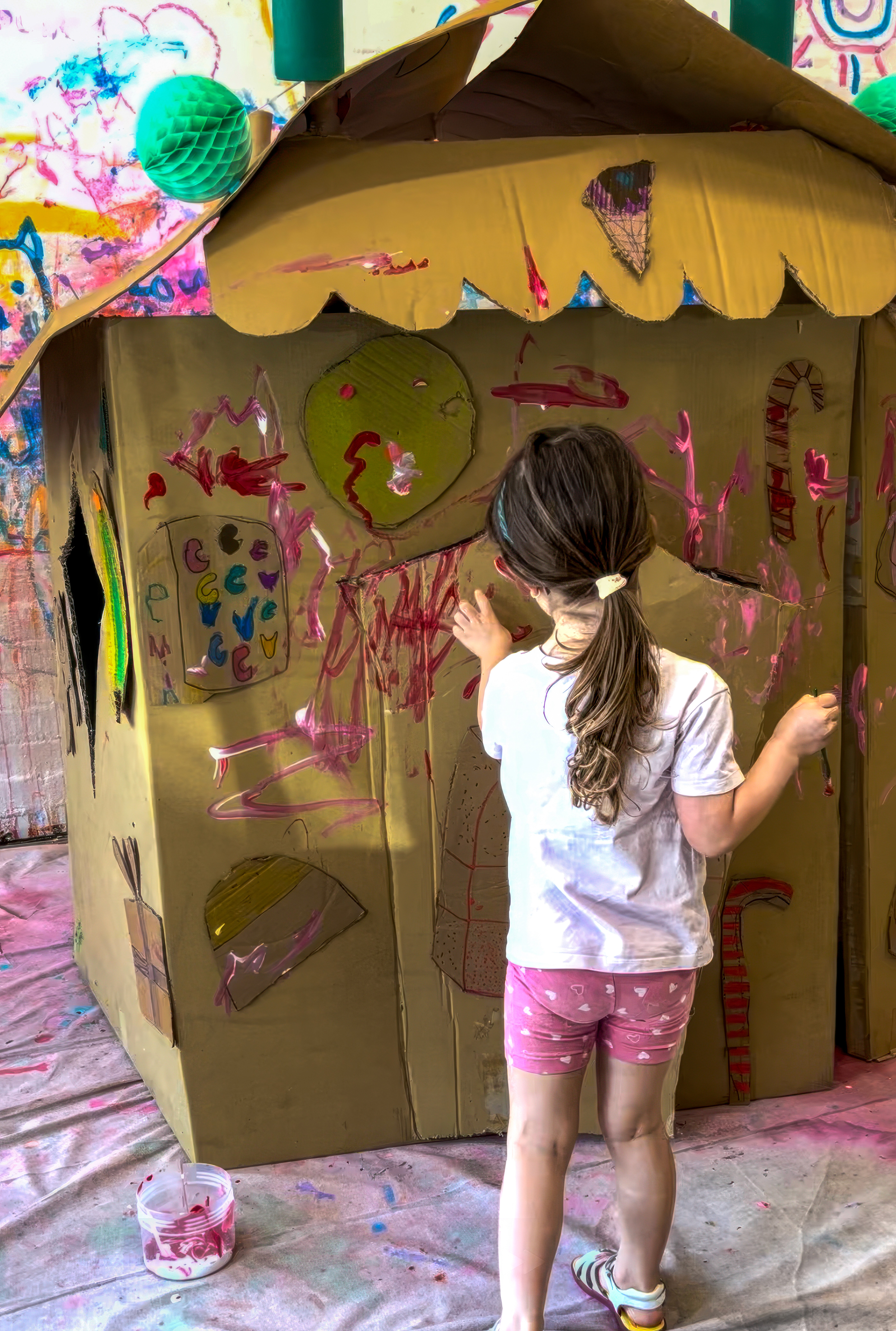 Once the base is dry enough to touch, bring in the candy. Kids attach cardboard shapes with makedo or tape or glue and paint over the top, layering colour, pattern and texture.