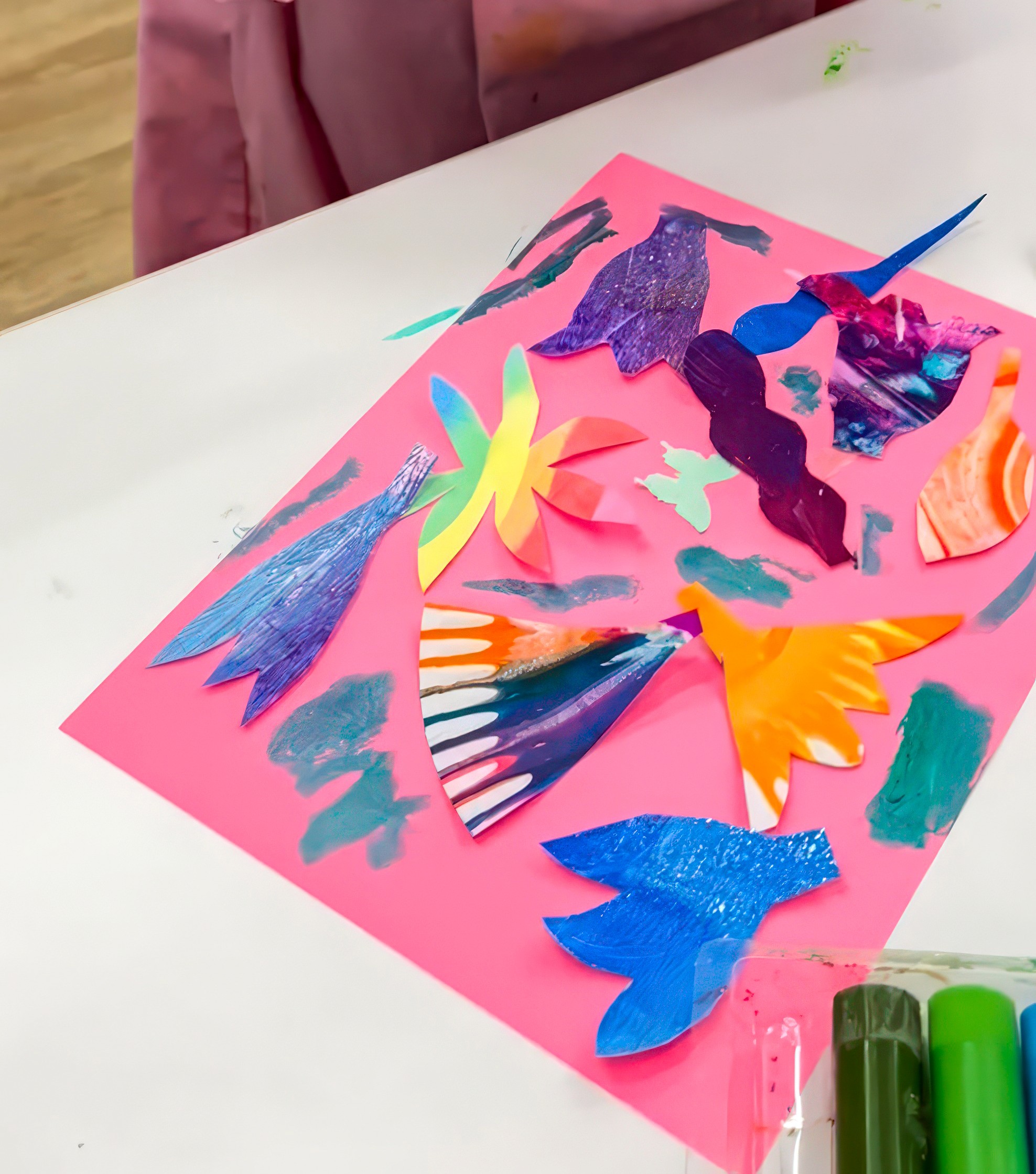 Gather a table full of colour and texture. Painted papers, magazine clippings, sheet music, foil, even old artworks ready for a new life. Add scissors, glue, and both pre cut shapes and whole sheets so everyone can choose how to begin. Some children dive in quickly with ready petals, others want the satisfaction of designing every leaf and flower from scratch.