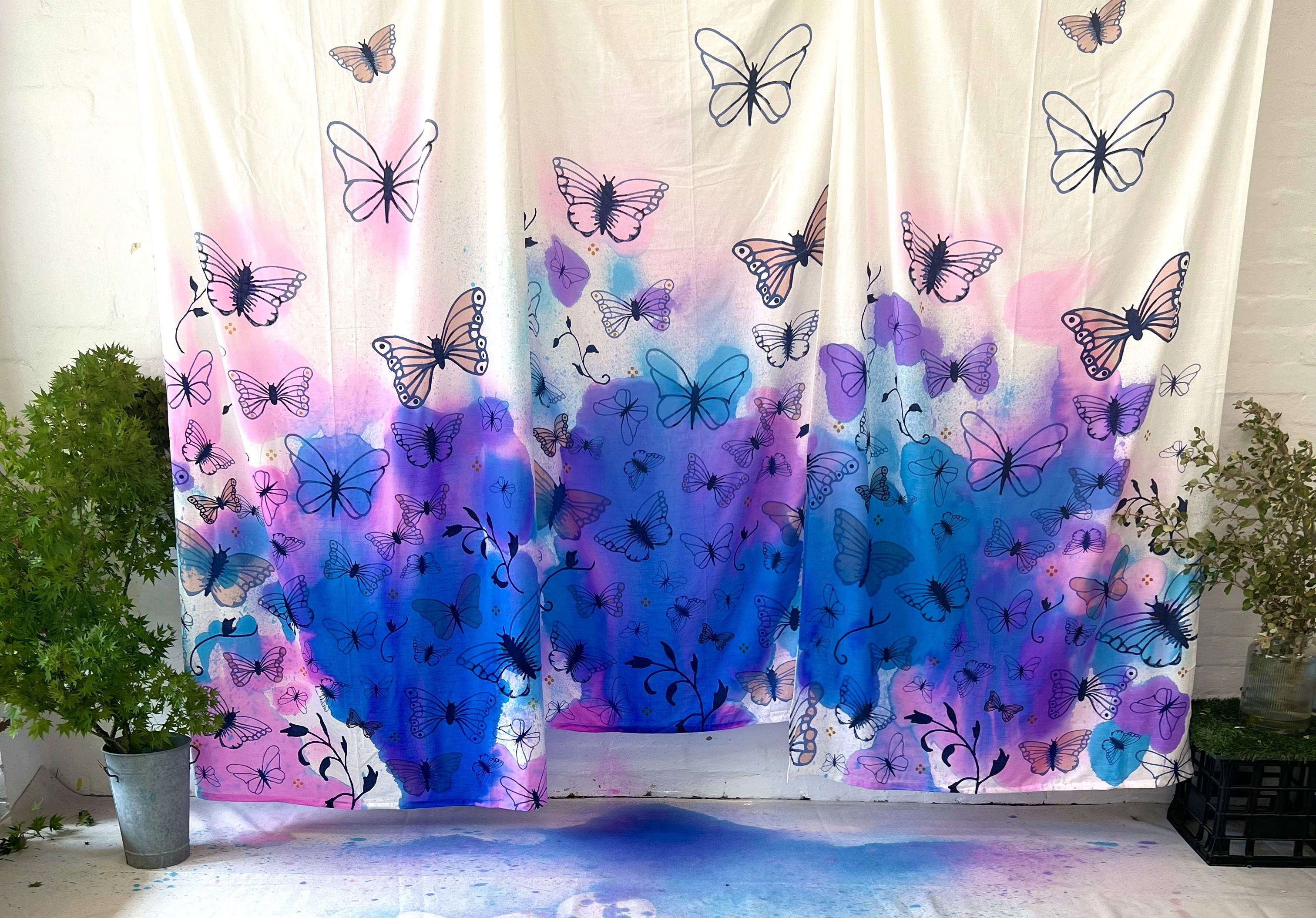 We lay down a heavy canvas drop sheet (the plastic-backed kind). Monarch makes a great one, though any hardware brand will do. It becomes a living surface: kids walk, paint, spill, and suddenly the floor itself is part of the art. The space transforms in front of them. What started as blank walls and boxes ends up glowing with layers of colour and texture… proof that creativity grows best when we stop trying to contain it.