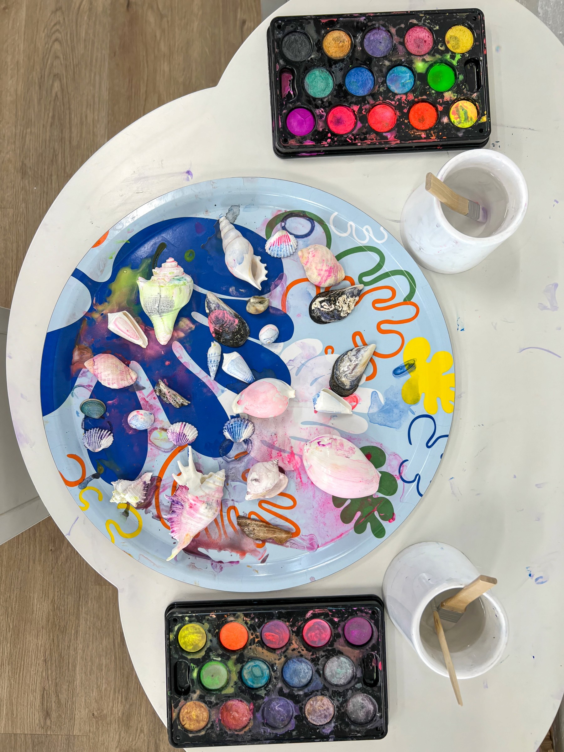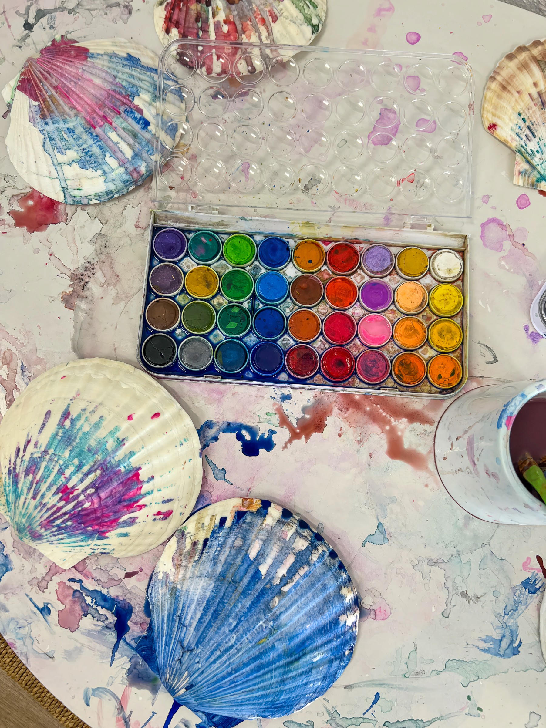 Lay out a collection of shells and beach finds in different shapes and sizes. Add watercolour palettes, brushes, jars of water and trays to catch the drips.