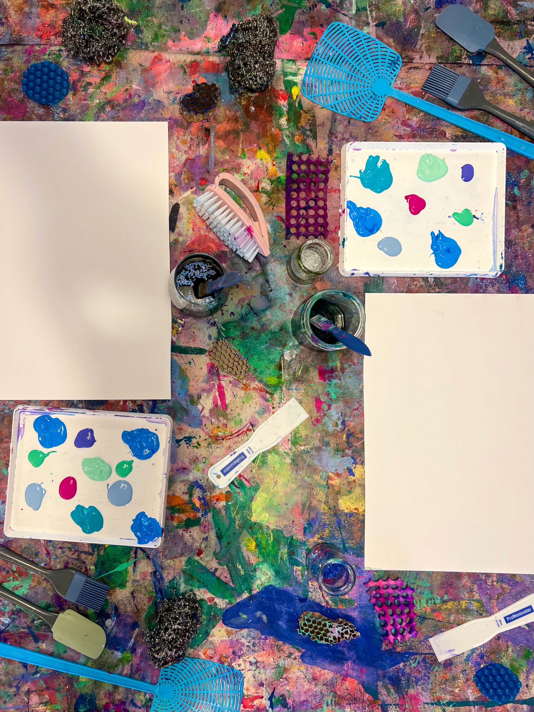 A wild mix of tools: brushes and sponges and bubble wrap and loufas and whatever else leaves watery marks