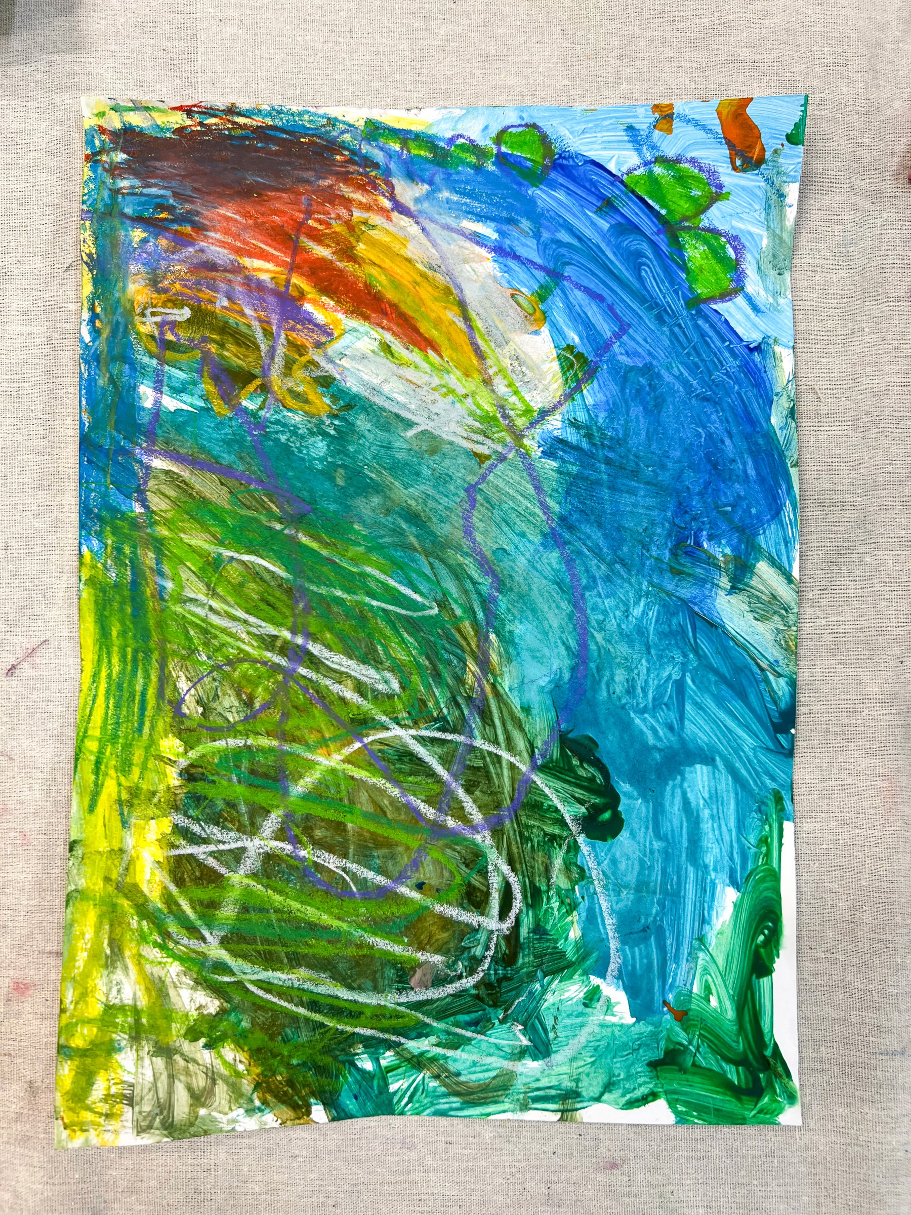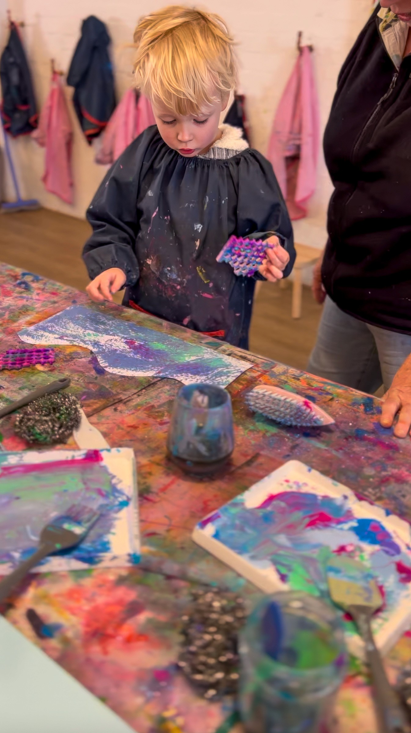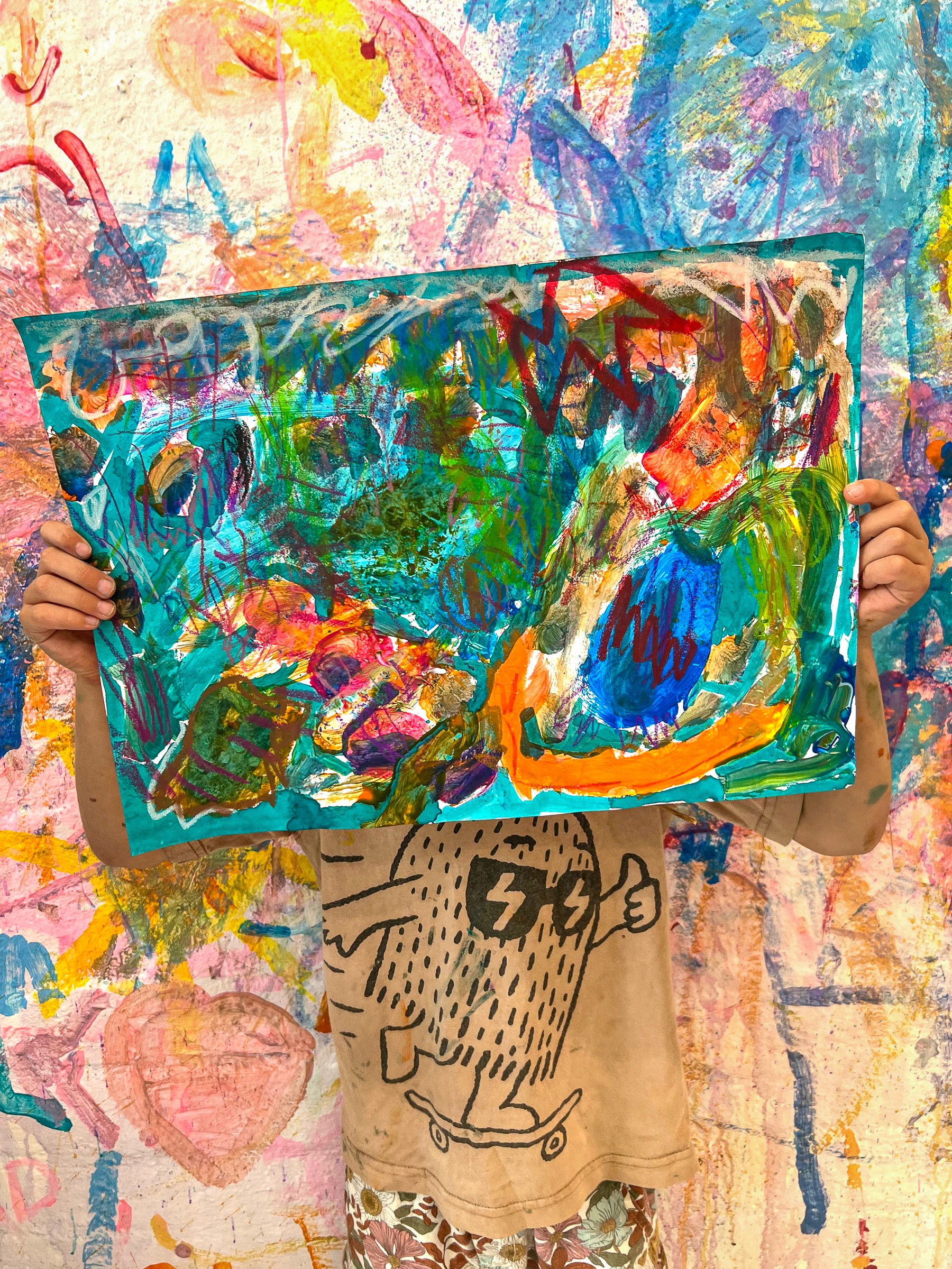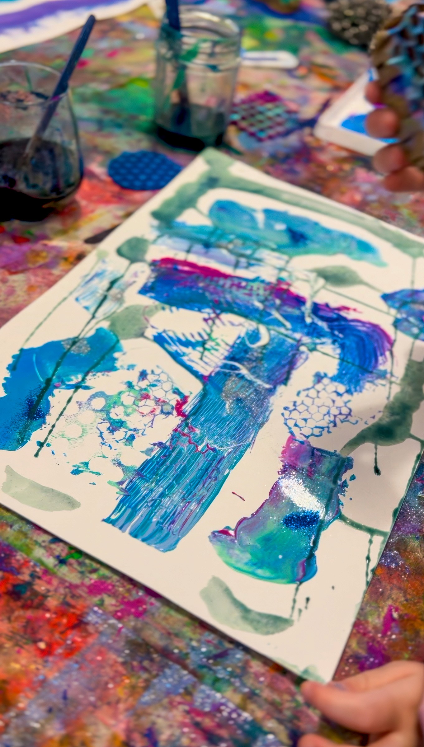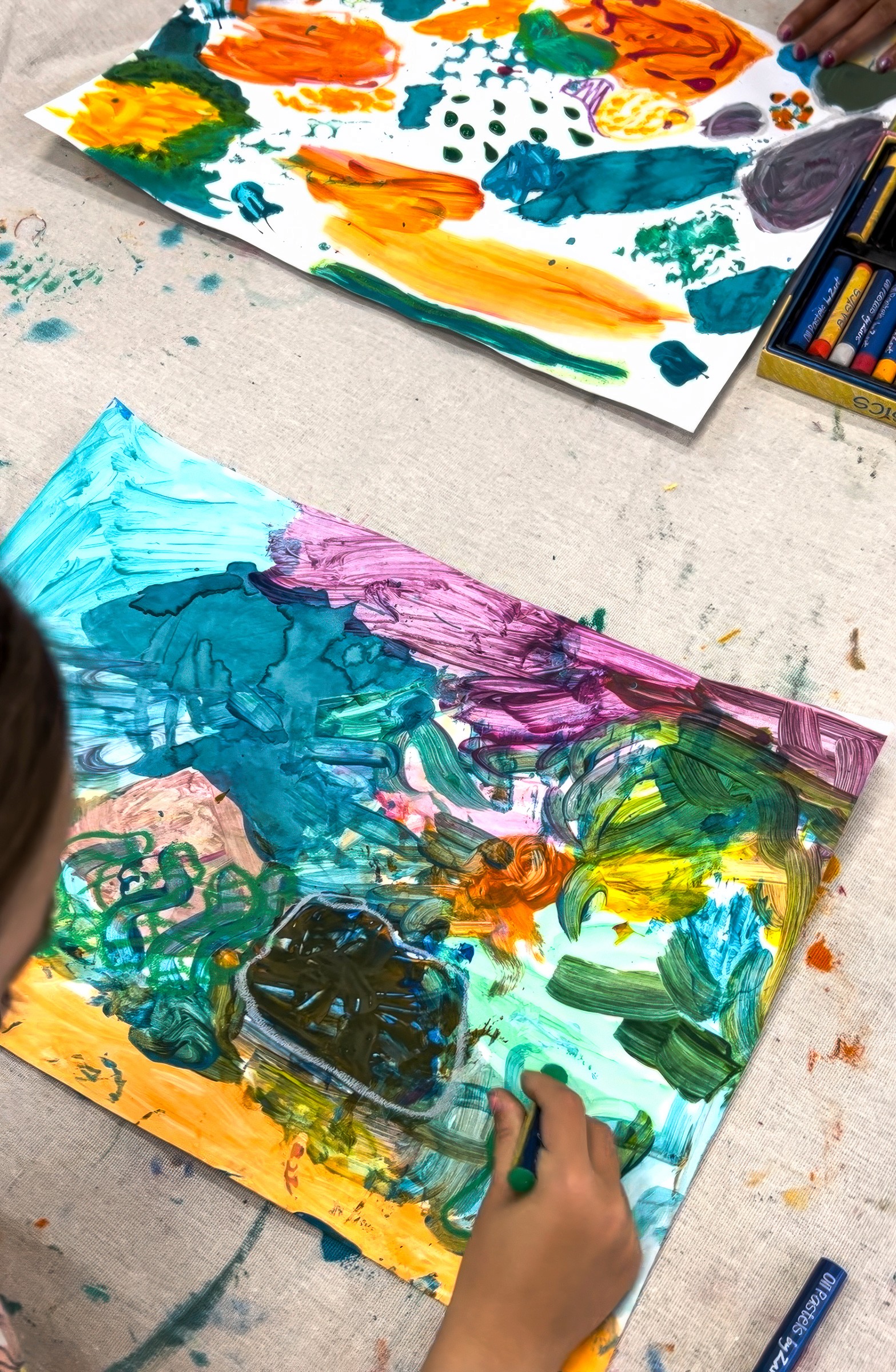 There’s no single way in. Some artists layer paint thick and fast, others print and stamp and dab until the page hums with texture. Encourage mixing, overlapping, letting colours collide.