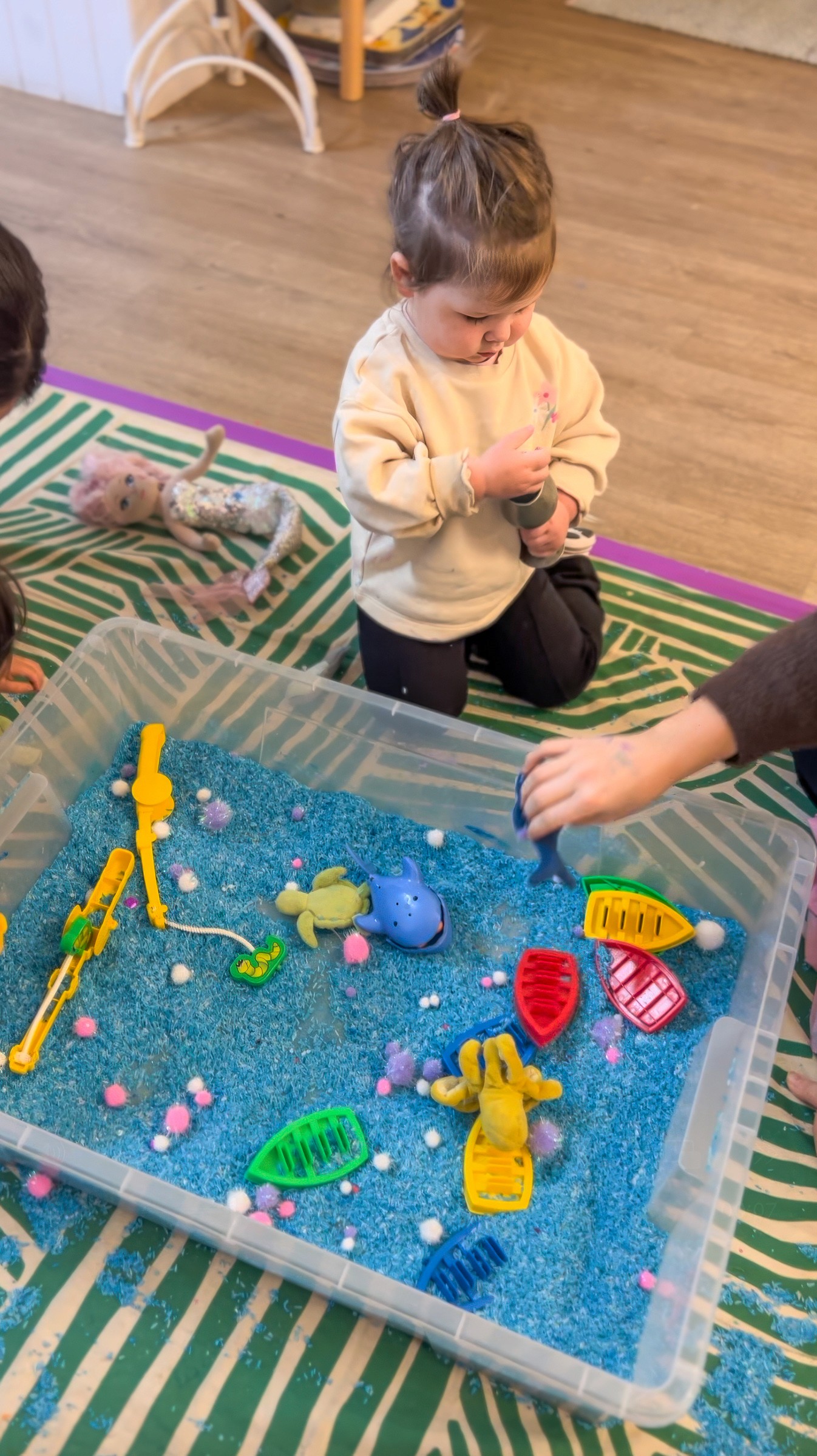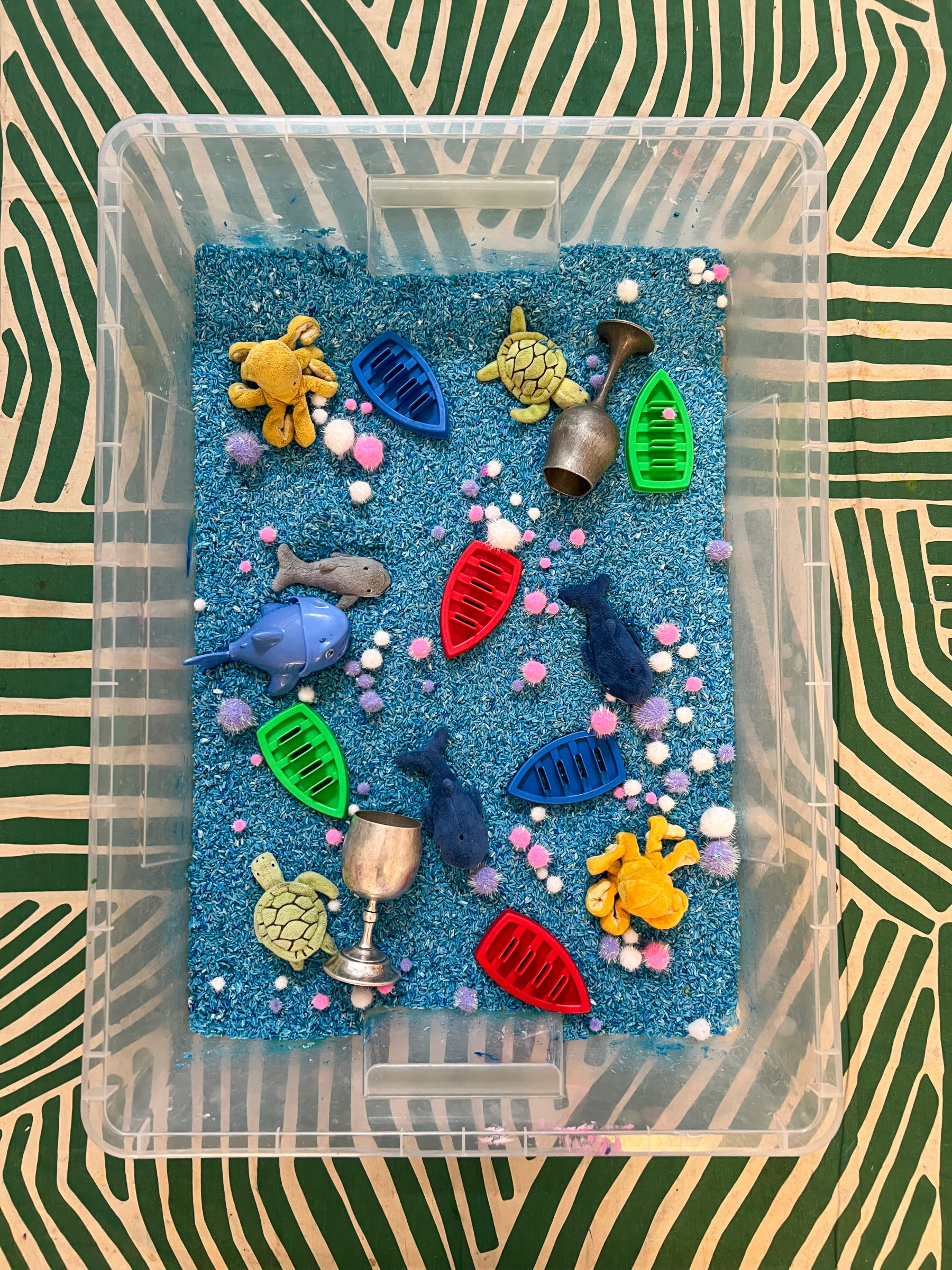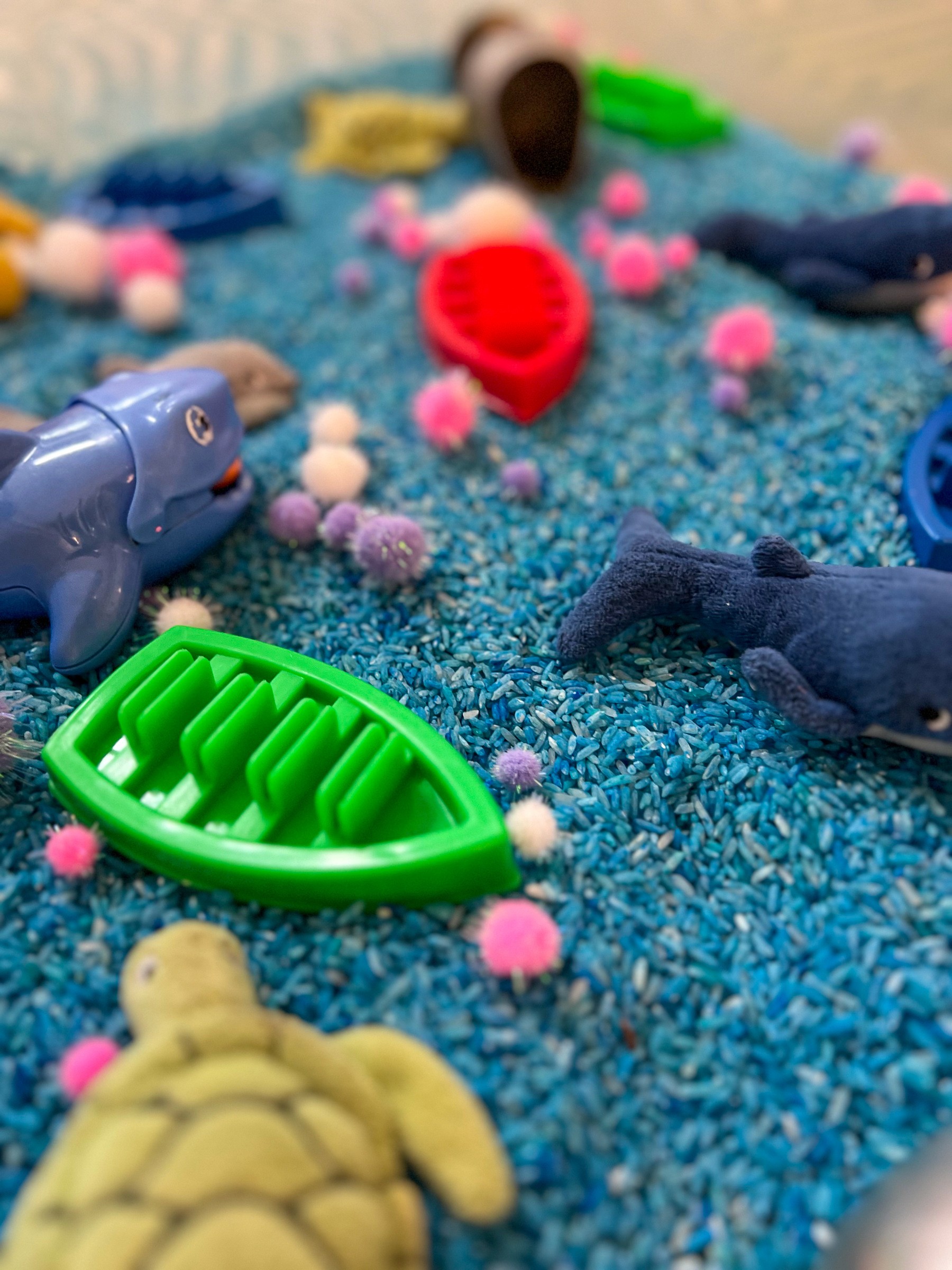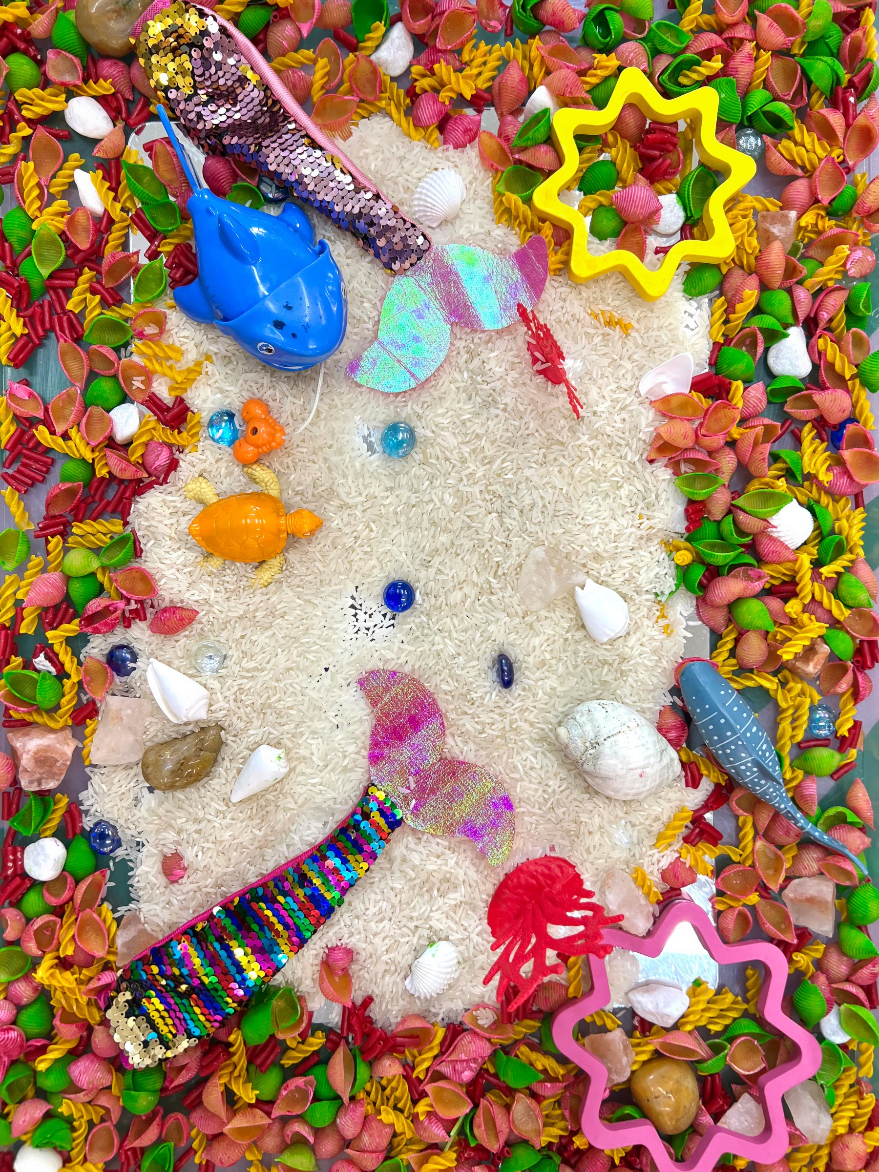 Once it’s dry, tip it into a deep tub. A base of plain white rice makes the colours pop, and mirrors at the bottom turn it into a tidal pool that shimmers. Add in whatever feels ocean-y; shells, sea creatures, mermaid tails (I borrowed Olive’s Barbie tail dress-ups for this and they were perfect). Bowls, cups, and scoops nearby invite endless pouring and filling.