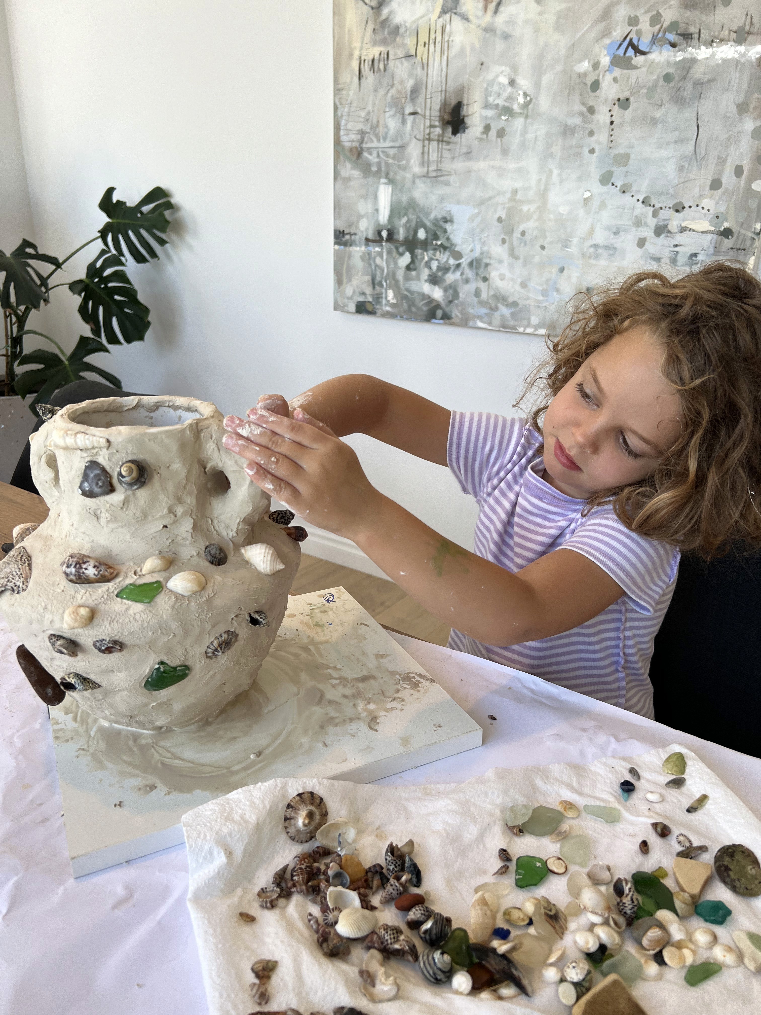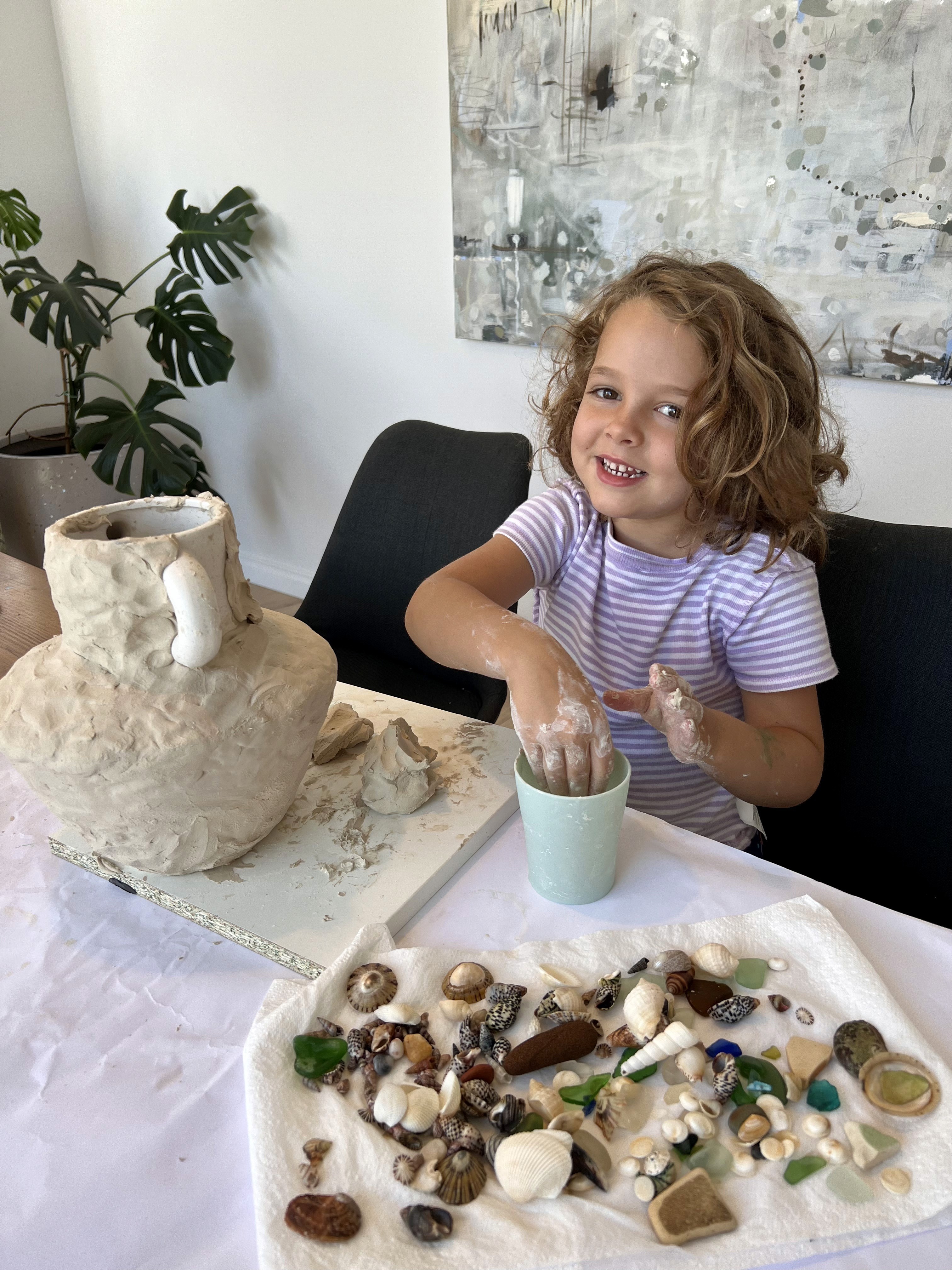 This idea was born from a beachcombing day with our daughter Olive. We came home with gorgeous frosted sea glass, and she sculpted a vase to hold it all, like a little treasure keeper for our Summer!