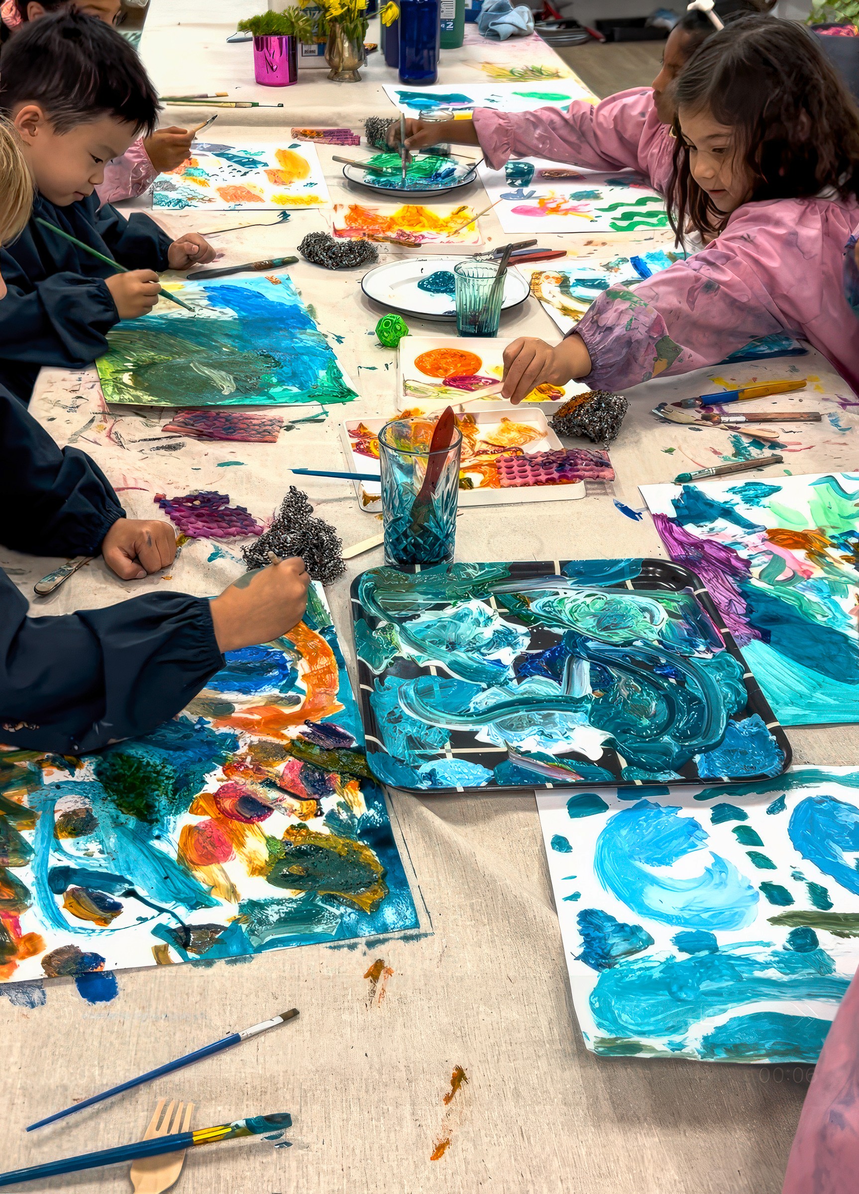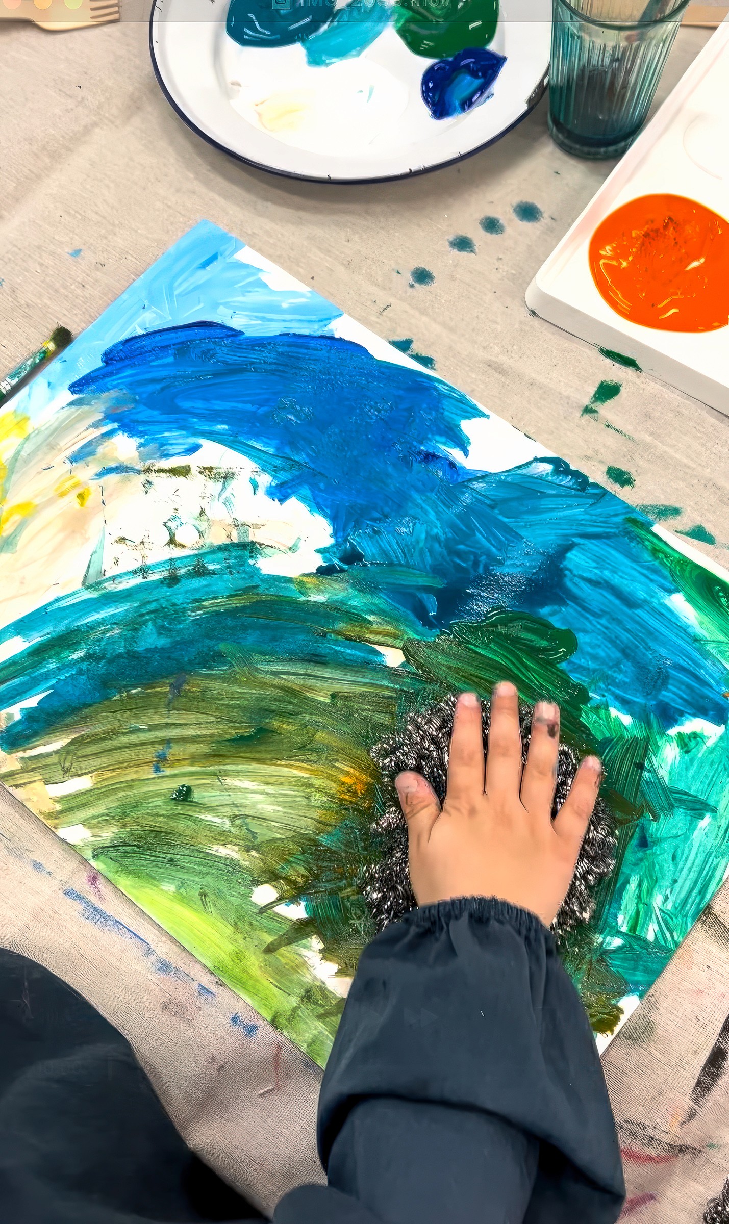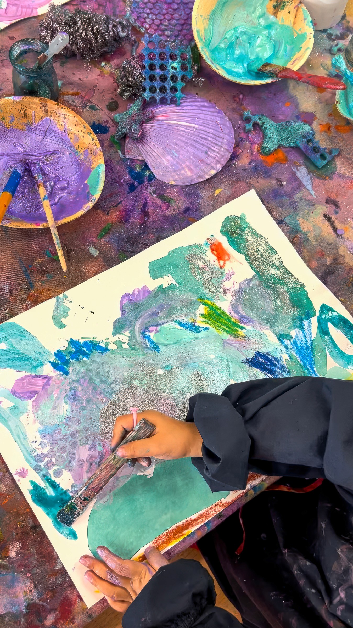 And of course… paint. Always tubs of washable poster or tempera, with a good squeeze of white mixed in to make the colours sing. All the ocean shades work here like seafoam green, turquoise shallows, deep indigo. It’s a brilliant chance to chat about how the sea changes with the light: bright and sparkling near the surface, dark and mysterious the deeper you go.