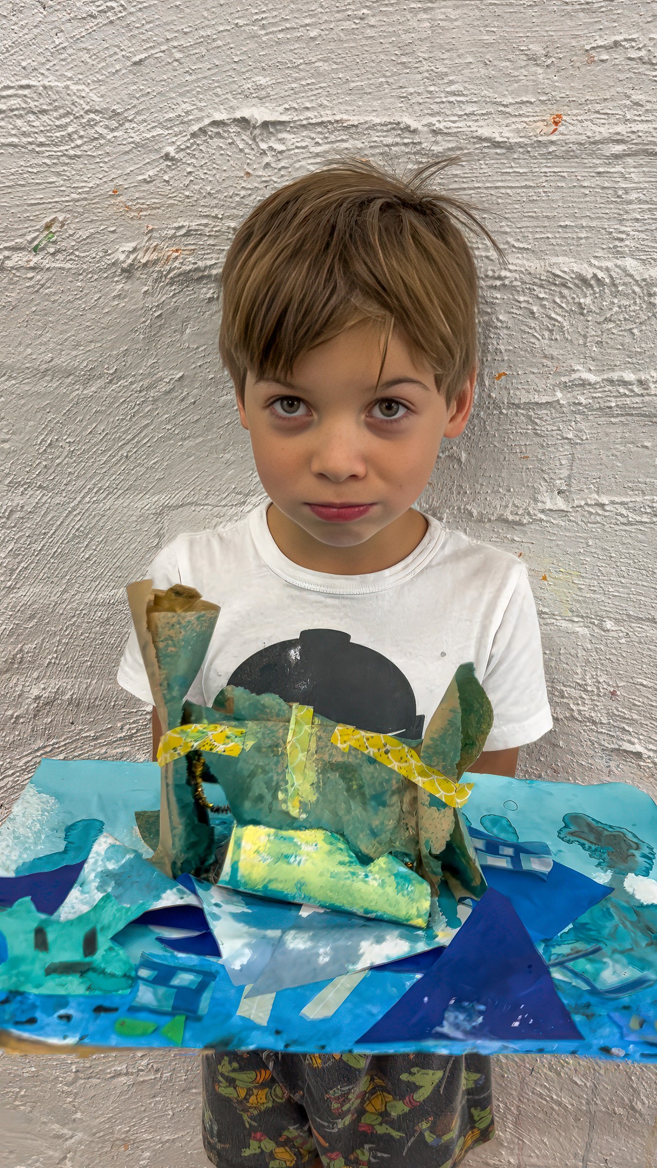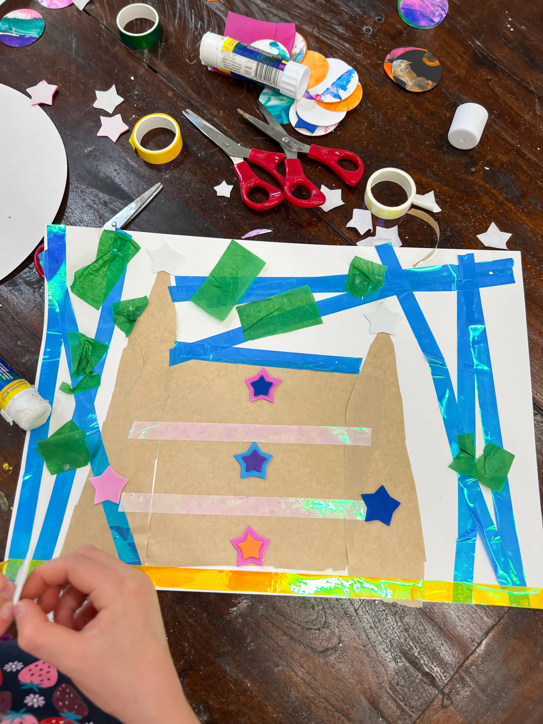 This is sandcastle building without the sand in your shoes. Gather a pile of textured, recycled and shiny bits that feel like the beach. Brown kraft wrap, honeycomb packing paper, repurposed painted scraps, blue cellophane for water, foil and shiny stickers for treasure. Add scissors, glue, washi tape and plenty of flat space to spread and layer.
