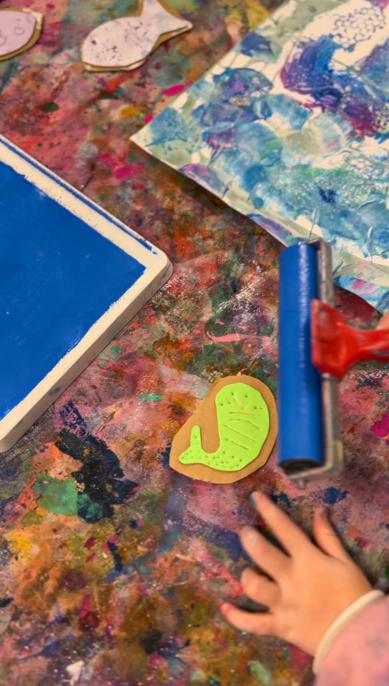 Block printing ink only needs a small amount. Drop a blob into the tray, spread it with a palette knife, and roll until the brayer feels smooth and even. Kids always notice the sticky squeak! It becomes part of the experience.