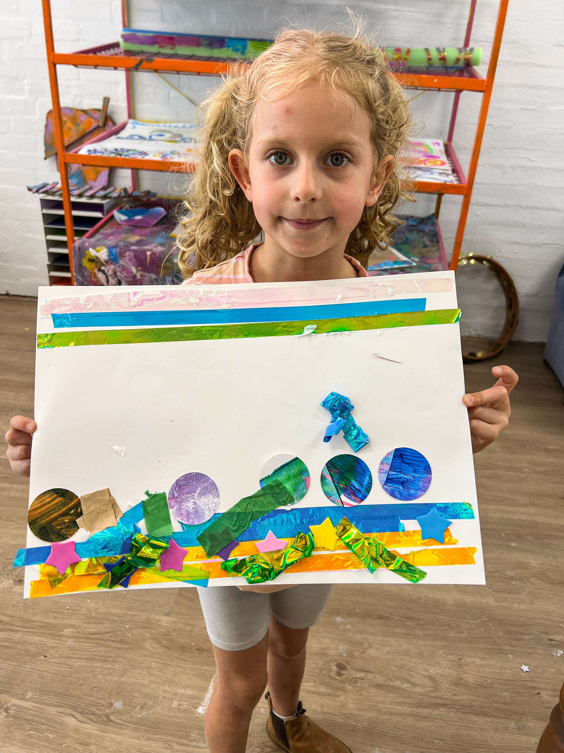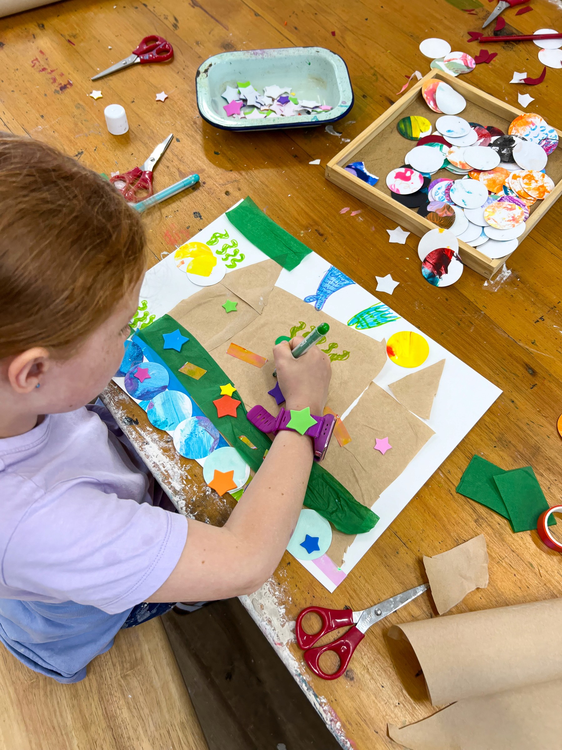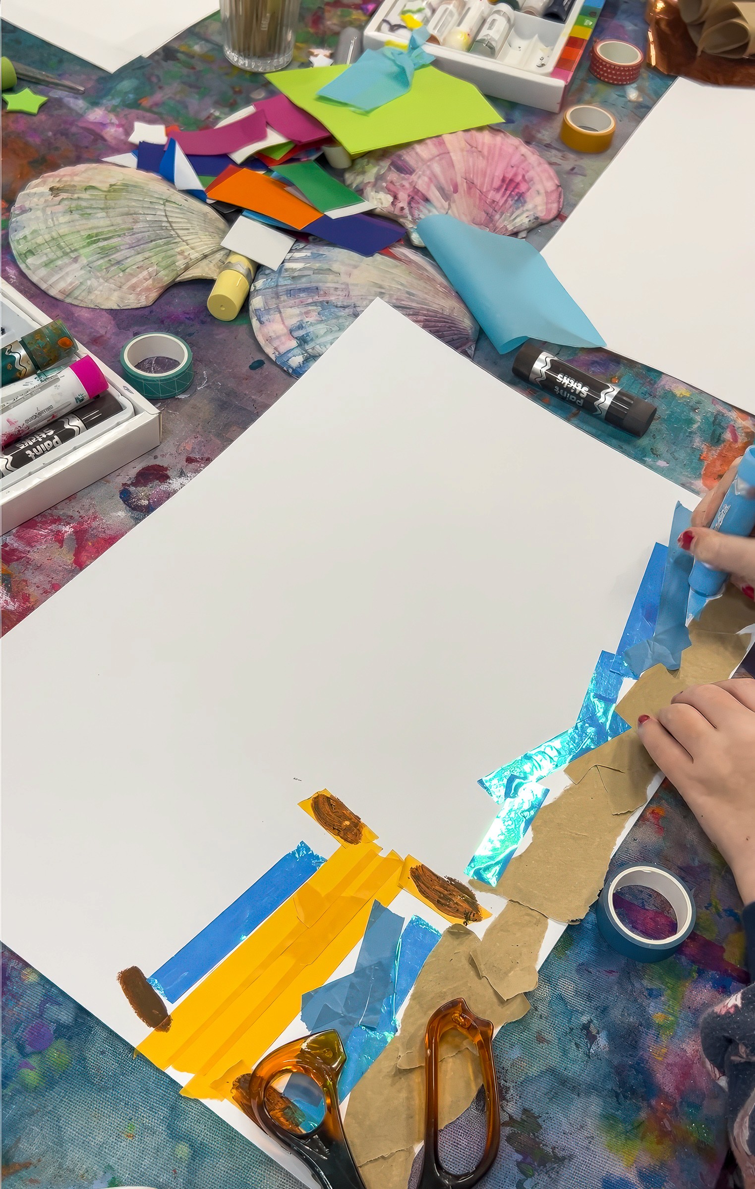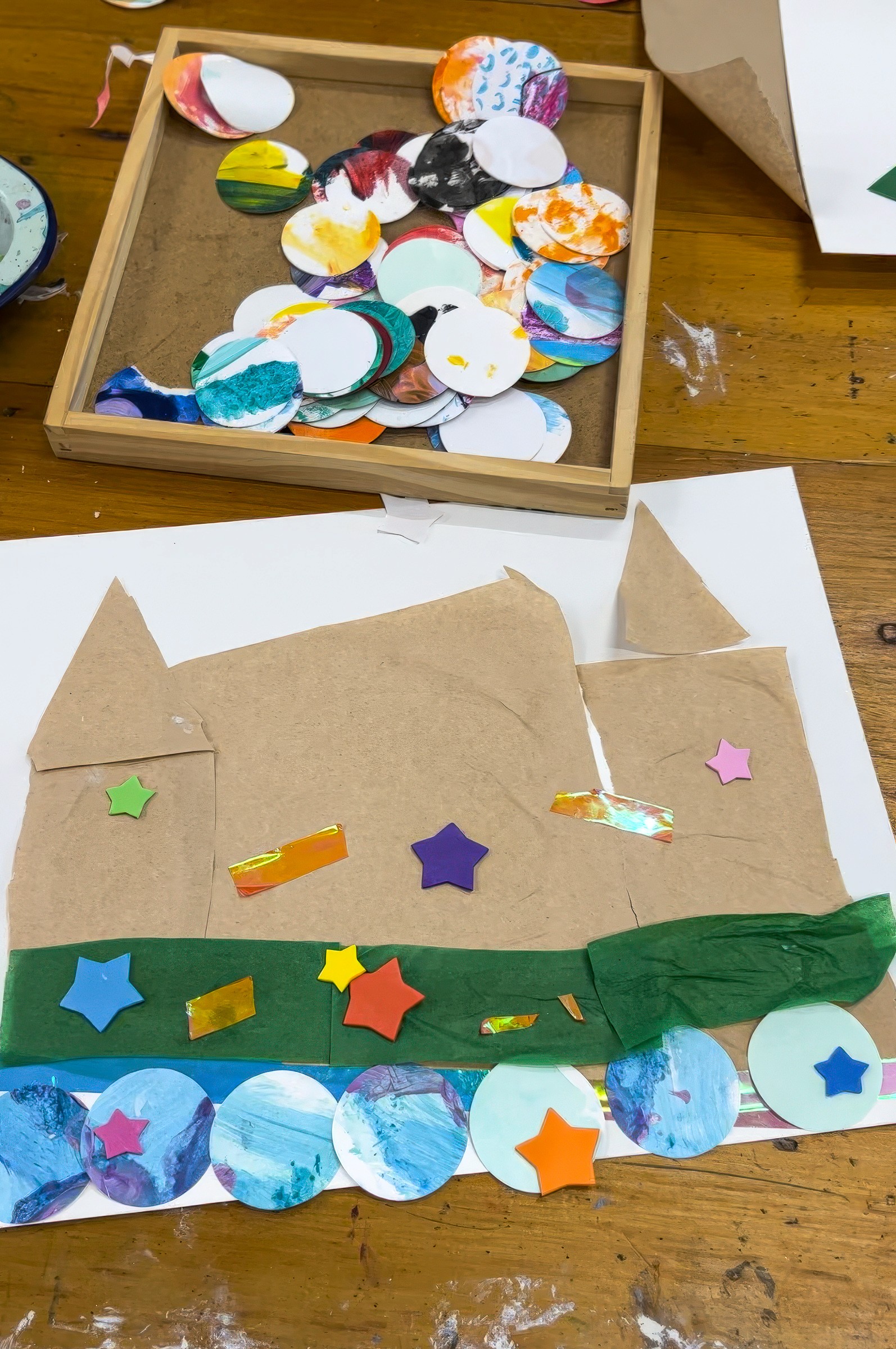 Children might stack scraps into towers, tuck treasures underneath layers, or sprawl their castles wide across the whole page. Others might build moats, rockpools, or tiny hidden rooms. The magic is in letting the collage take its own shape.
