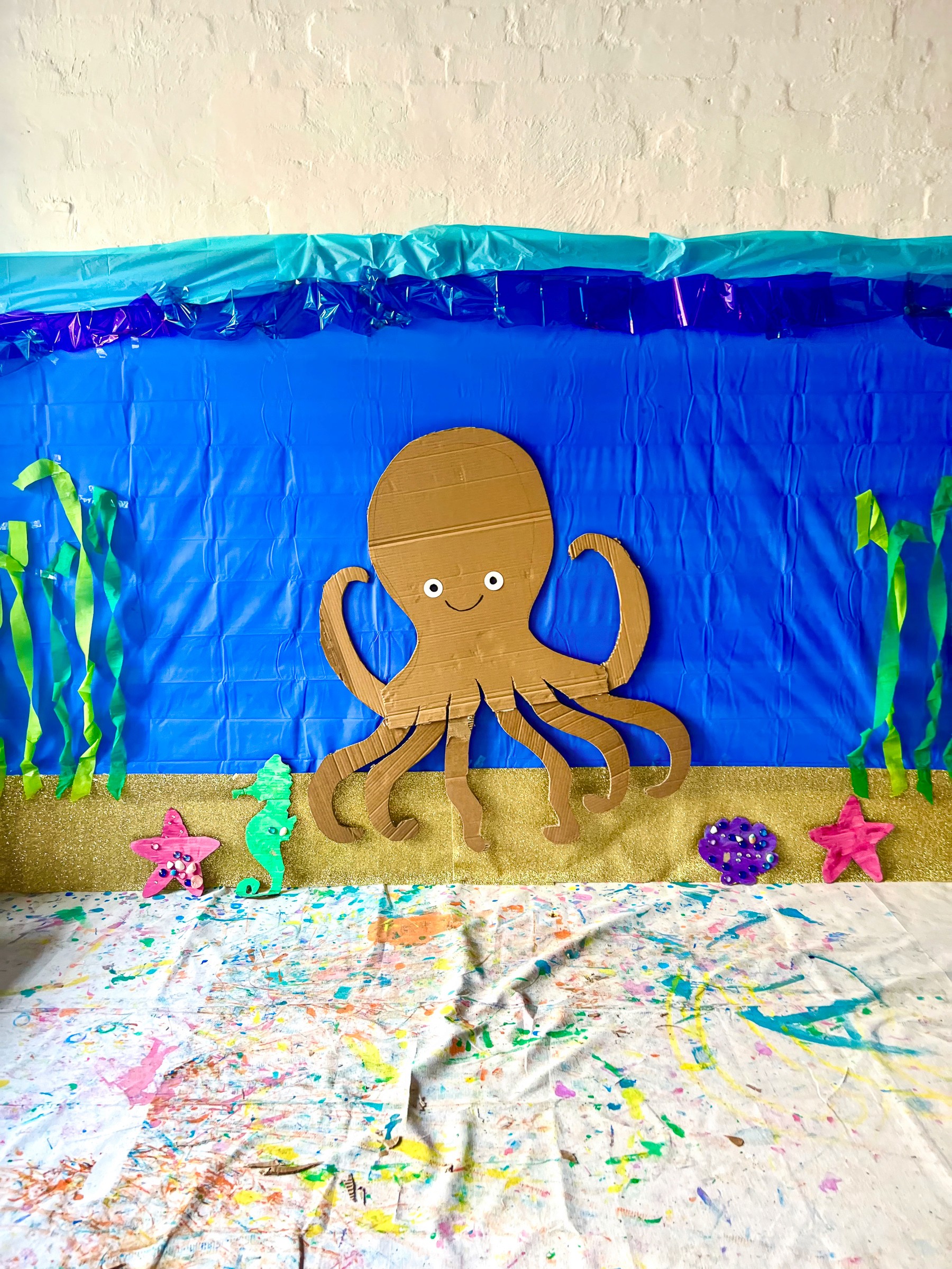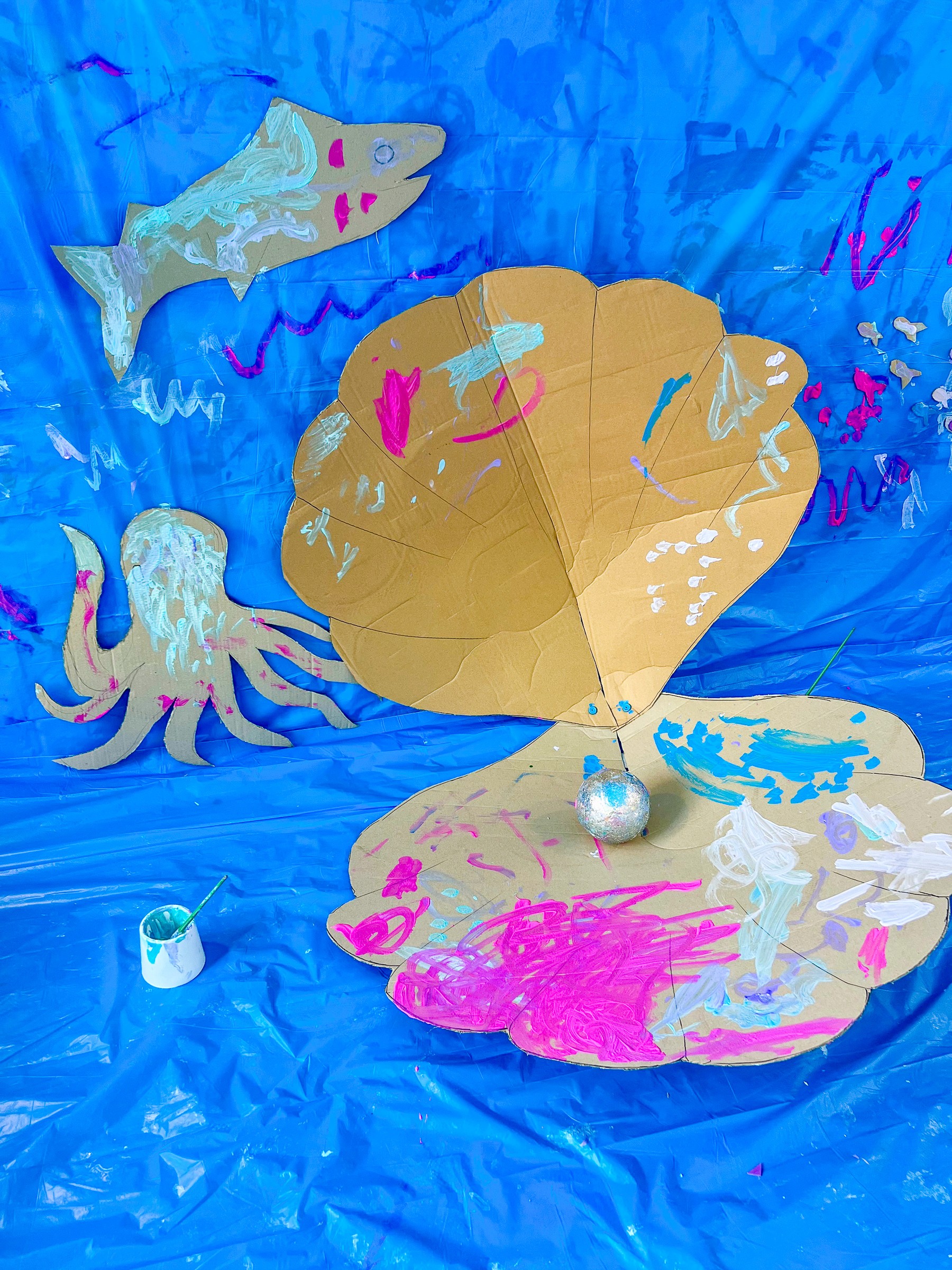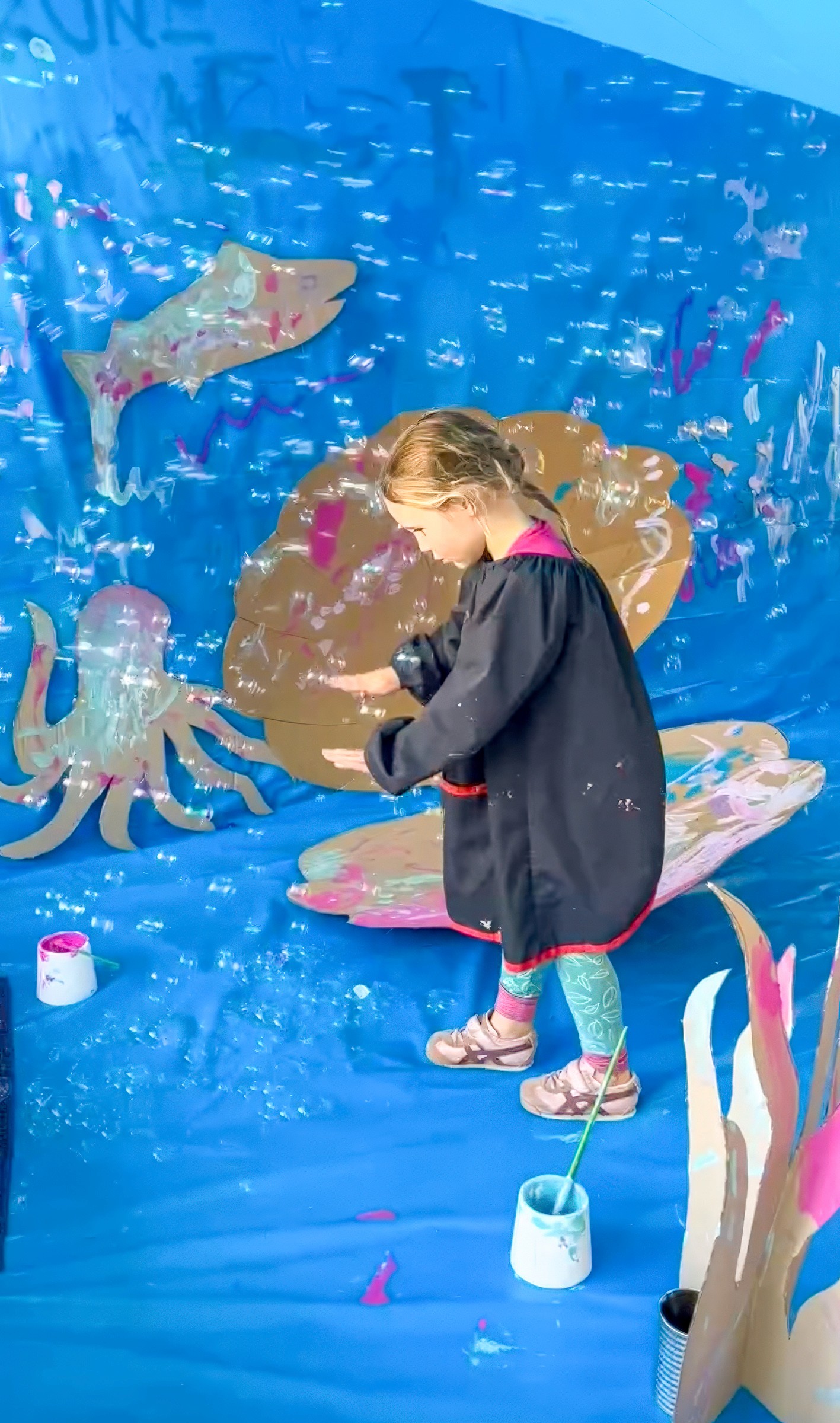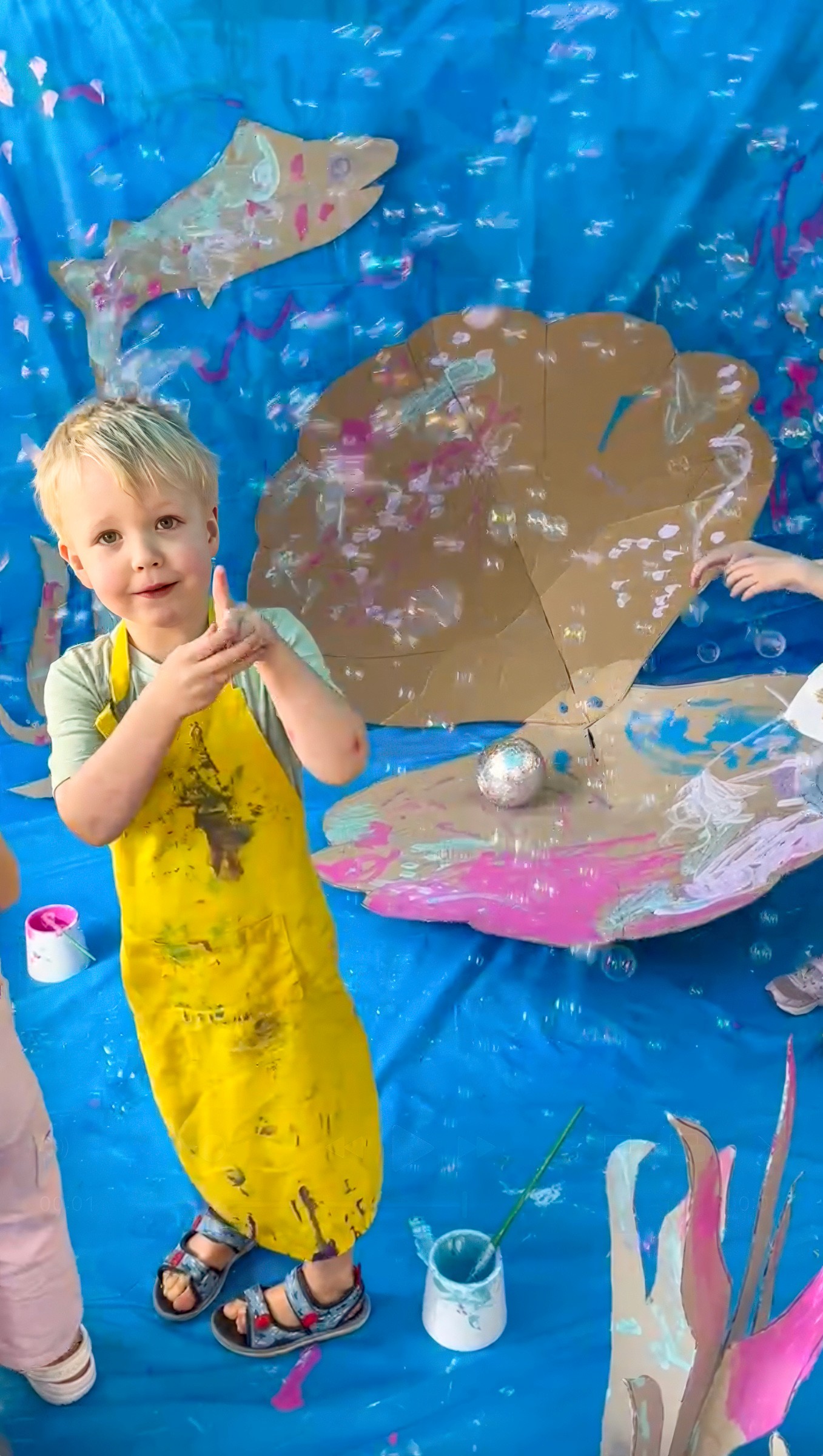Once the paint is out, the ocean builds itself. Shapes and creatures appear quickly, and the cardboard disappears under layers of colour. Keep the energy loose and collaborative so the whole space grows together. And if you have a bubble machine handy, it is always a hit! Nothing feels more underwater than painting while bubbles float through the air.