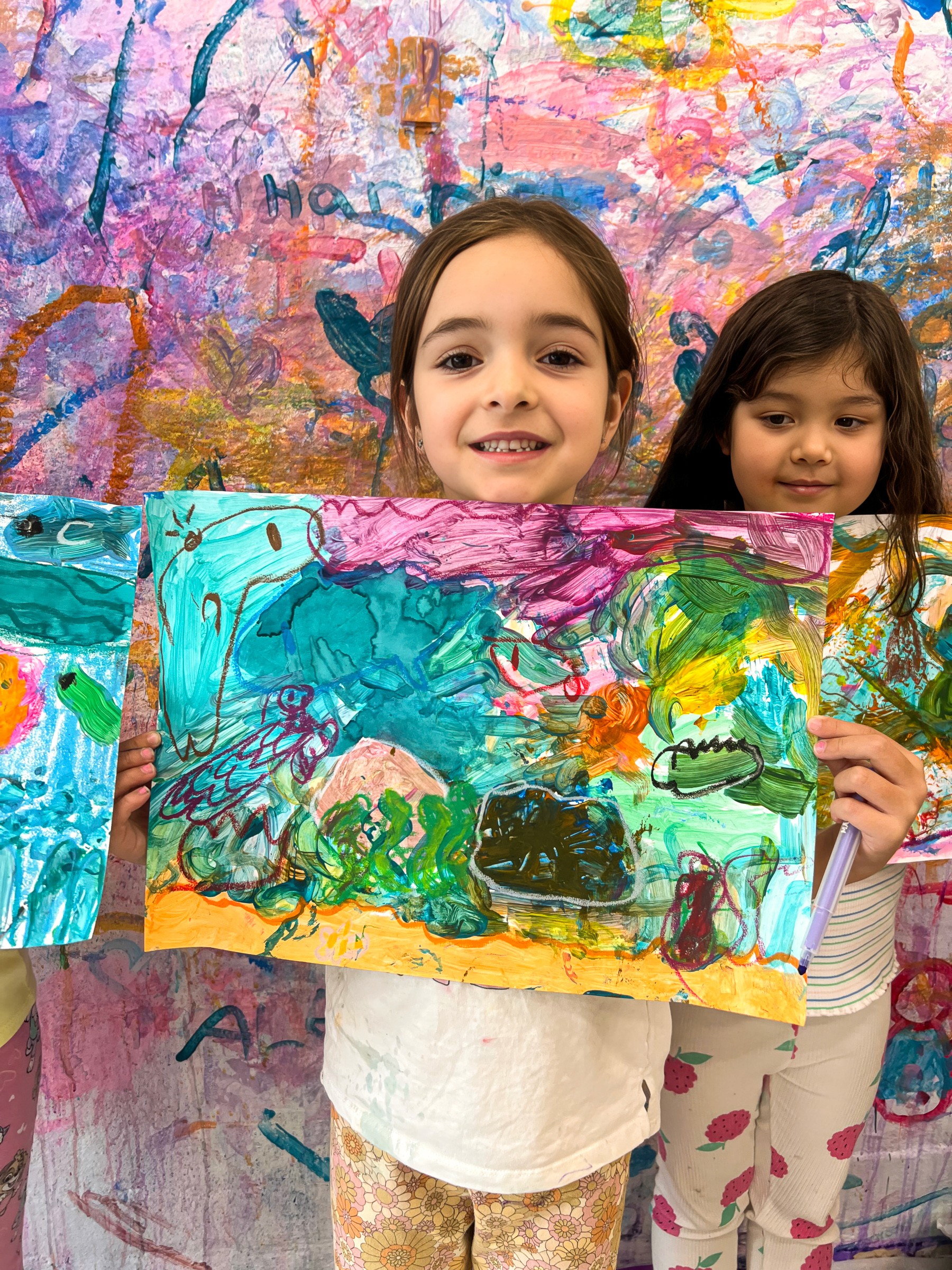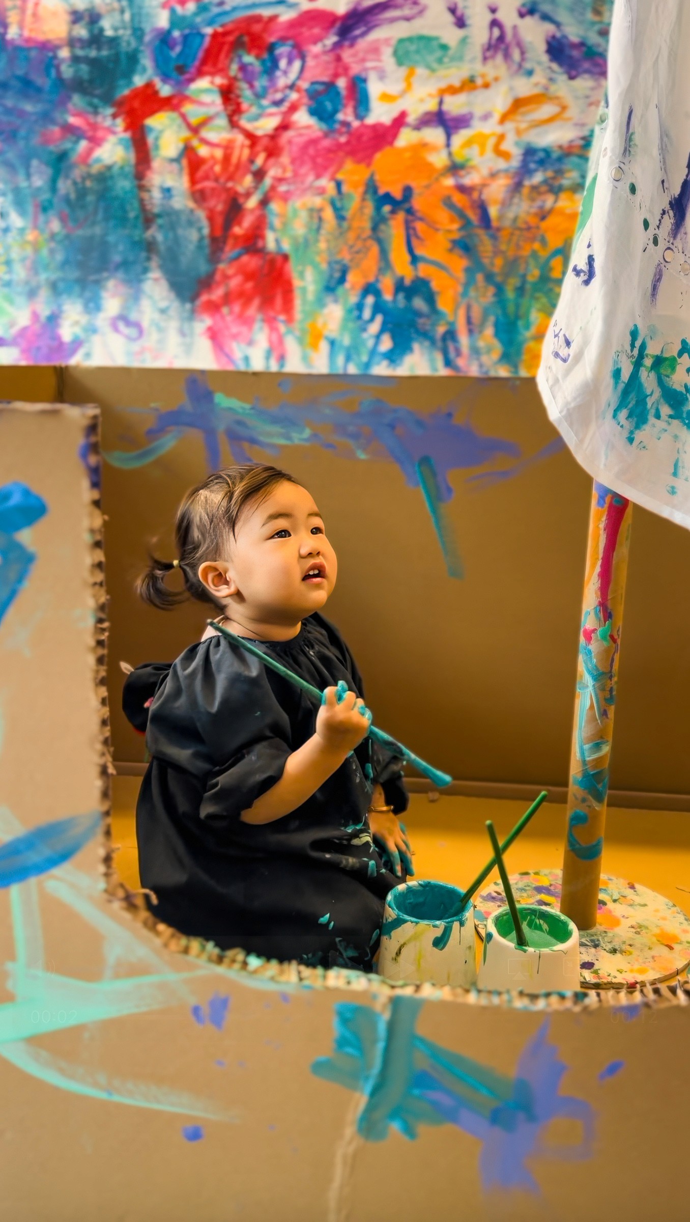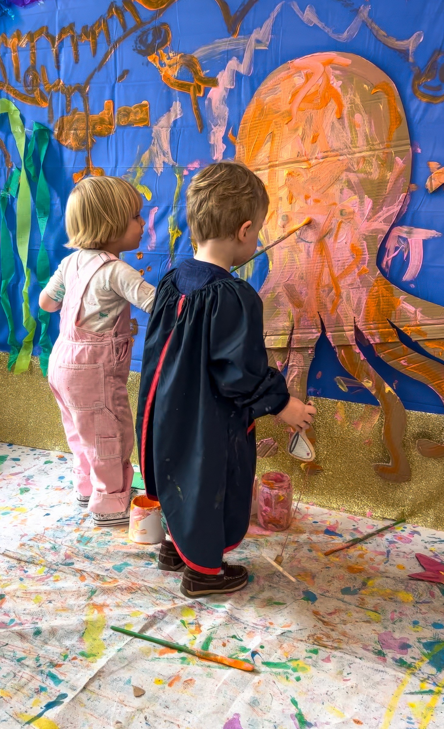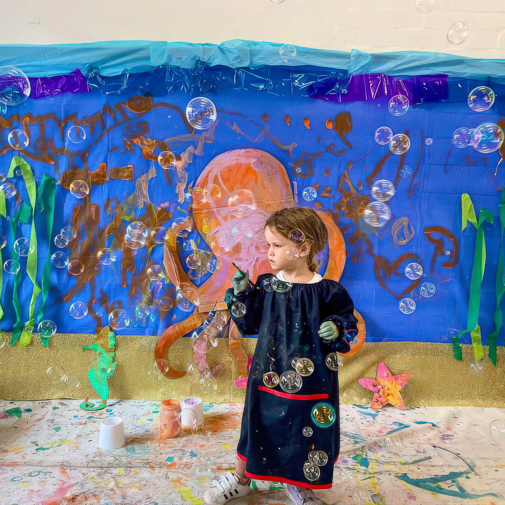 Once the paint is out, the ocean builds itself. Shapes and creatures appear quickly, and the cardboard disappears under layers of colour. Keep the energy loose and collaborative so the whole space grows together. And if you have a bubble machine handy, it is always a hit! Nothing feels more underwater than painting while bubbles float through the air.