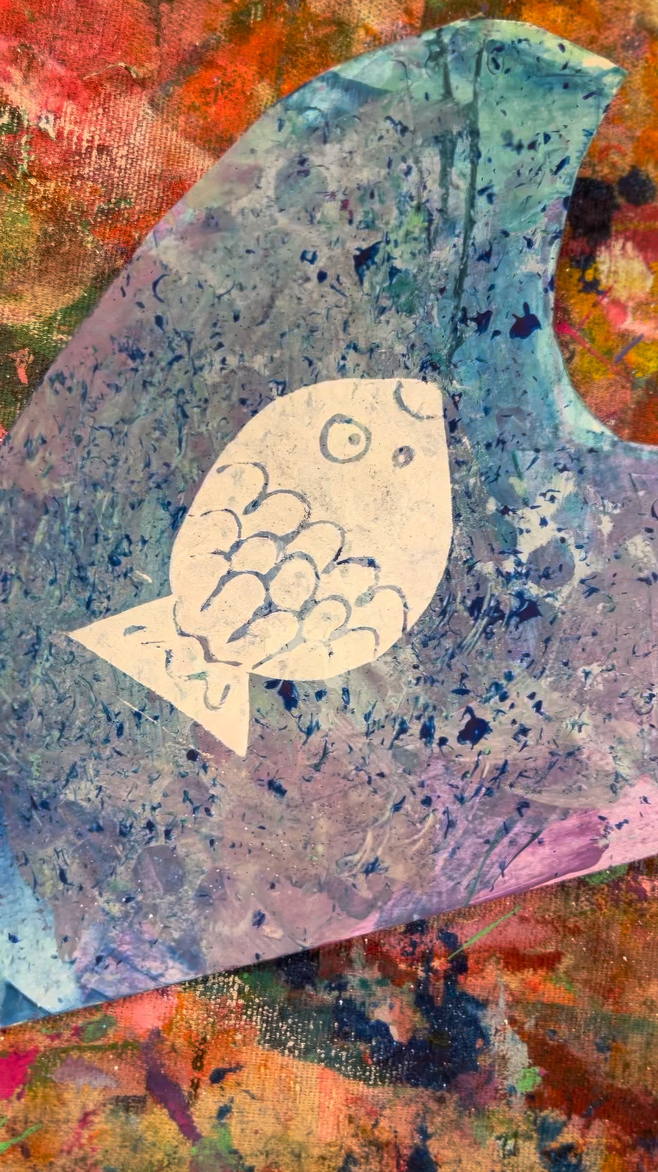 Start by drawing directly into the foam with a pencil or the end of a brush. Fish, shells, coral, waves — any design works. Press firmly enough so the grooves show clearly. If you are using sticky-backed foam, press it onto a block of wood or cardboard to make it easier to print and share.