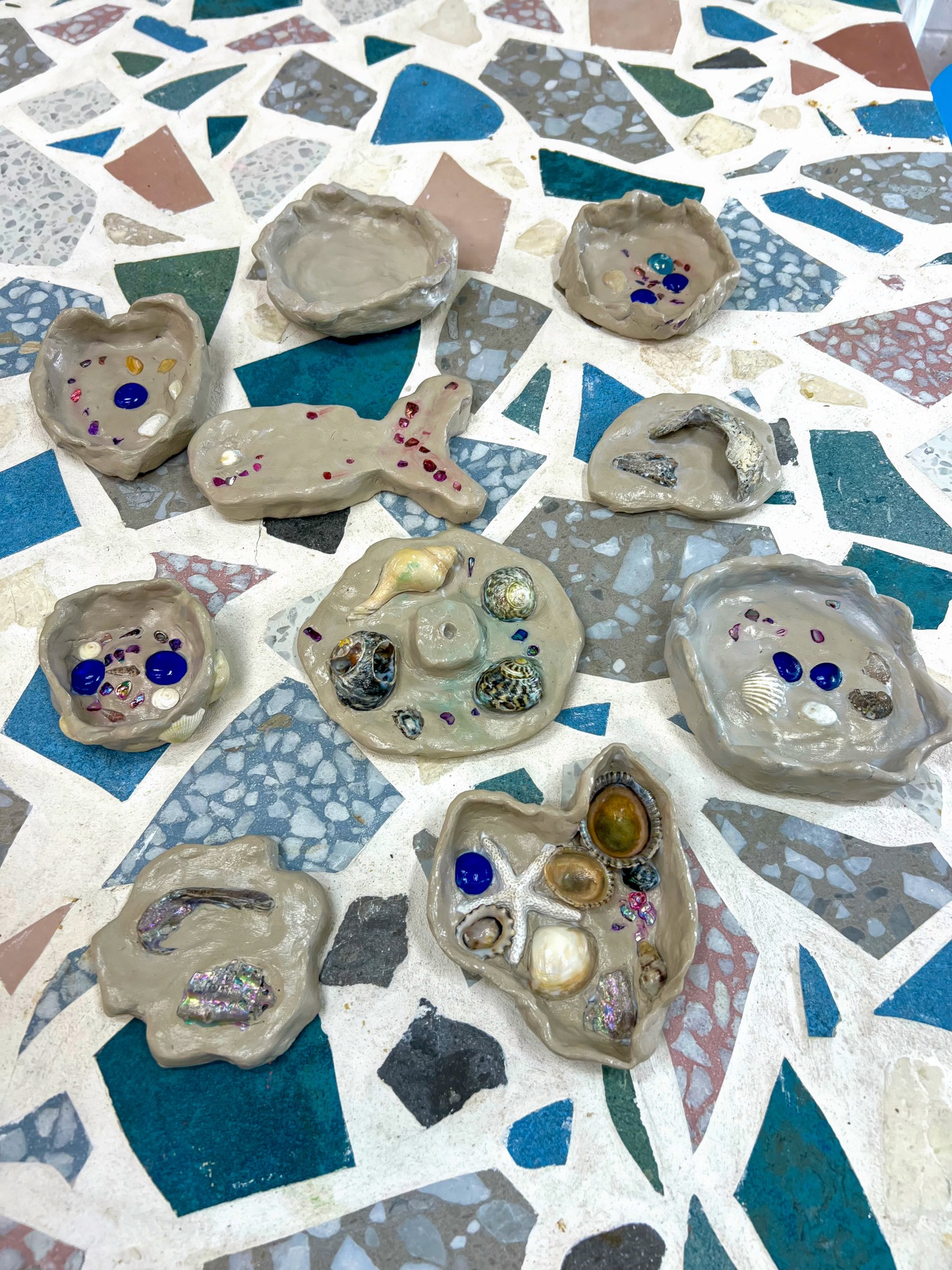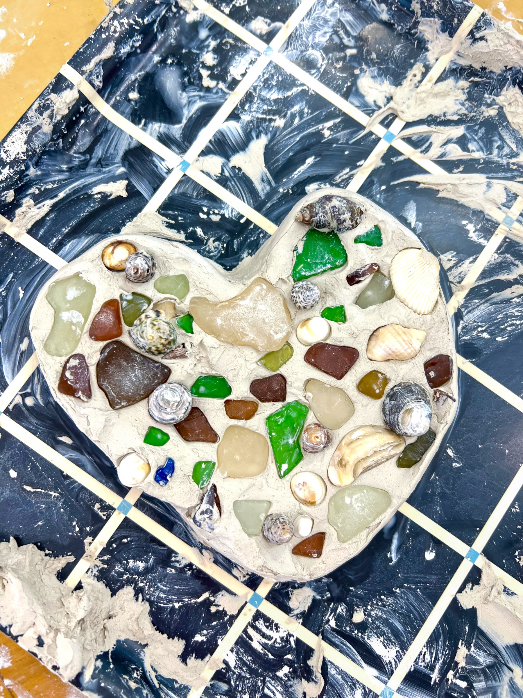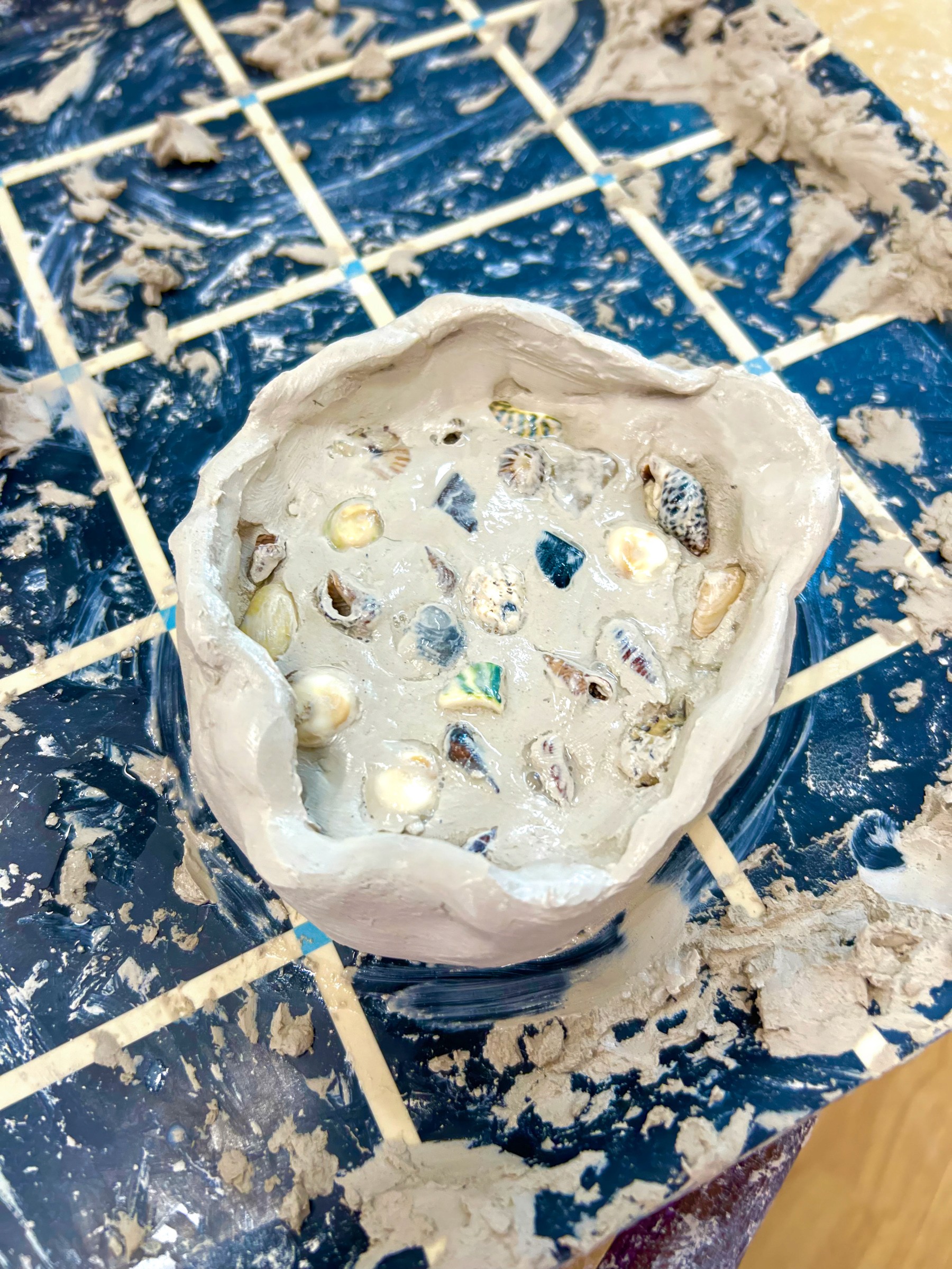 Begin by kneading or “throwing” the clay against the table to warm it up. This makes it easier to shape. Then build! We’ve seen coral reef trays, clam shells, bowls, and abstract ocean forms. The magic comes when kids press their chosen treasures into the clay, embedding them as permanent memories.