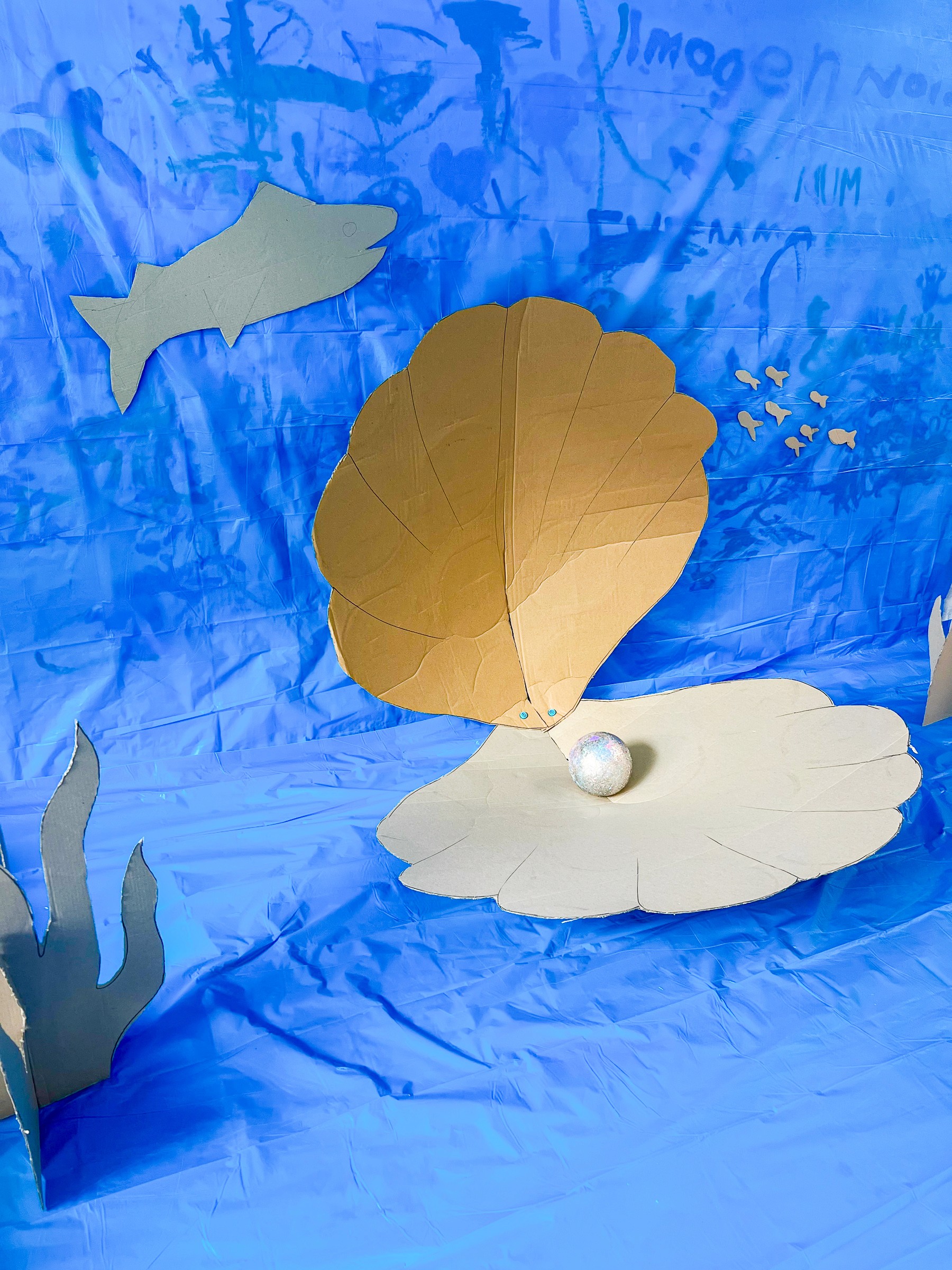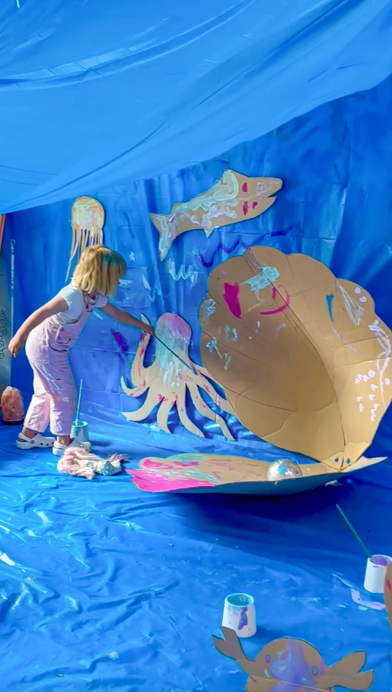 But it doesn’t always have to be big and elaborate. A corner of blue fabric outdoors, a school of painted fish taped to the wall or a patch of bubble wrap “seaweed” to step on. Really anything that makes you feel like you’ve slipped under the surface works beautifully. The key is openness. Let the setup suggest the sea, and then let the kids take it wherever they want to go.