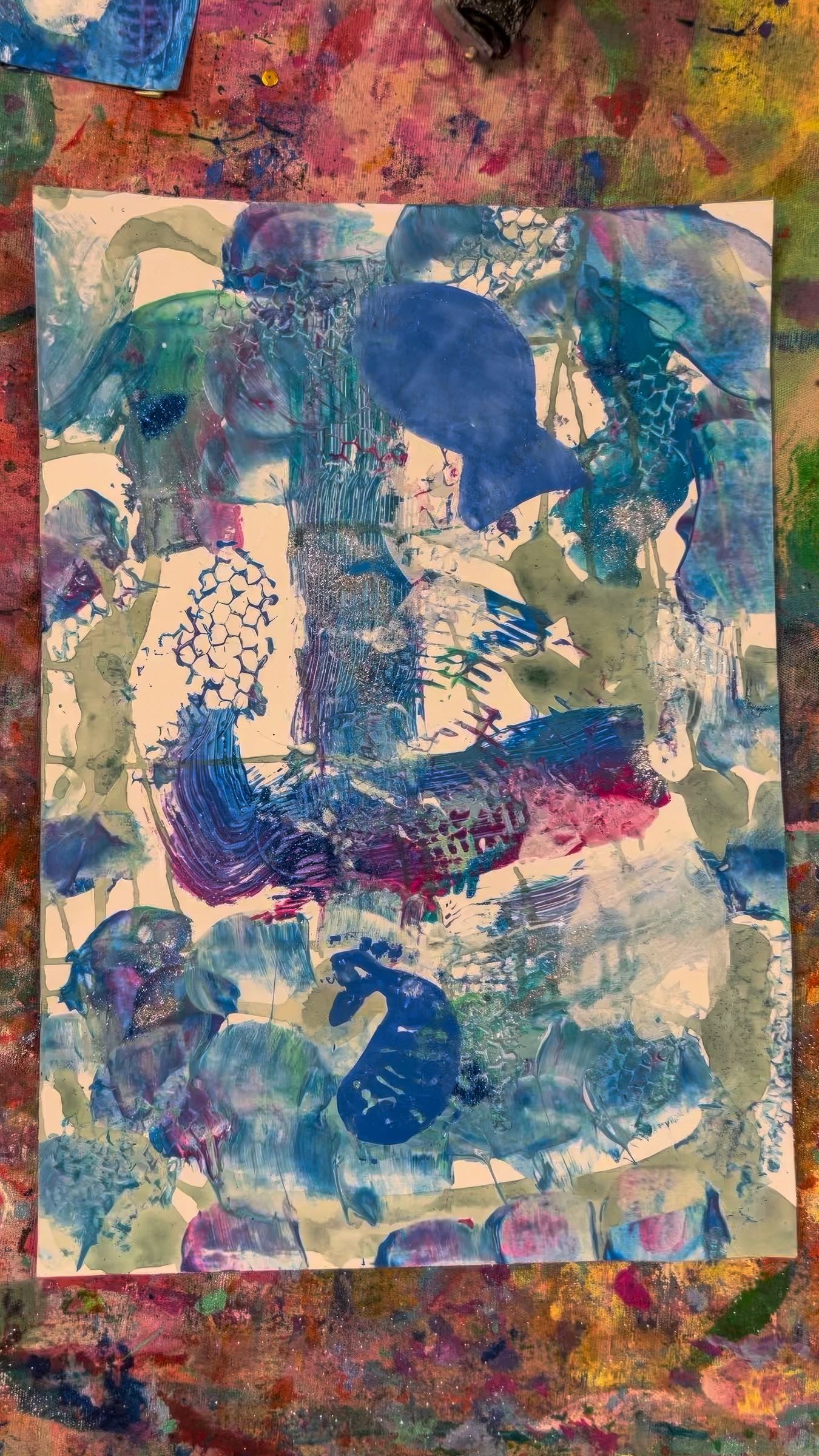 Blue and white inks look brilliant when printed onto textured “ocean paper” from earlier painting explorations!
