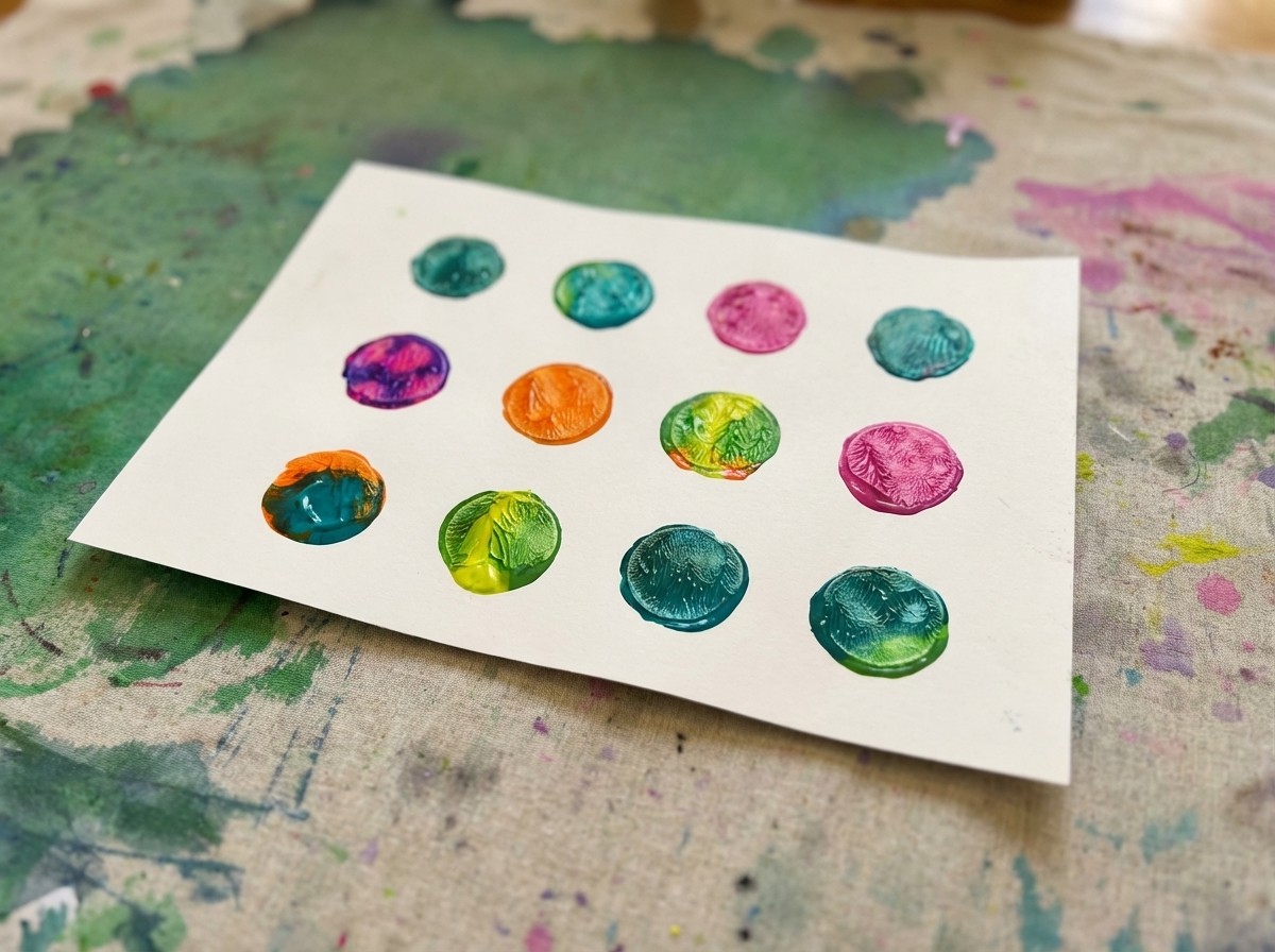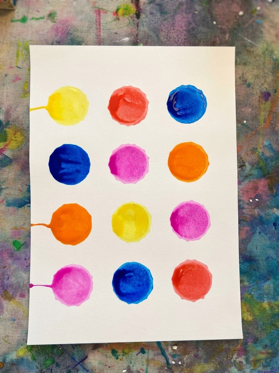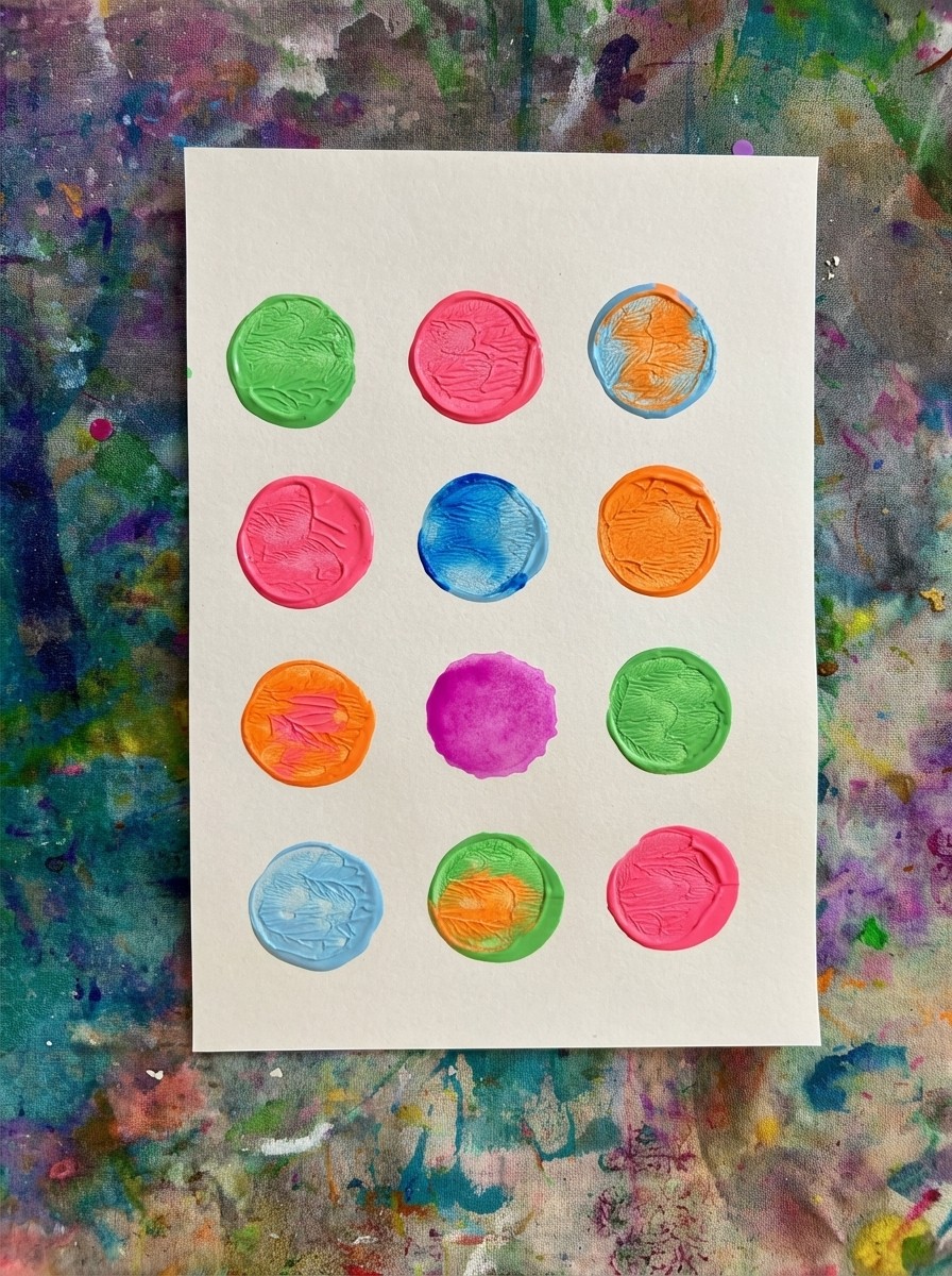 Load up the circles with brushes, sponges, rollers, or fingertips. Paint can stay neatly separated or be mixed straight on the tray. Both work beautifully, and watching the colours swirl and meet is half the joy.
