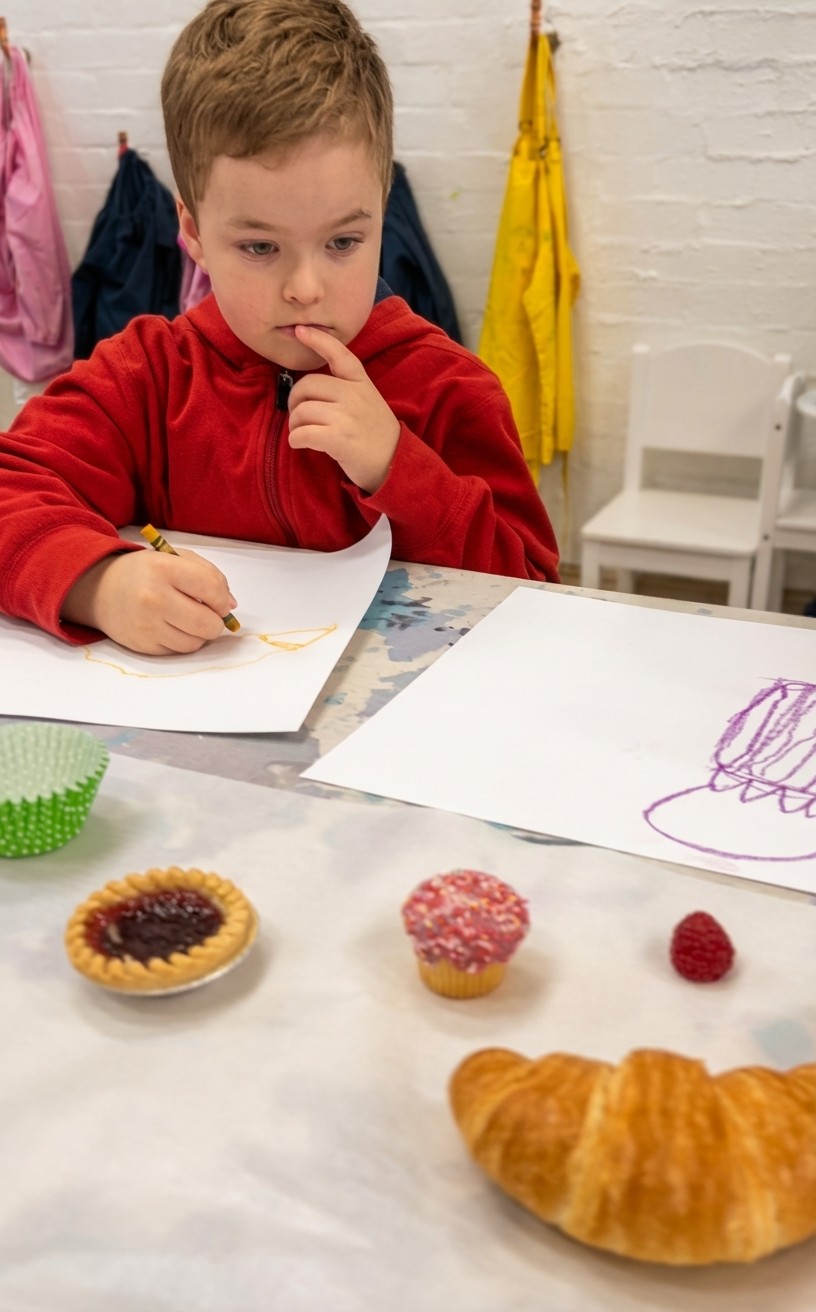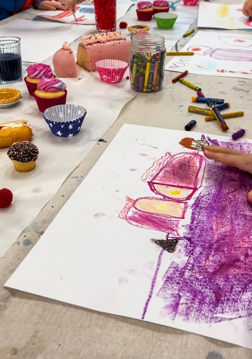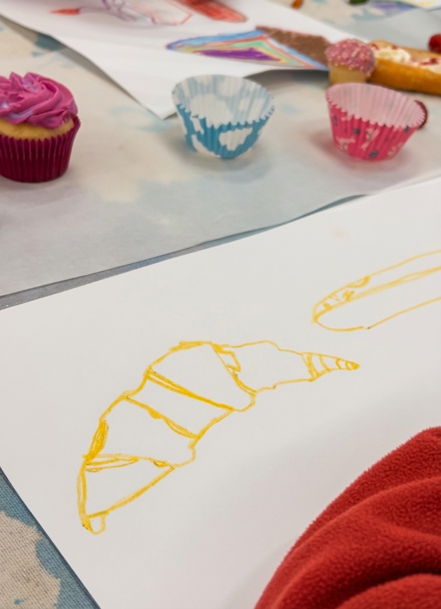 Sweet Treat Still Life days at Smudge are always a bit special! Set up the still life like you’re styling a table you’d actually love to sit at. Cake stands, plates, boxes, stacked boards. Different heights really make all the difference, and try to leave a little breathing room between each treat (especially for younger kids) so that it's a bit simpler to see the form and shapes.