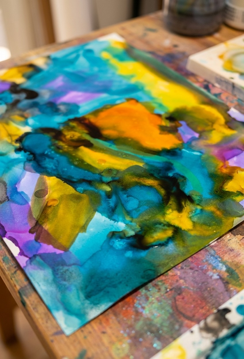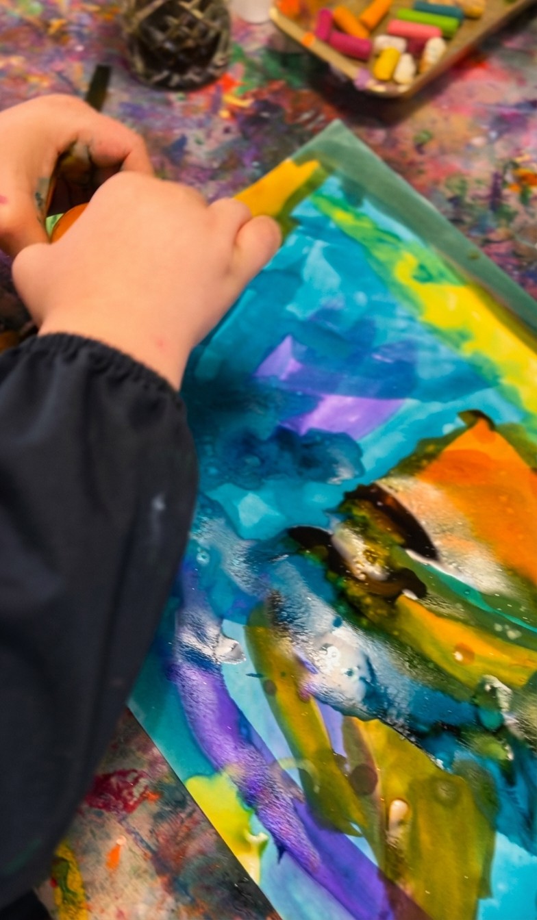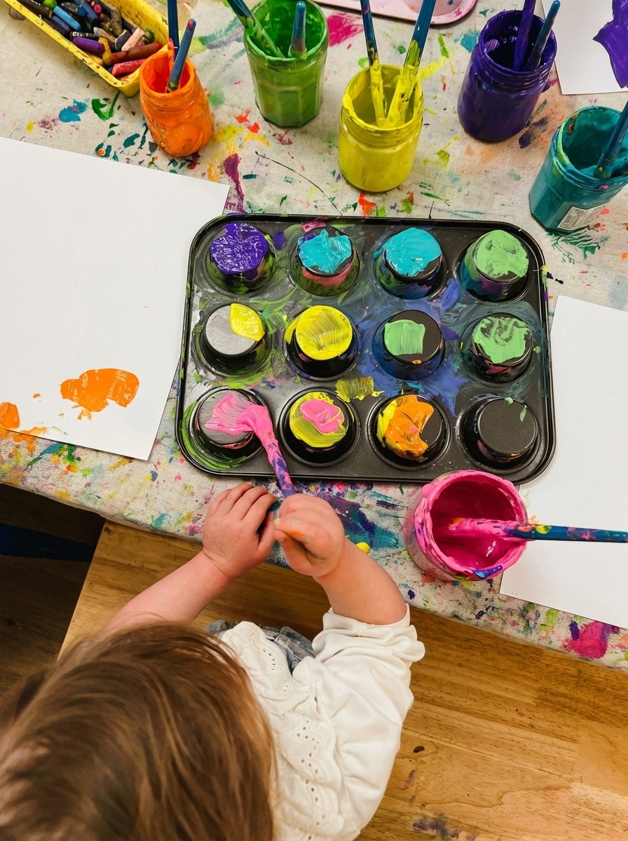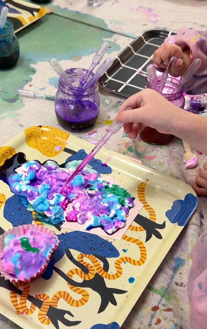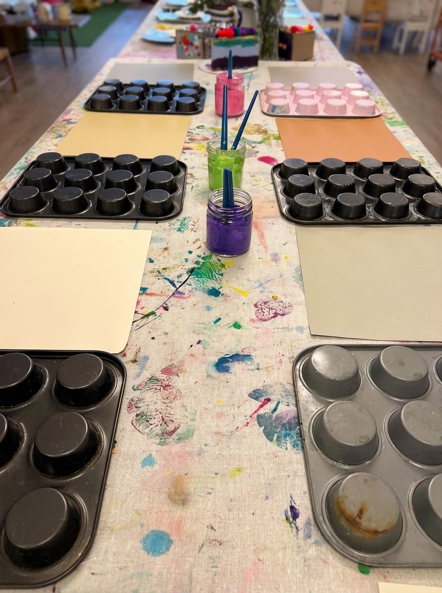 Using actual baking tools in art always feels right! The set-up is simple and familiar, which frees everyone up to focus on colour mixing and play rather than instructions.