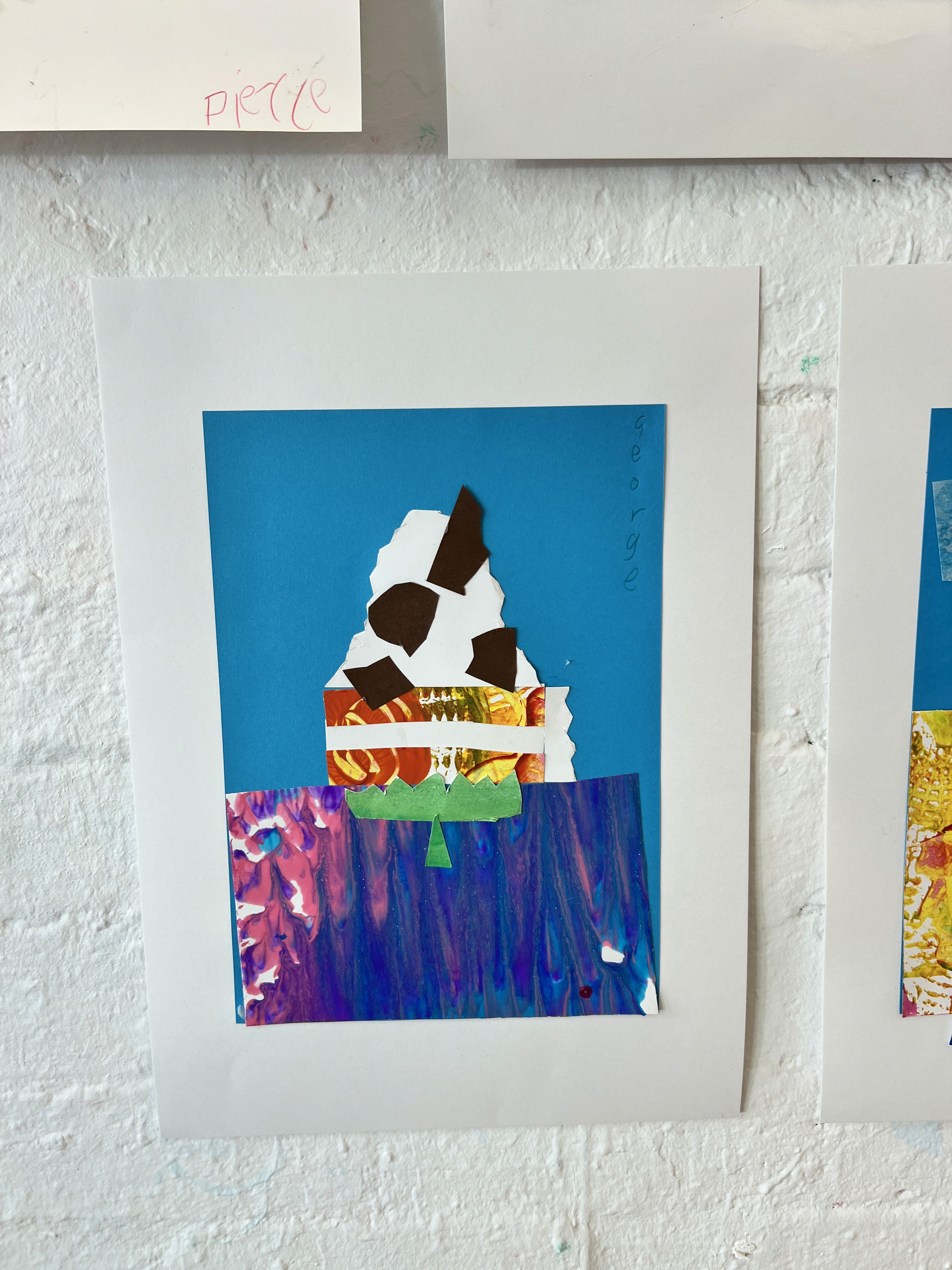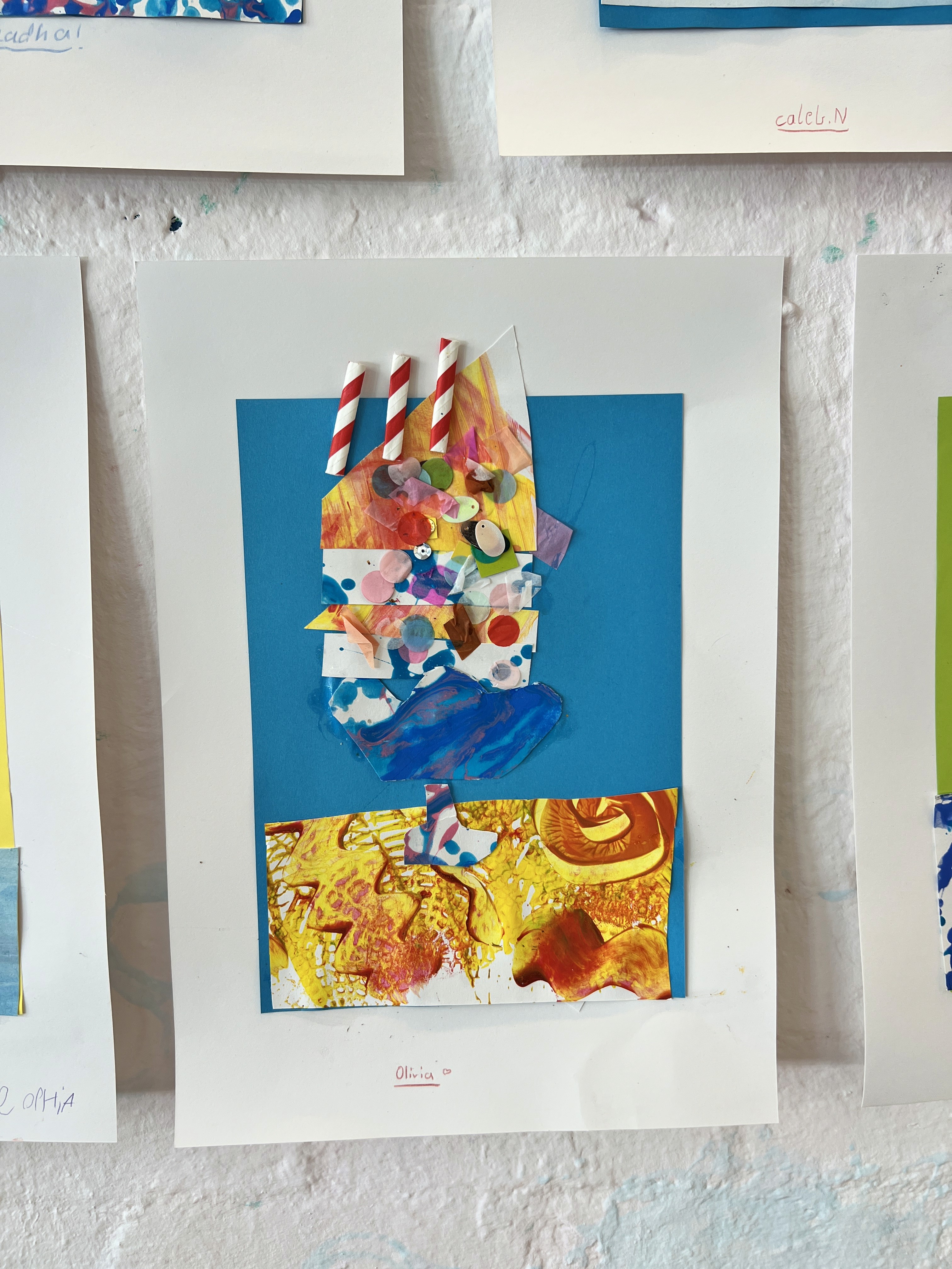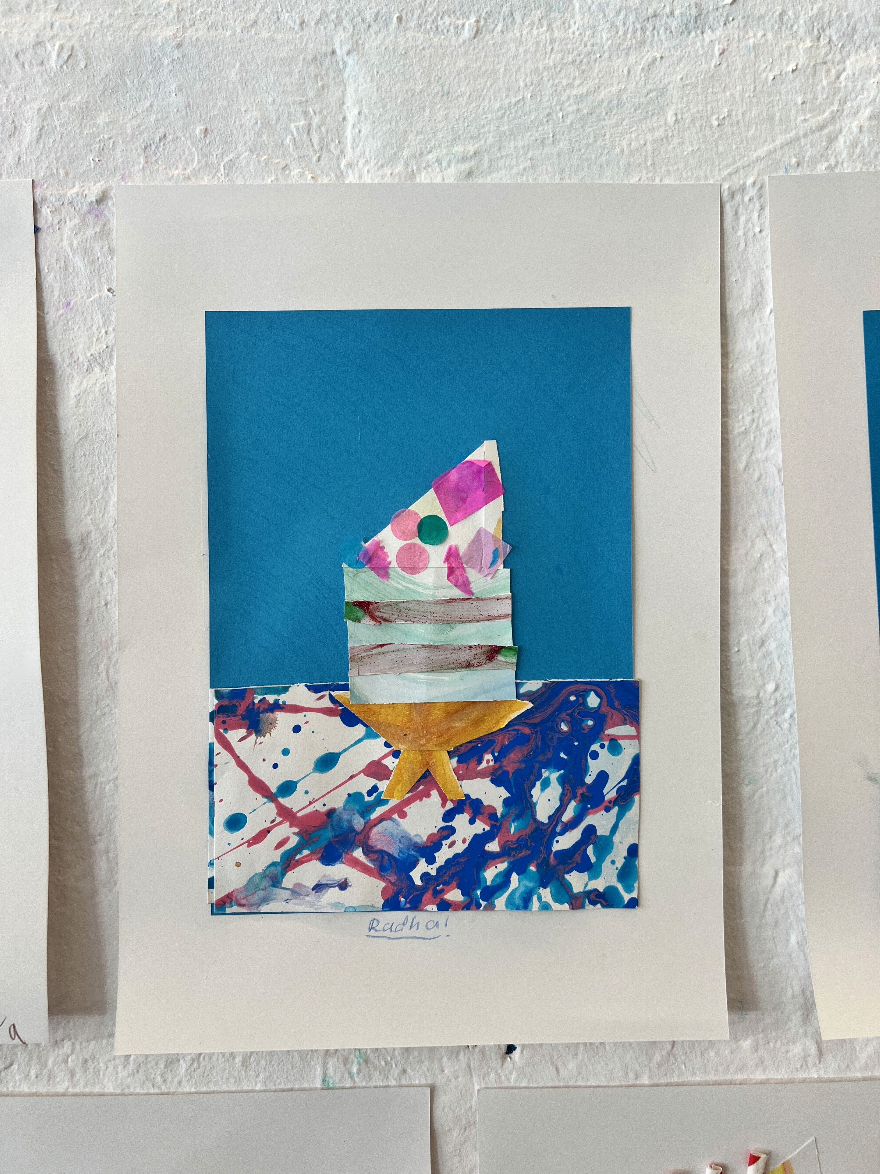 This is a hands-first process! Start by experimenting with tearing paper rather than cutting it. Ripping creates edges that feel softer and more cake-like, and it keeps the work loose from the start. Thick tears and thin strips and curved edges and accidental shapes! It's also lovely to chat about colour choices, and contrasting patterns. If you're able to take a look at Alice's work, you'll no doubt be struck by how gorgeous her colour choices are! She's a colour wiz for sure.