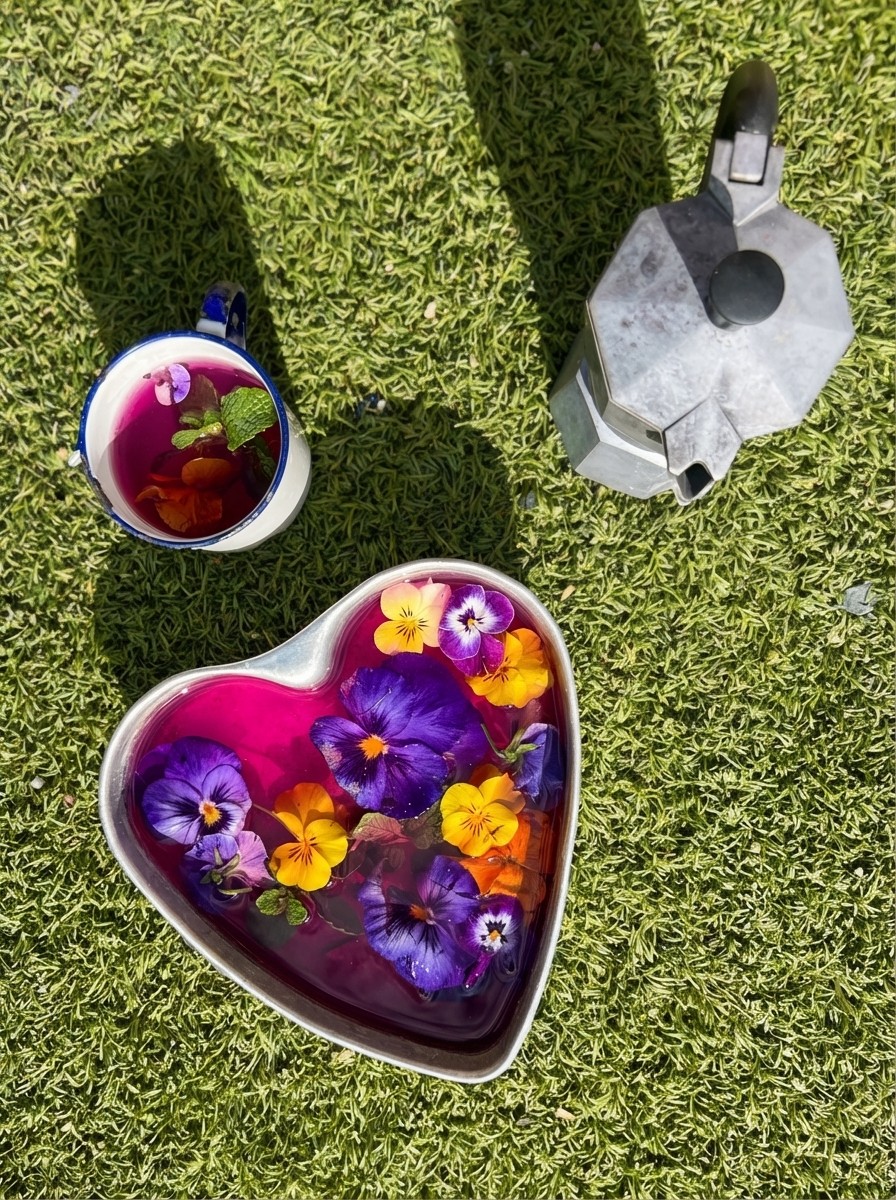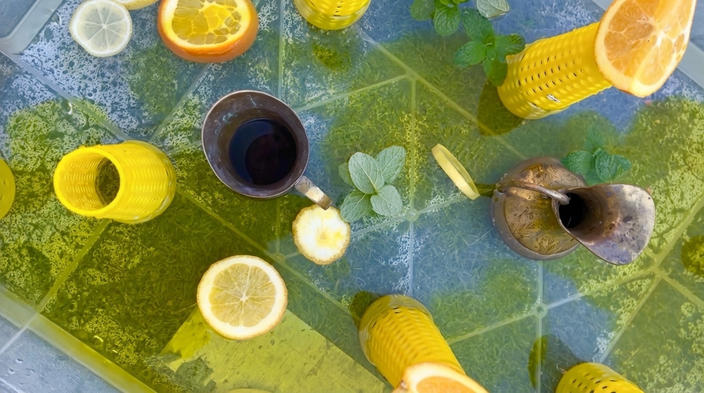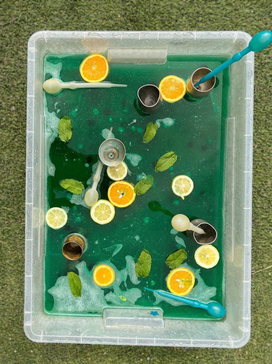 Fill tubs, bowls, or jugs with water and add a few drops of yellow or orange liquid watercolour, letting it drift before stirring. Float in slices of lemon and orange, then add fresh mint. I can smell it from here!