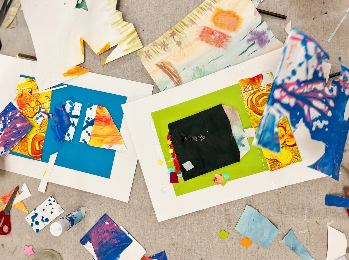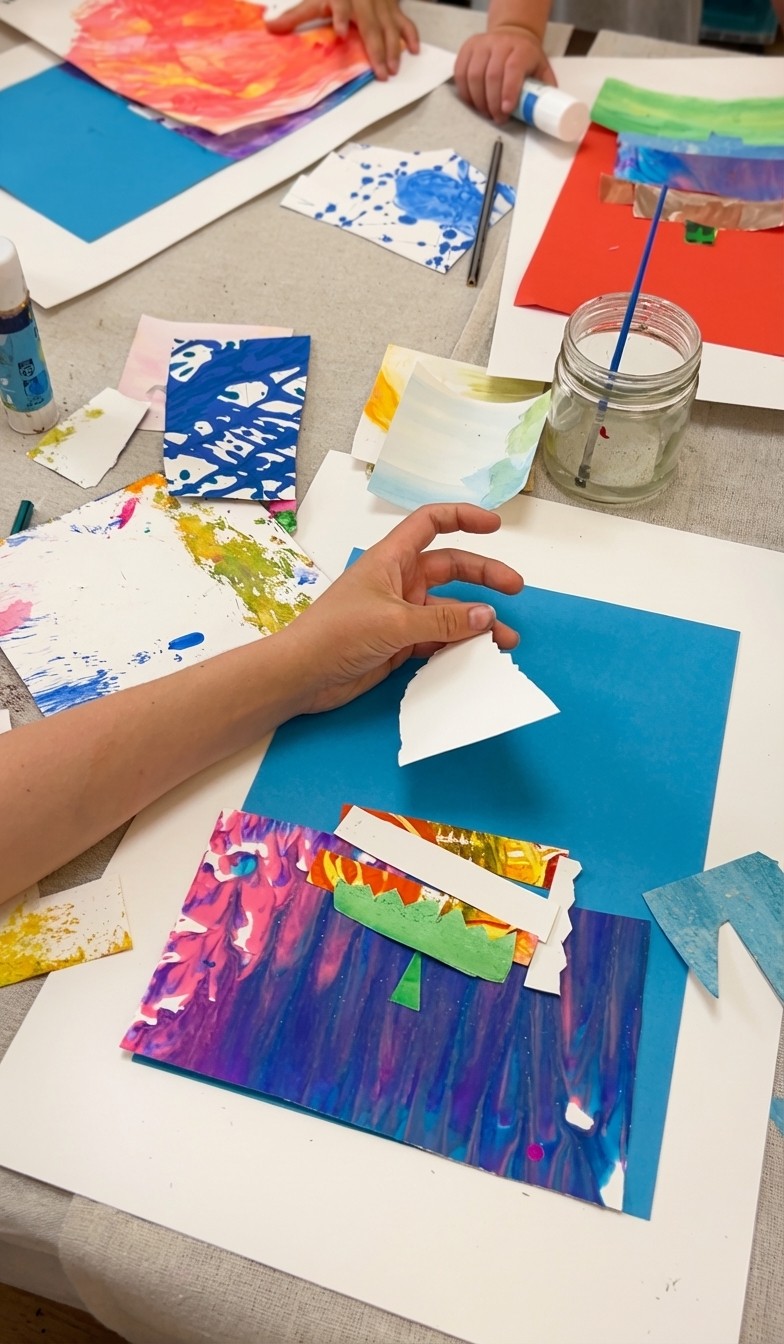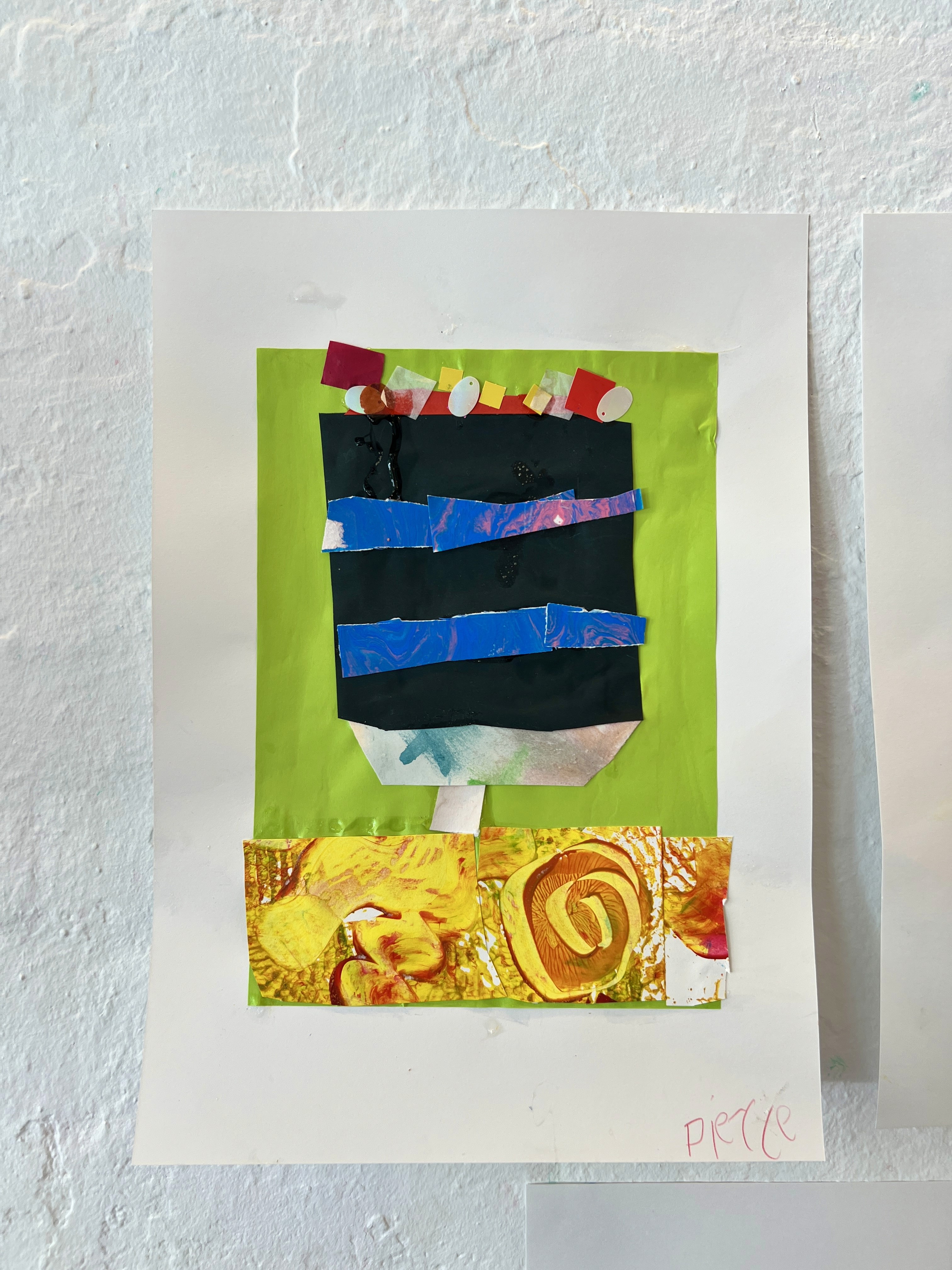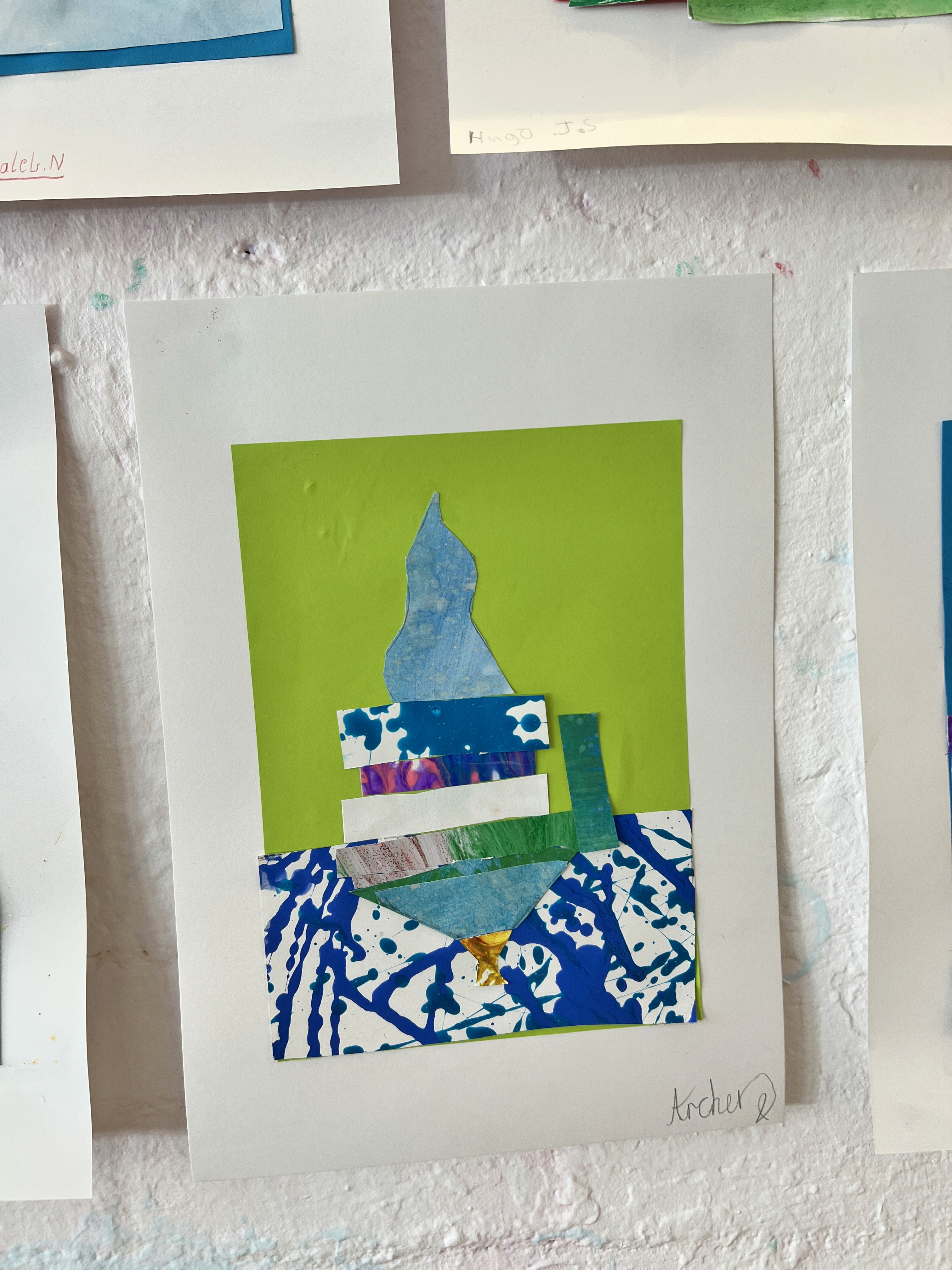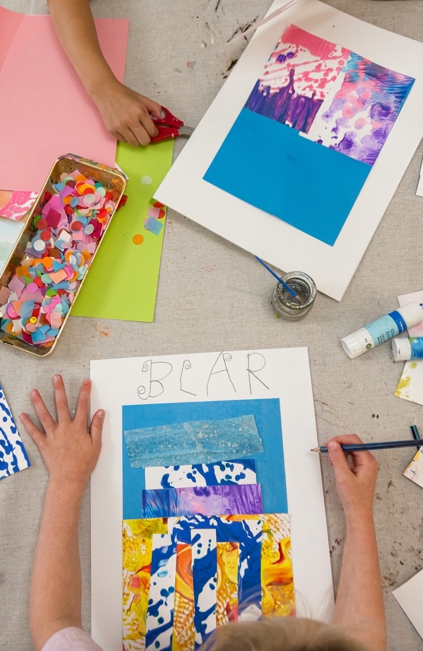 This is the perfect place to repurpose old paintings and scraps, or to prepare a pile of painted collage papers ahead of time. Think texture and mark making rather than neat shapes. If time is tight, paint sticks work beautifully because the paper dries instantly and can be used straight away. The best!
