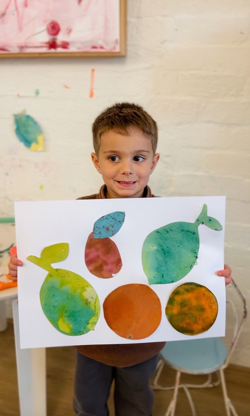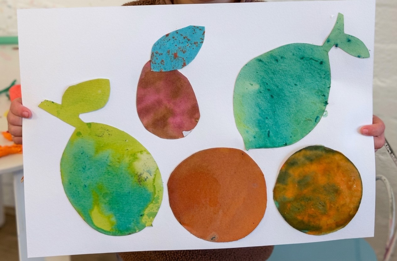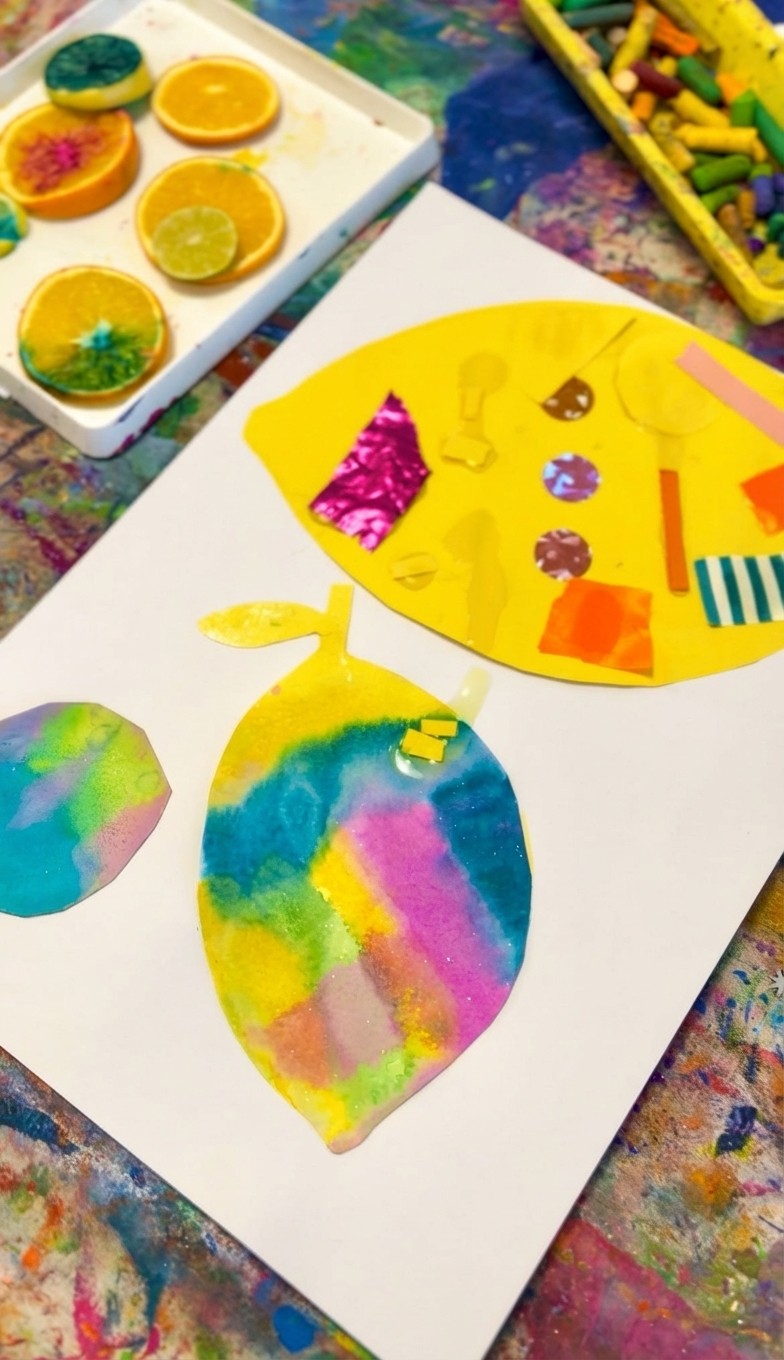 Pre-cutting the paper into citrus-y shapes for younger artists is helpful, or stick with the rectangular page for more open-ended creations.