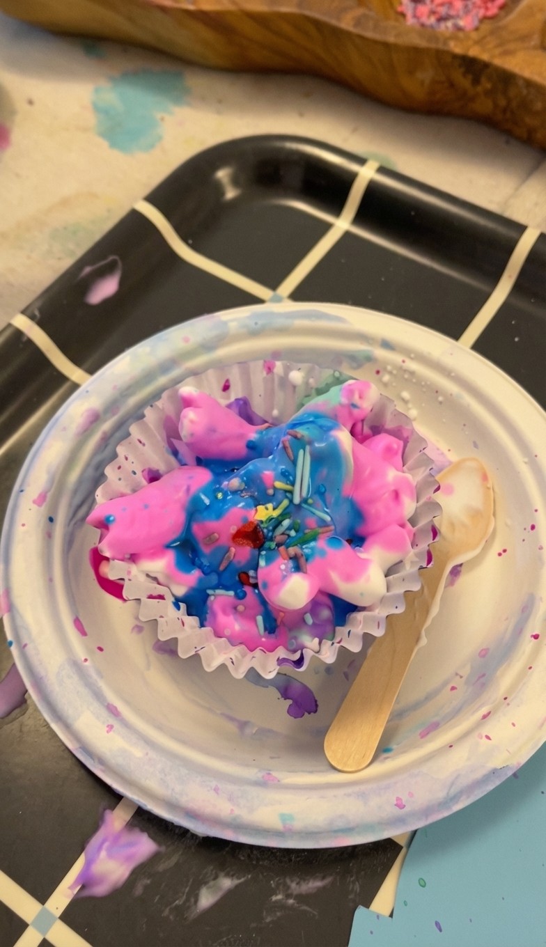 The other way is to build a foam-y cupcake. Place a patty pan directly onto the tray, fill it with shaving foam, and decorate it like you would a real cupcake. Drip liquid watercolour over the top, sprinkle on actual sprinkles (or sequins, sand, anything small and colourful), and swirl lightly. Once it looks good enough to eat, flip or squish it onto a paper cupcake shape, spread gently, then lift to reveal the print.
