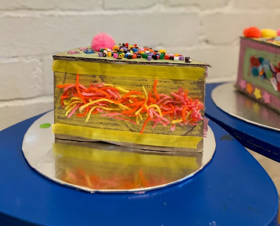 At the end, bring all the slices together to form one large shared cake. Then each artist can take their own (sculptural) slices to enjoy.