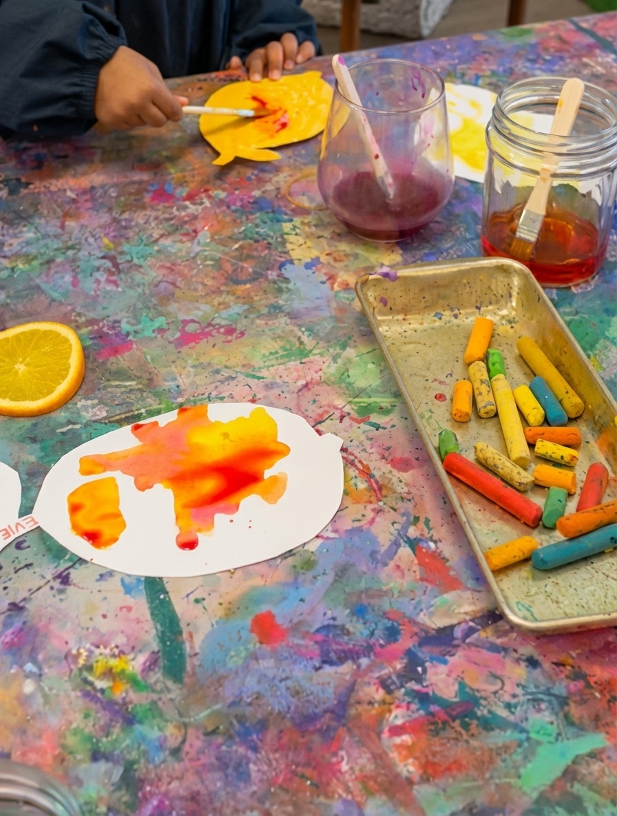 Bright citrus colours and simple tools are a match made in heaven! Cut some lemon and lime circles and wedges, and fill a small cup or two with juice. Thick watercolour paper is preferred, because the paper will inevitably get soaked with the gorgeous citrus-y liquid watercolours. Plus oil pastels and little droppers or pipettes add another layer of curiosity and fine-motor control.