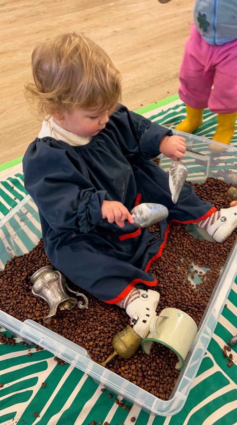 We source all the vessels from op shops. Teapots, jugs, goblets, tiny spoons. Old brass and tin pieces make it feel formal in a good way, like a tiny café setup rather than a sensory bin.