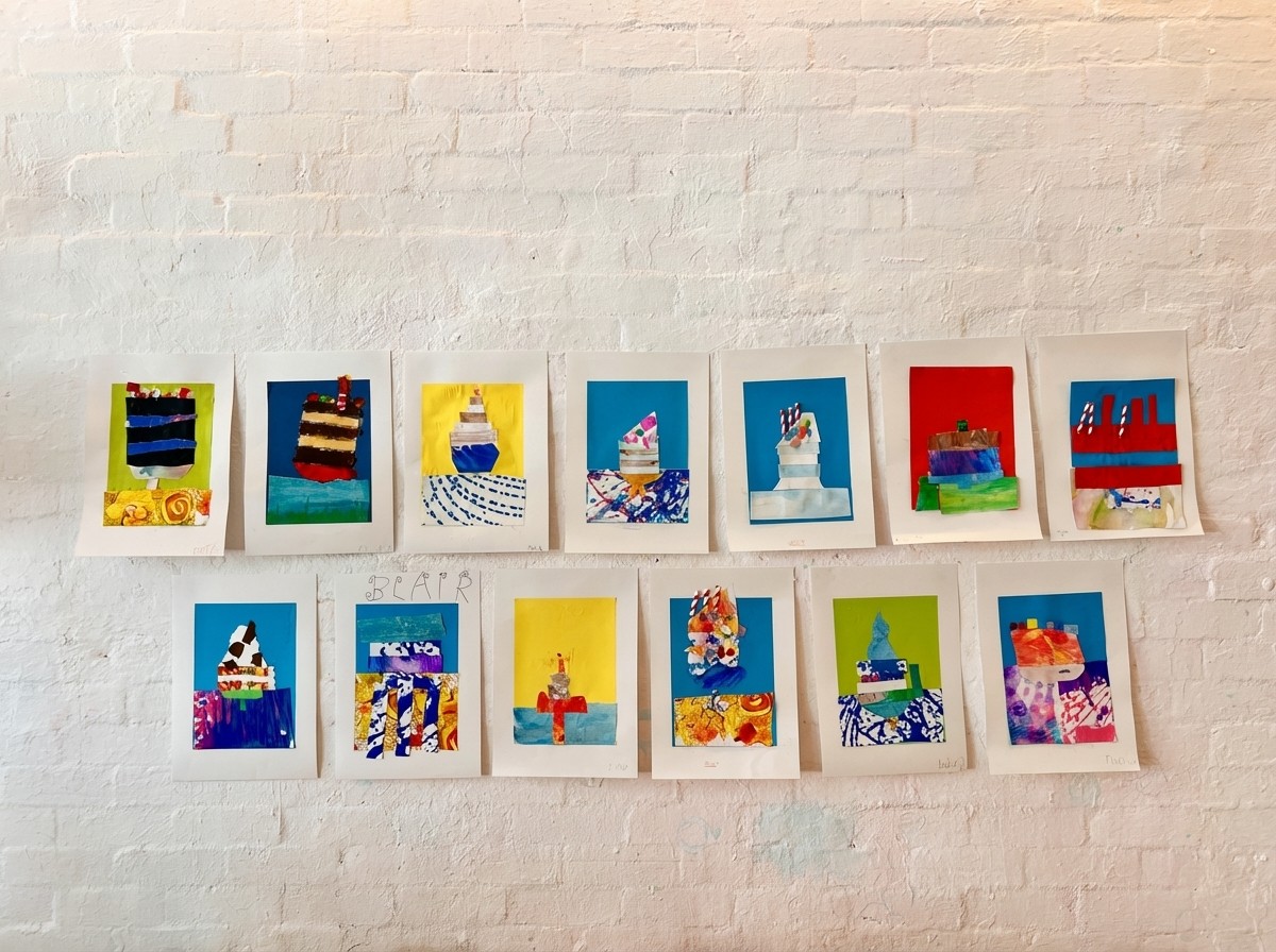 Pre-cut cupcake elements, made of thick cardstock, have worked really well for our Art Play Lab classes at Smudge. We cut simple icing shapes and cupcake bases, and often have a stack of patty pans ready to go as well (they’re perfect for leaning into the cupcake illusion).