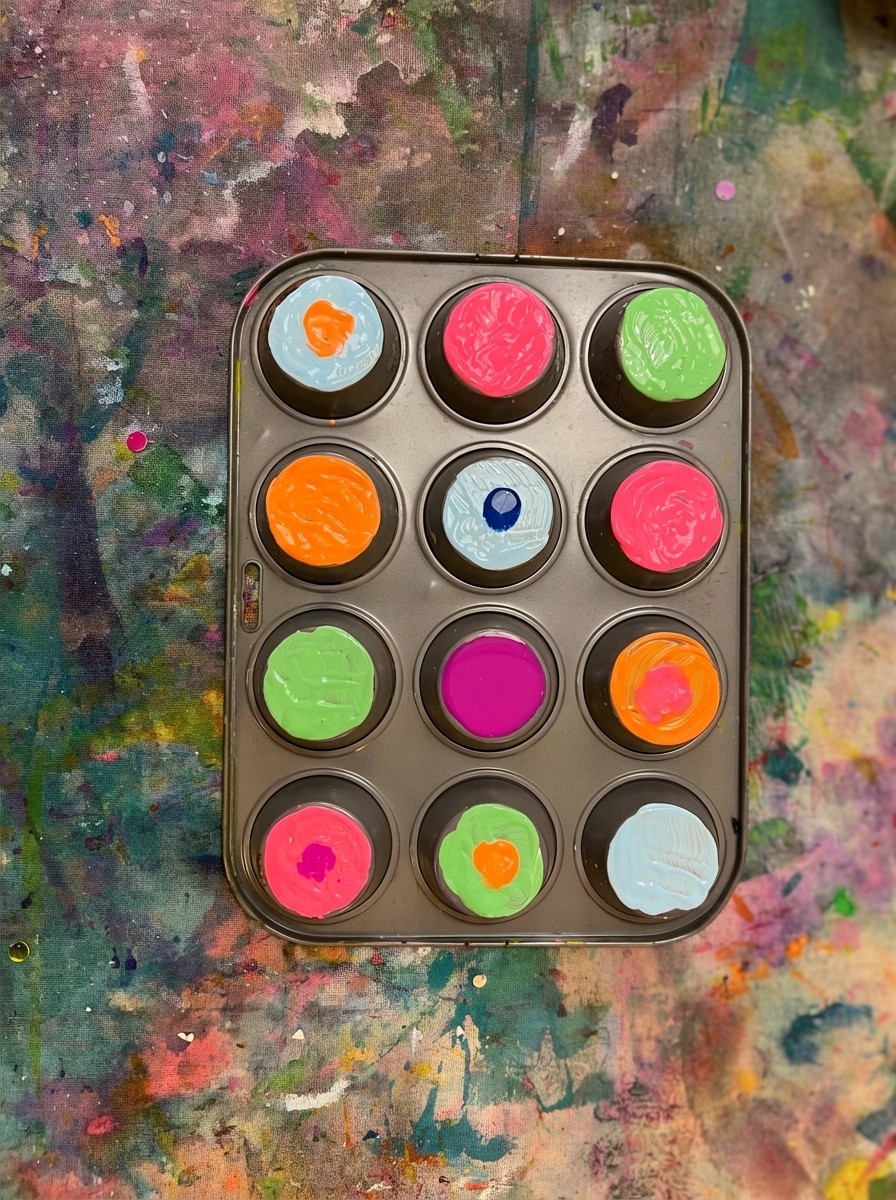 Flip muffin trays upside down so the circles are raised. Pour poster paint into jars and add a little white to each colour (it makes everything feel brighter and more delicious). Think icing tones, bakery windows, trays lined up and ready.