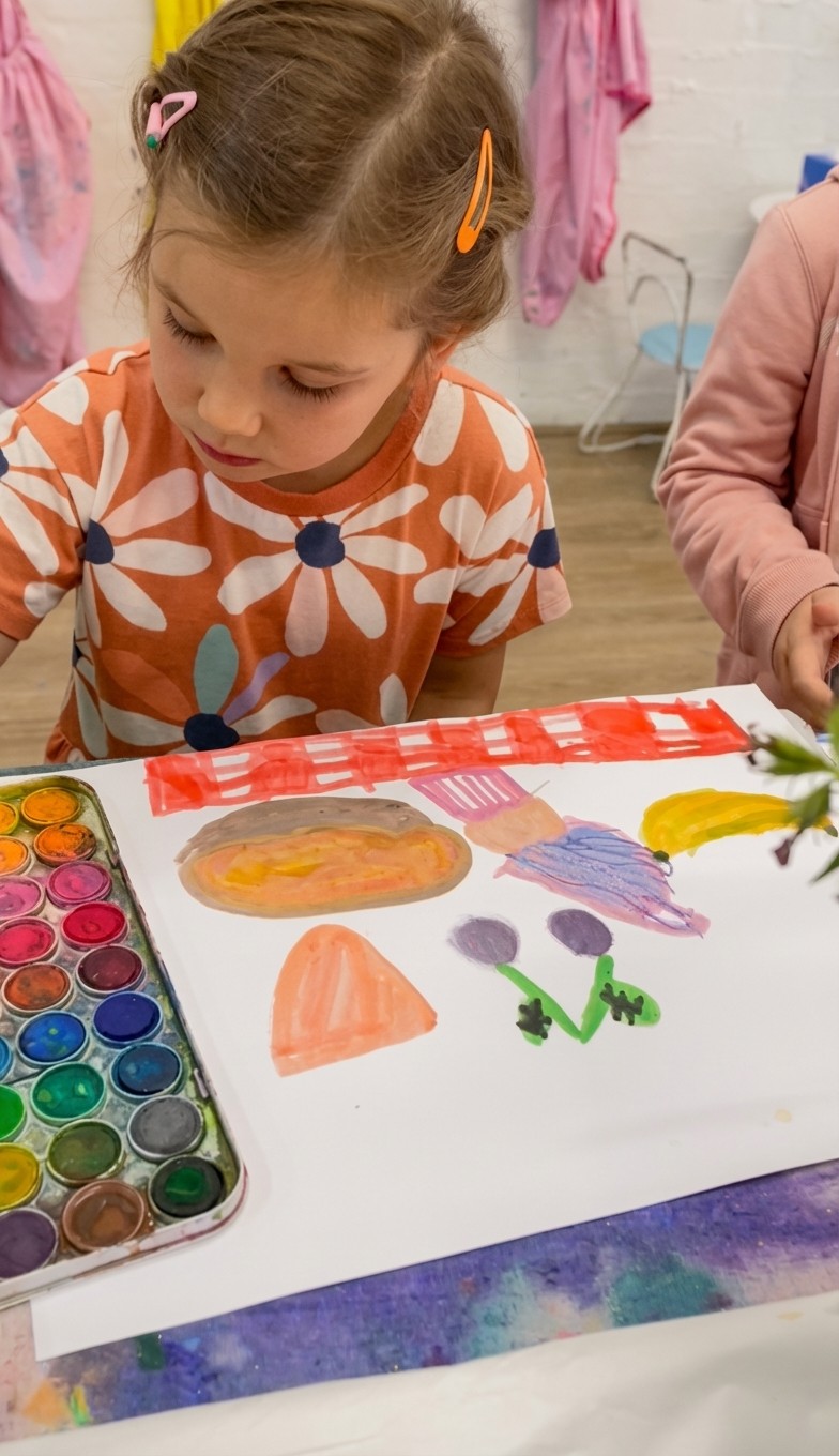 Bring in watercolour next. Loose washes, layering colour, letting things bleed a little. Oil pastel resists just enough to keep things grounded without becoming stiff. They might like to add in the table line and imagine a gorgeous design for the table cloth. Final details can be added once the paint dries.