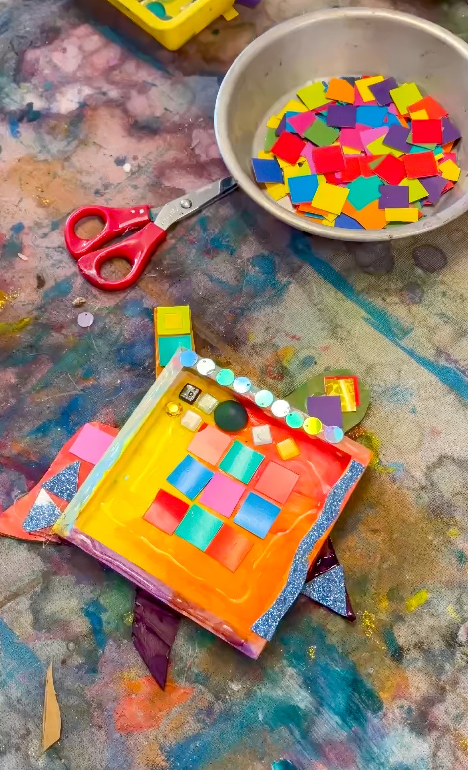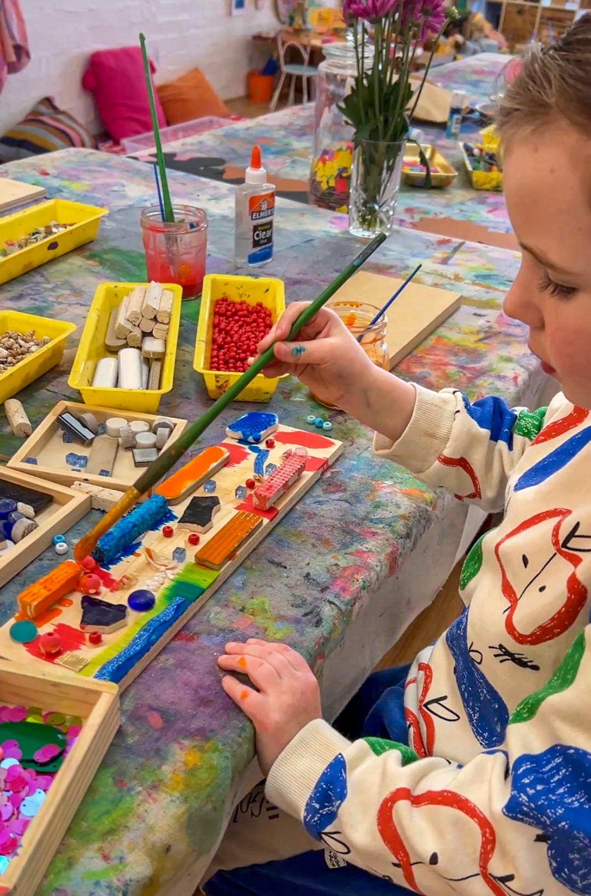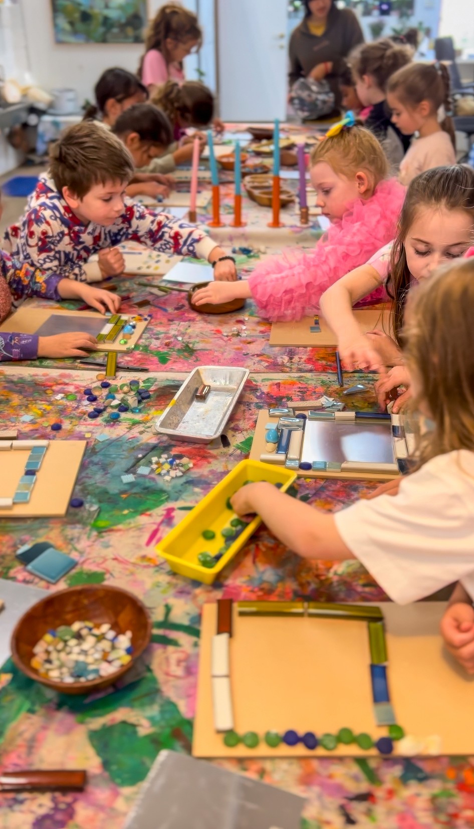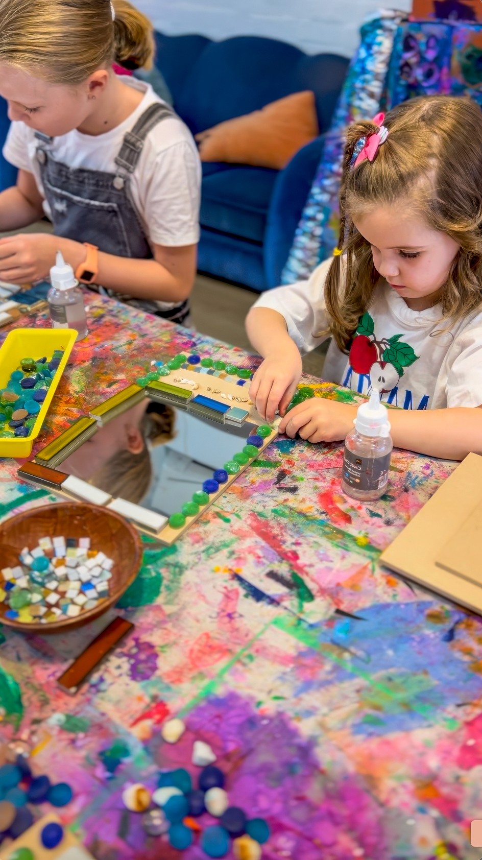 This is not a children’s art experience, but I’m including it because it ties in so beautifully with mosaics and it’s something I get asked about constantly. It is a little behind the scenes Smudge build moment from 2023!