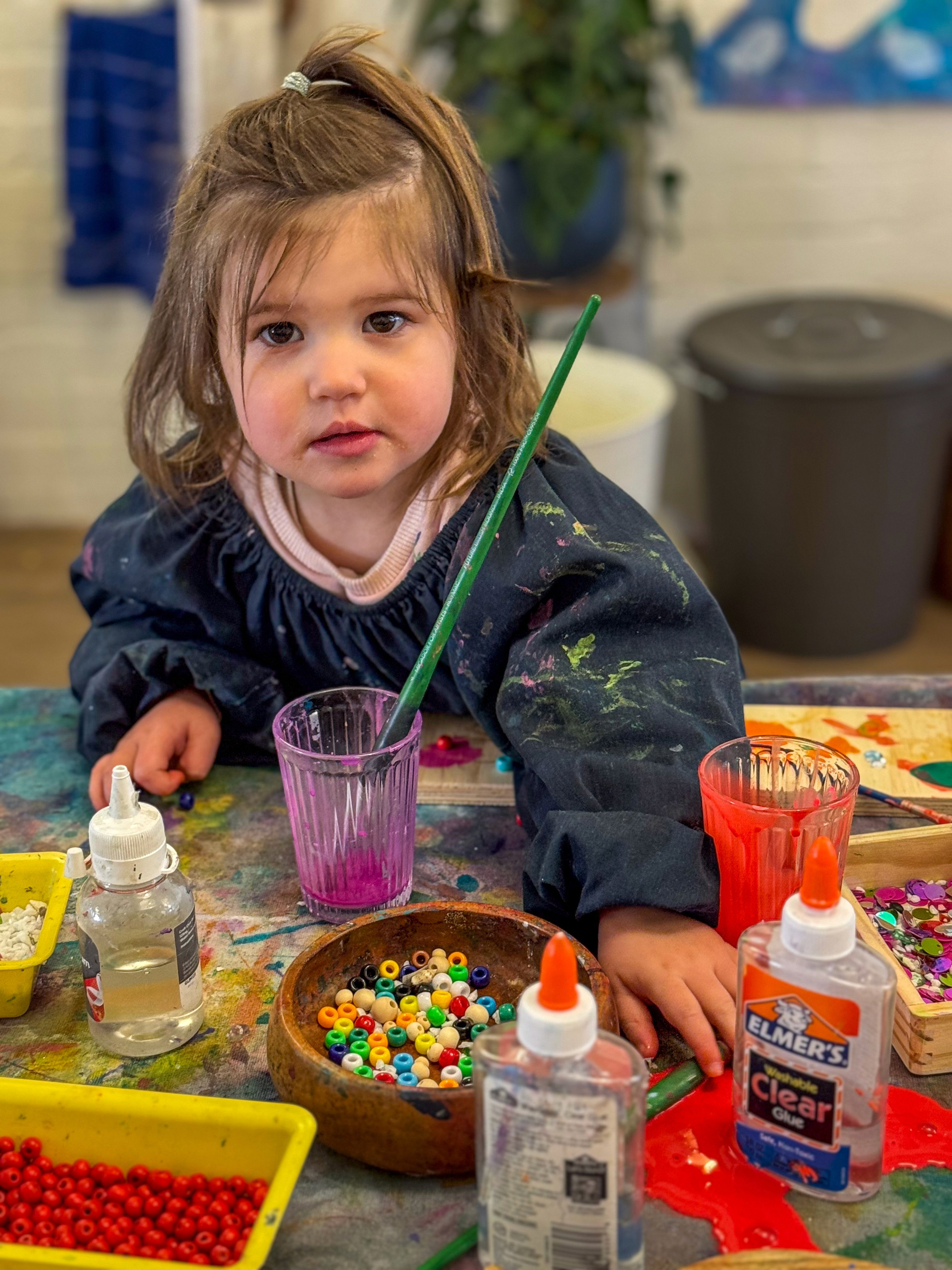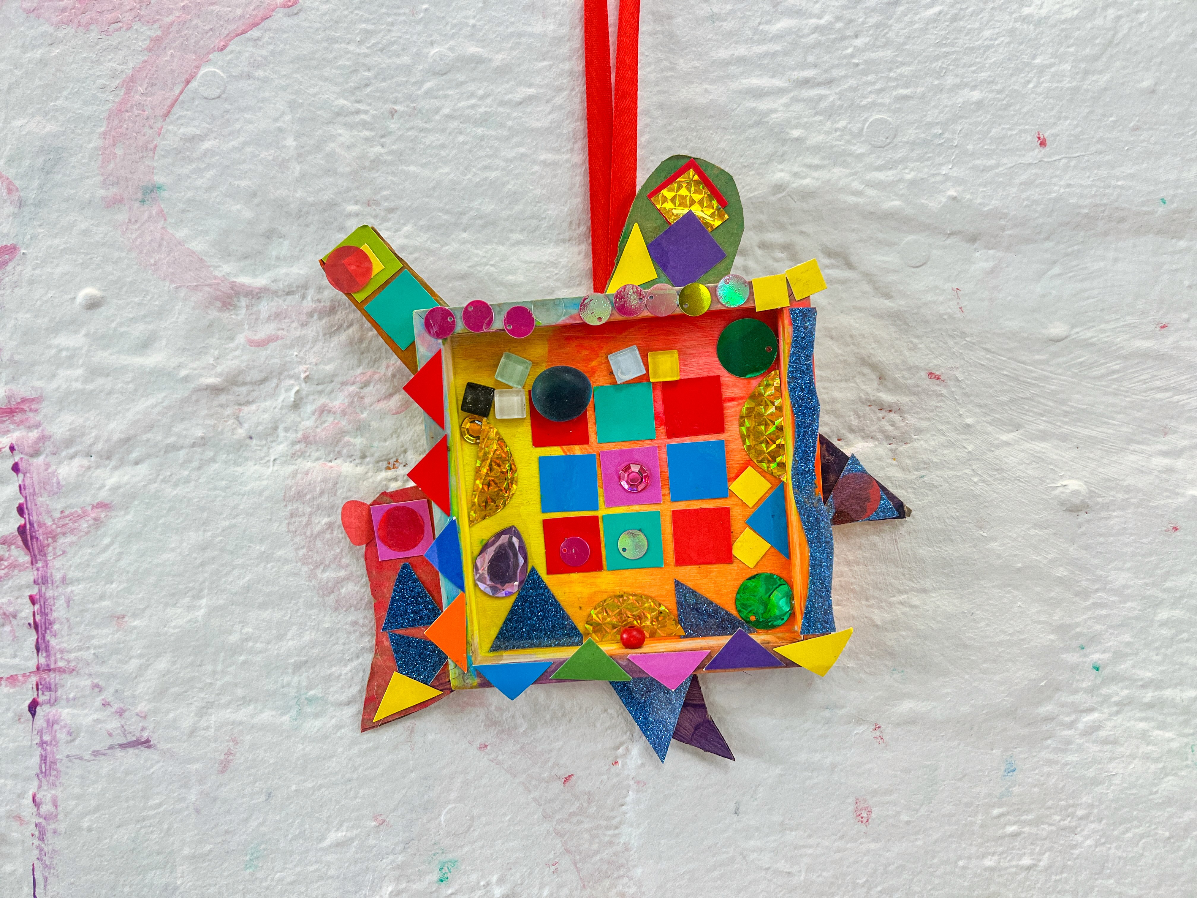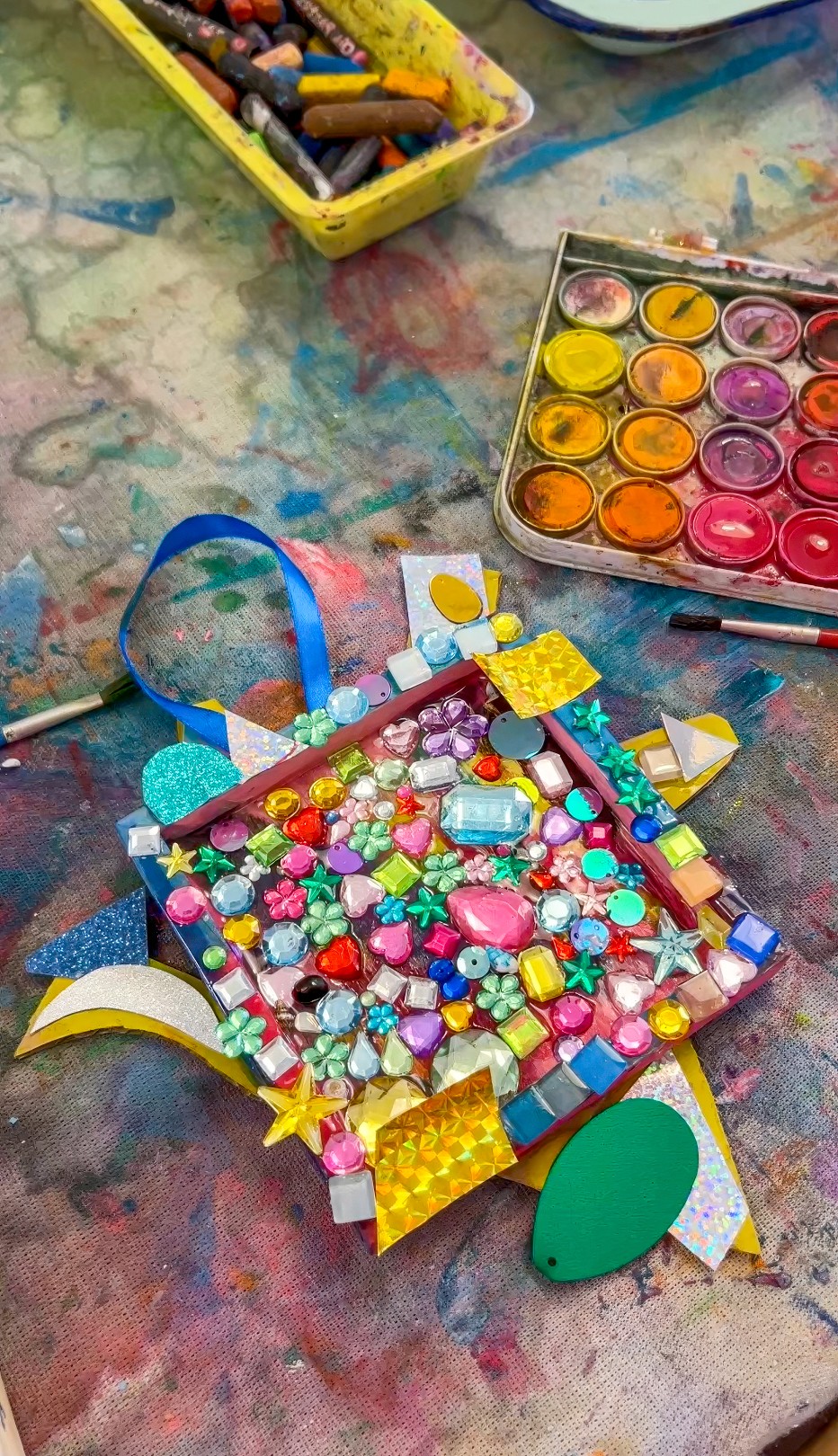 Then it becomes a layered build. Tiles, gems, beads, paper mosaic squares, anything sparkly. Kids choose where they want density and where they want space.