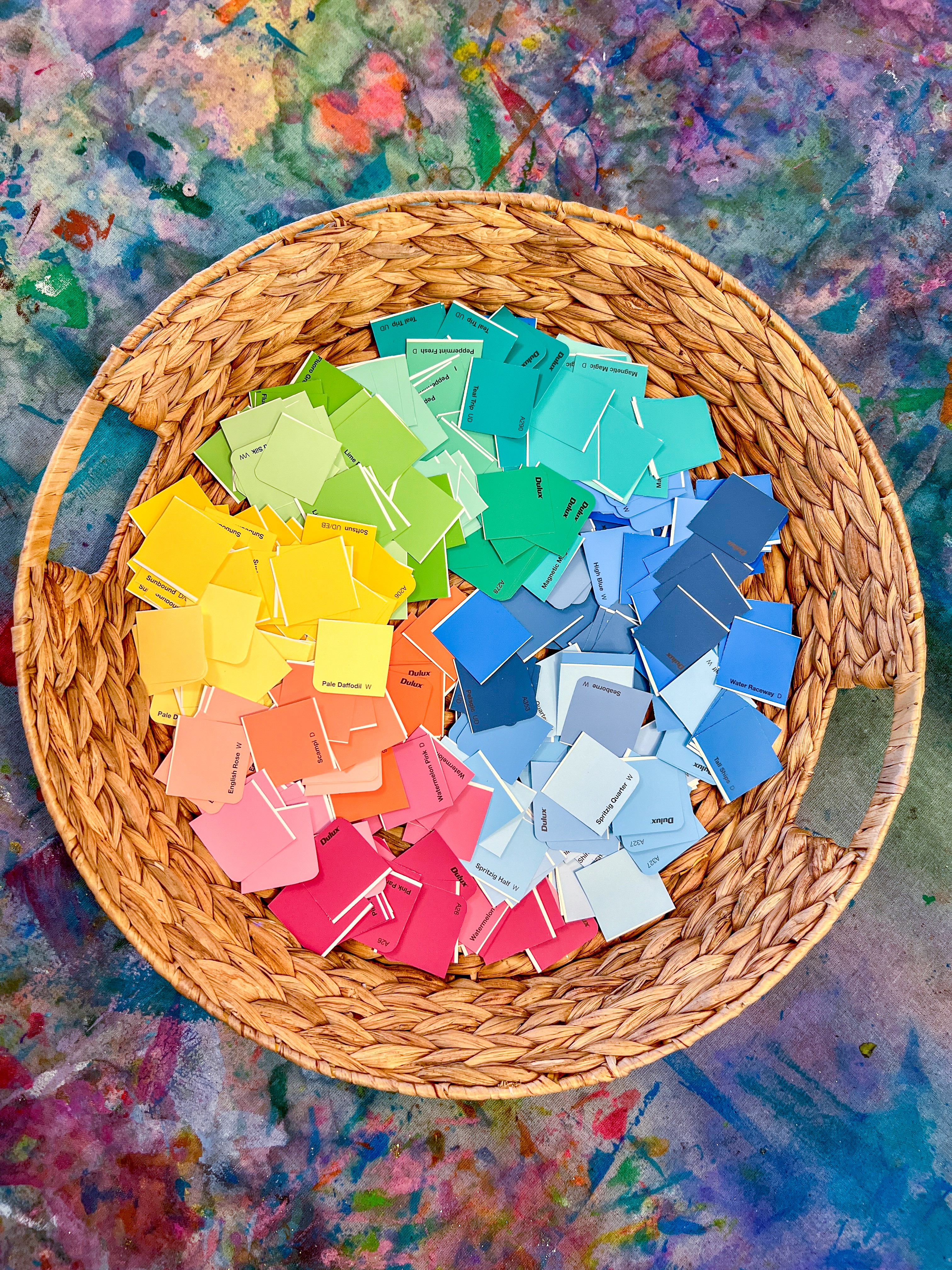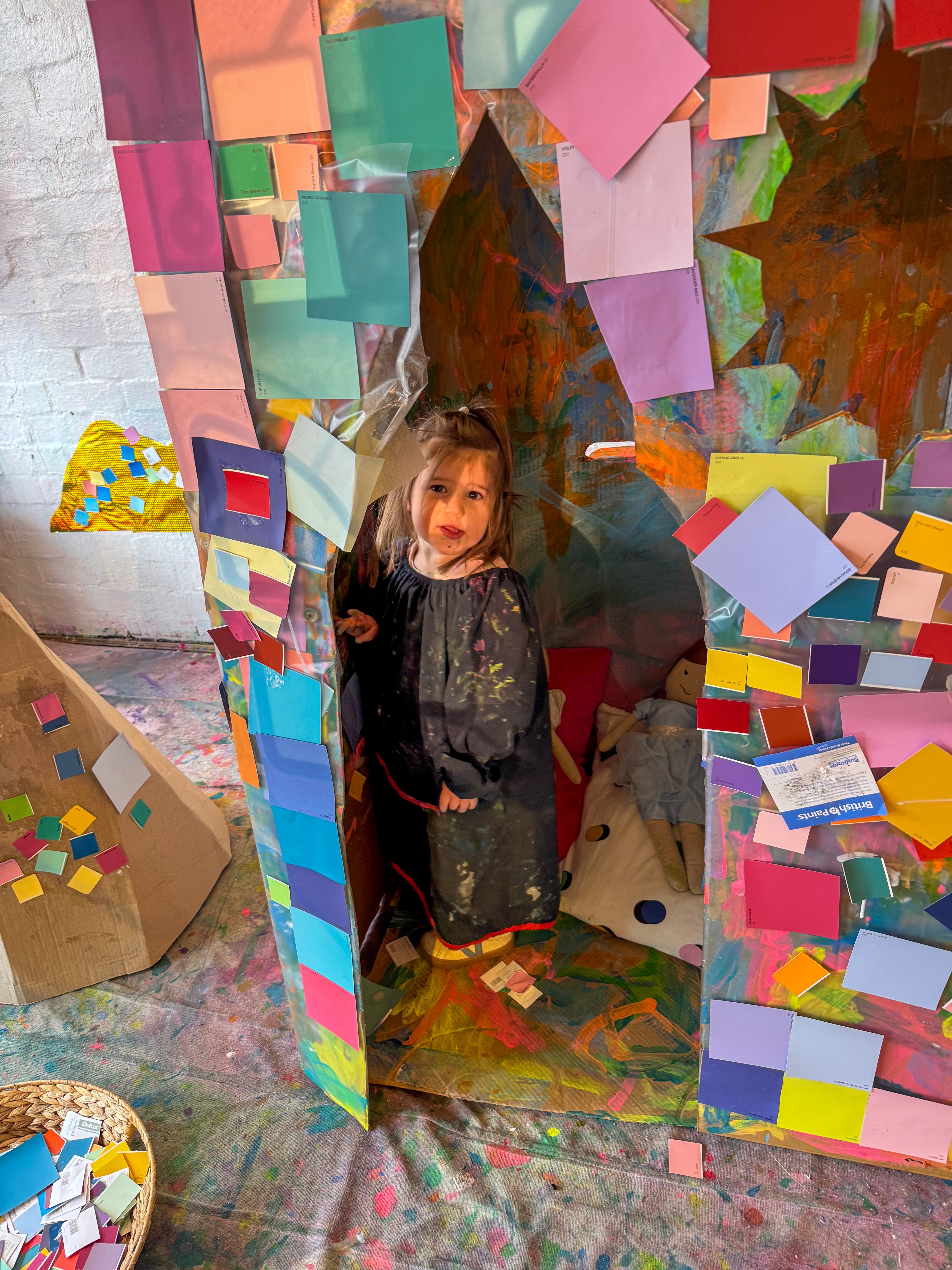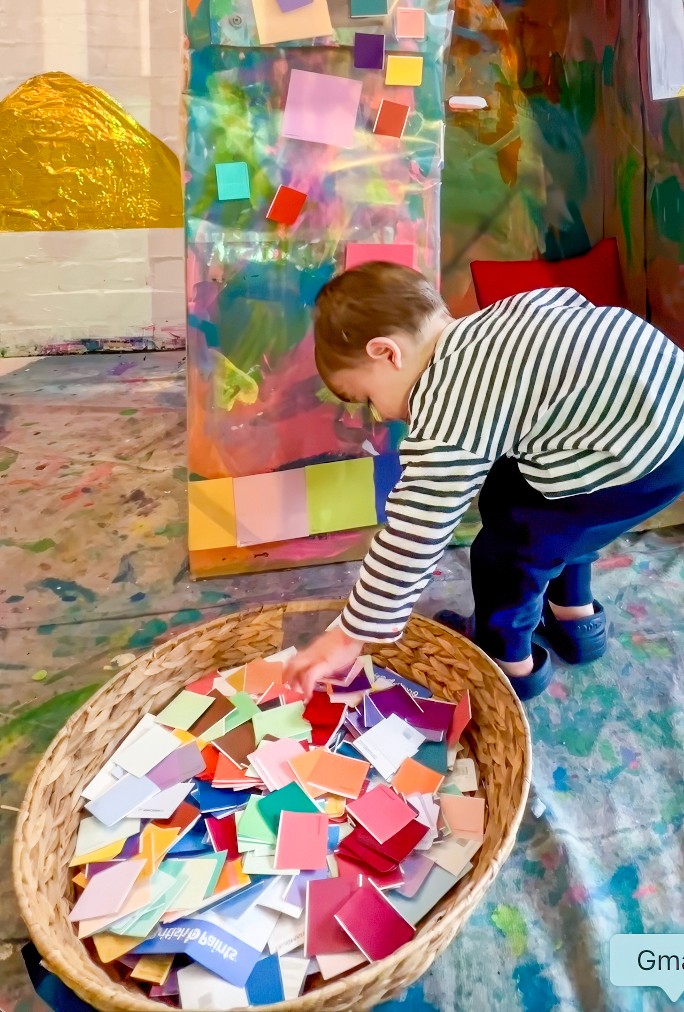 This art experience is about scale, collaboration, and letting children contribute in a way that feels immediate and satisfying. Paint swatches are perfect for this because they are already gorgeous, already curated, and kids can focus on choice and placement rather than mixing colour from scratch.