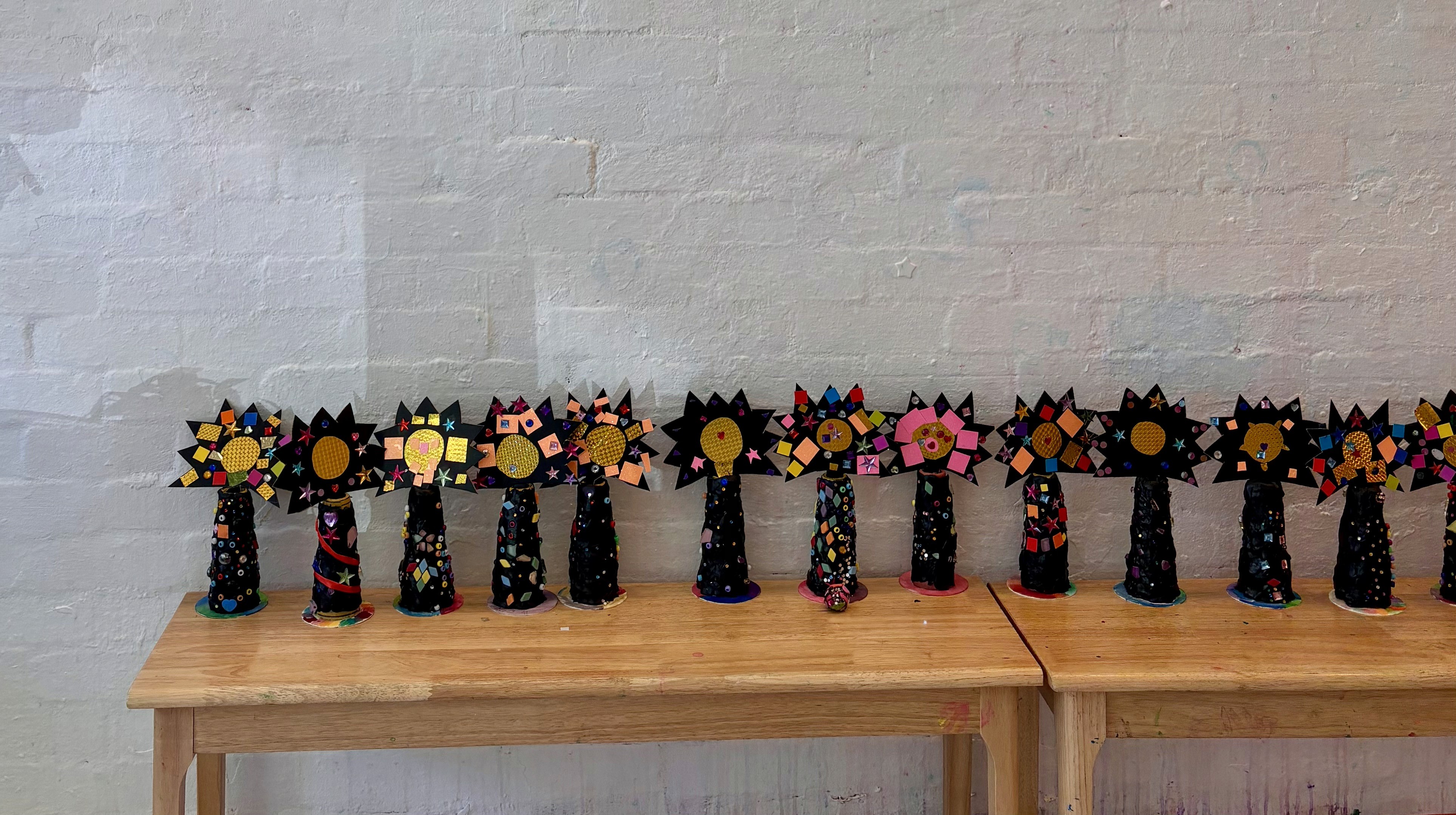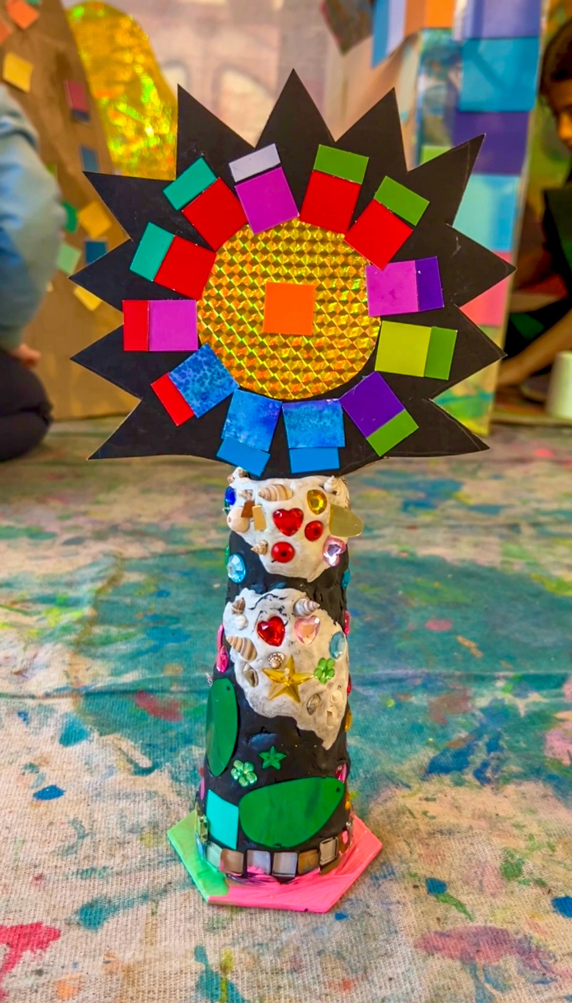 Once the cone feels finished to the artist, add the sun backing. Cut a simple sun shape from black cardboard, then collage on paper squares like tiny mosaic tiles. A gold circle or anything shiny for the centre helps bring the motif together, but it’s optional.