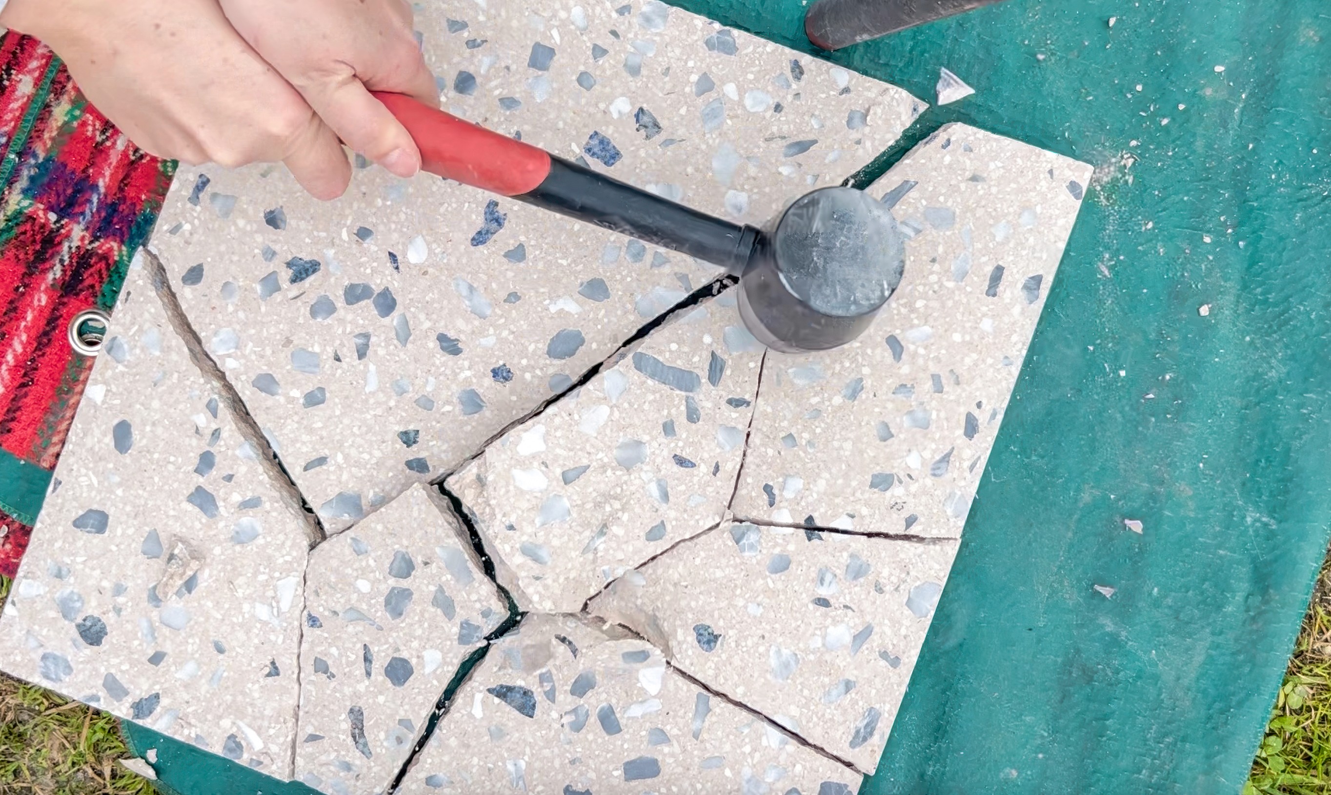 For smashing tiles, a rubber mallet is brilliant. Wrap tiles in a tea towel first and please wear safety goggles.