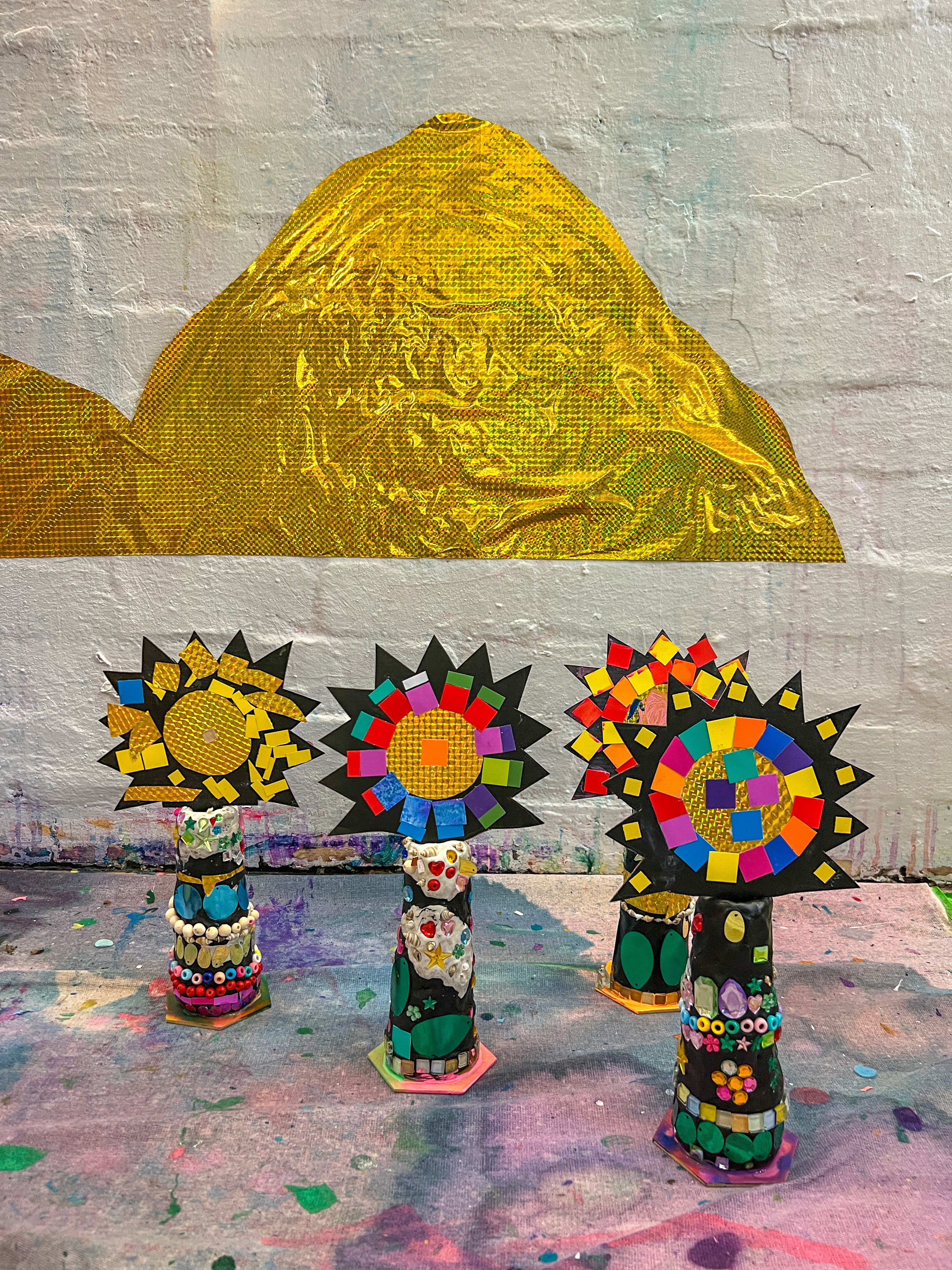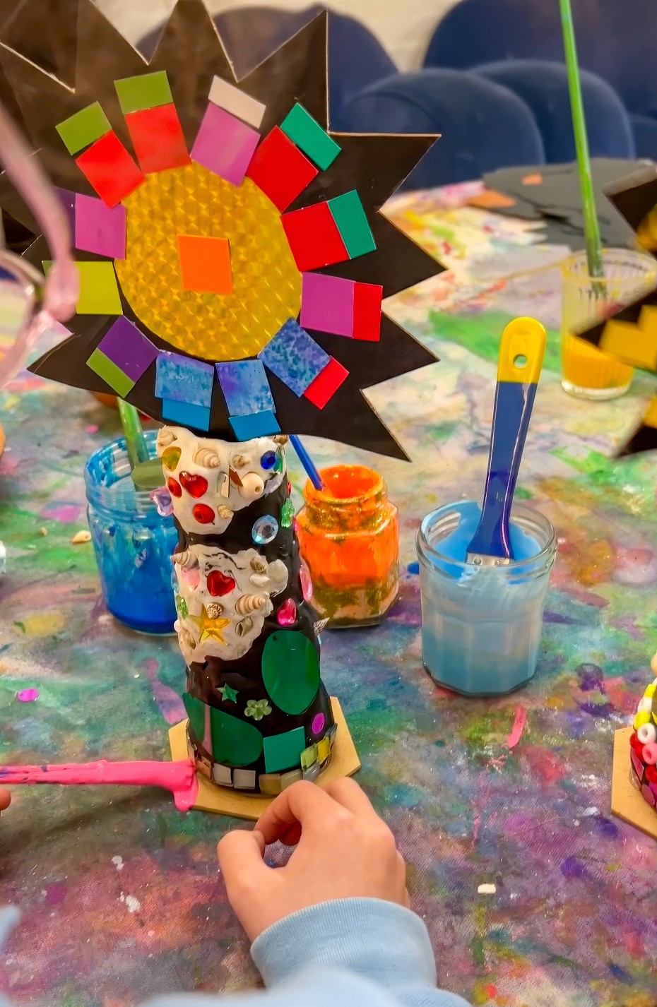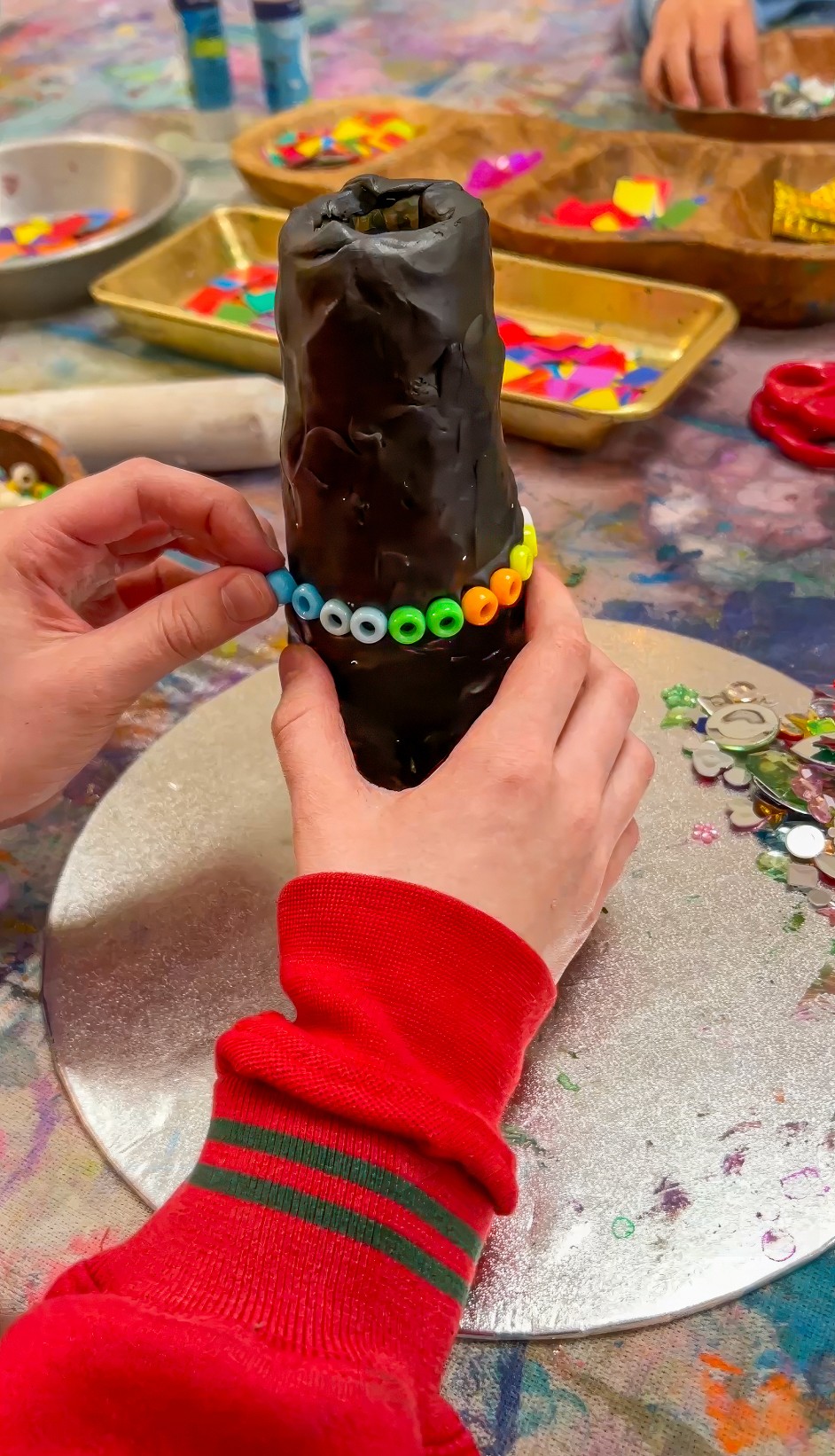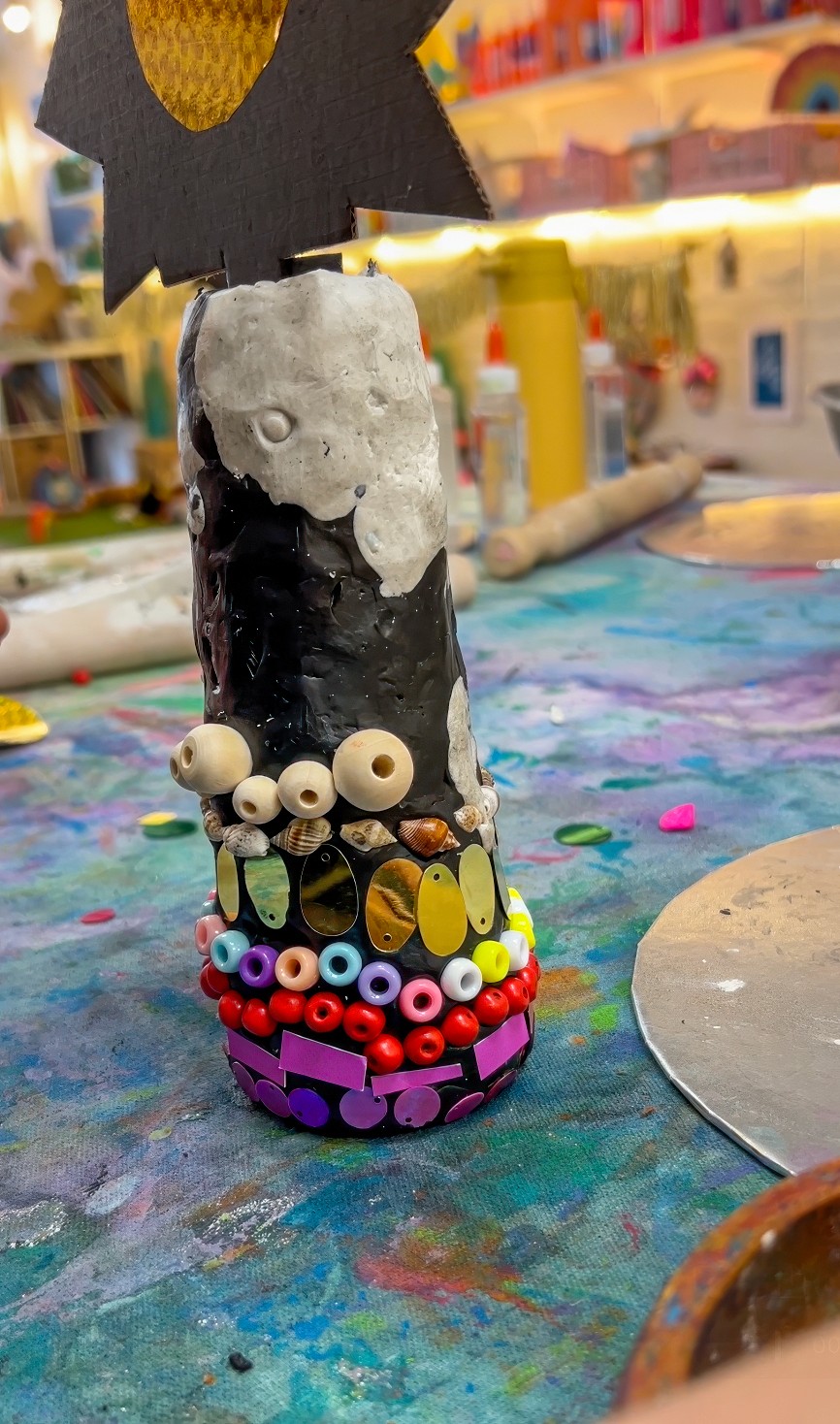 Cover the cone in plasticine, aiming for around 2cm thickness so tiles and sequins can press in securely. Then invite artists to choose their pieces and design however they like. Patterns, spirals, colour bands, totally random bursts, minimal, maximal, it all works.
