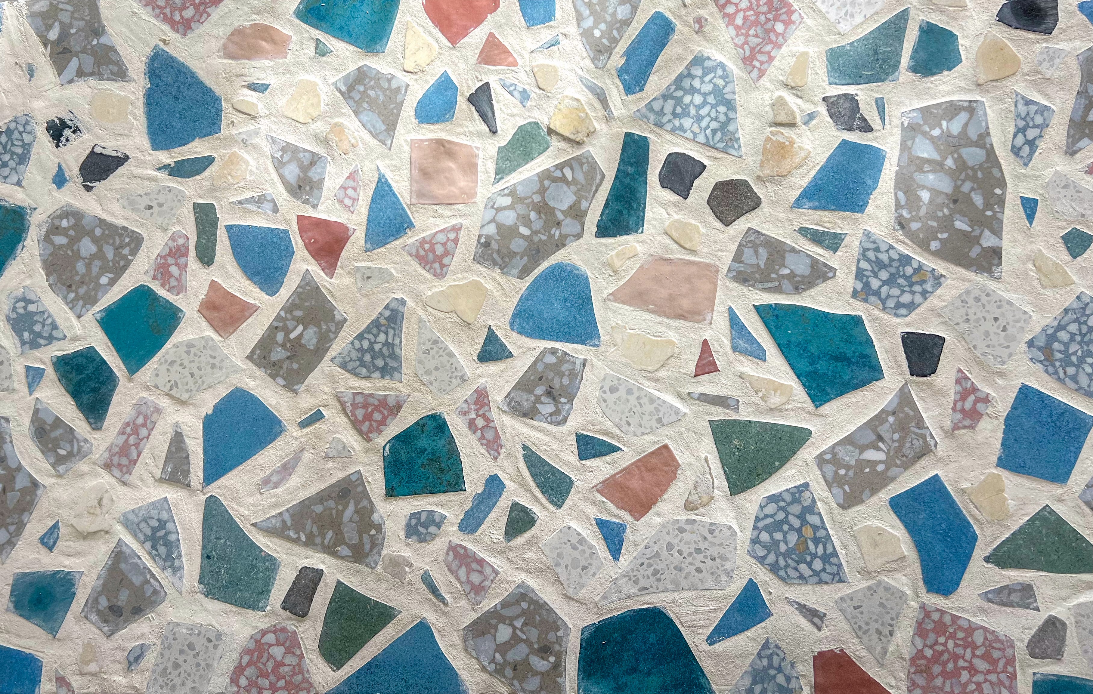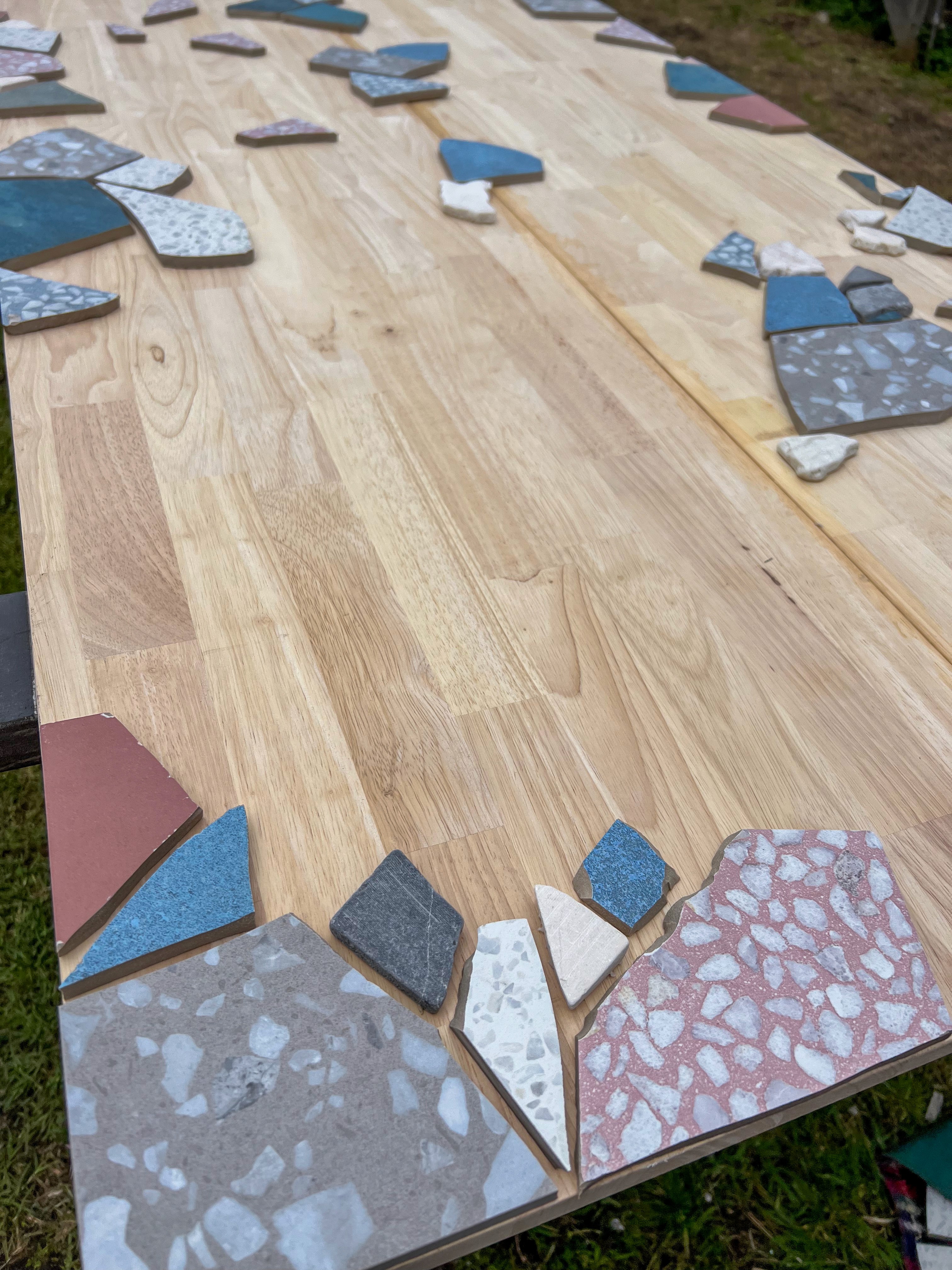 Lay out your tile pieces before gluing. Decide whether you want lots of grout showing (more terrazzo style), or tighter tiles with minimal grout lines (more mosaic style). I like starting by forming a border around the edge so the whole surface feels contained, then filling in from there.
