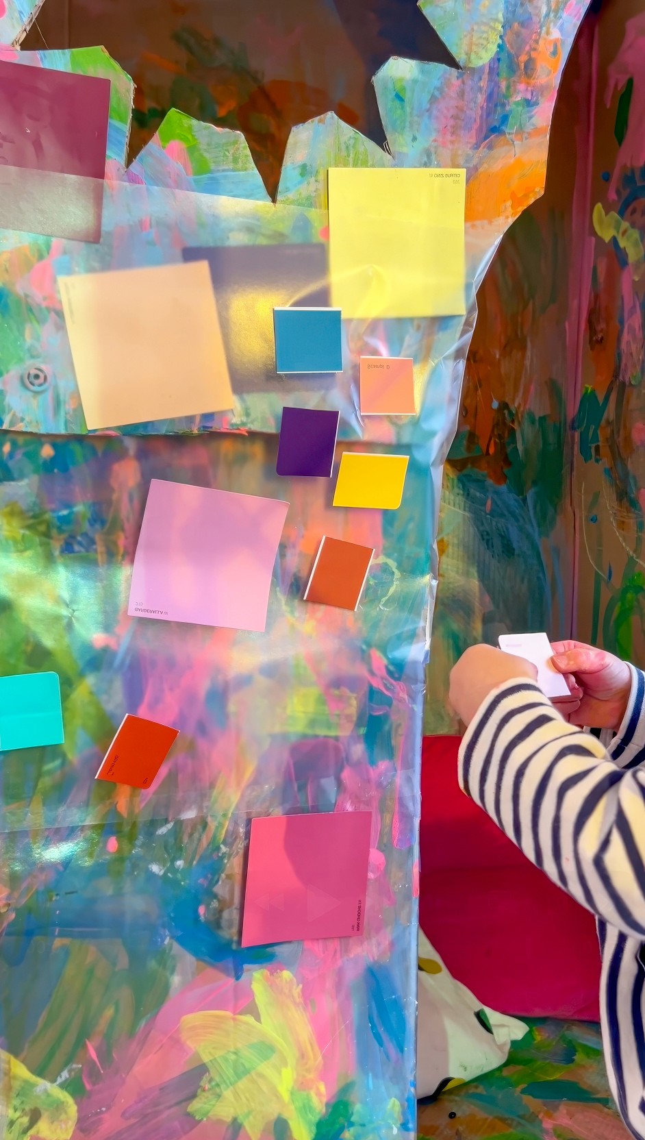 You can offer PVA glue in small pots for kids to brush and place swatches carefully. But we also love using sticky contact taped to the cardboard with the sticky side facing out. It means even the tiniest artists can pick up a swatch and slap it on, and they feel like they’re truly part of building the installation.
