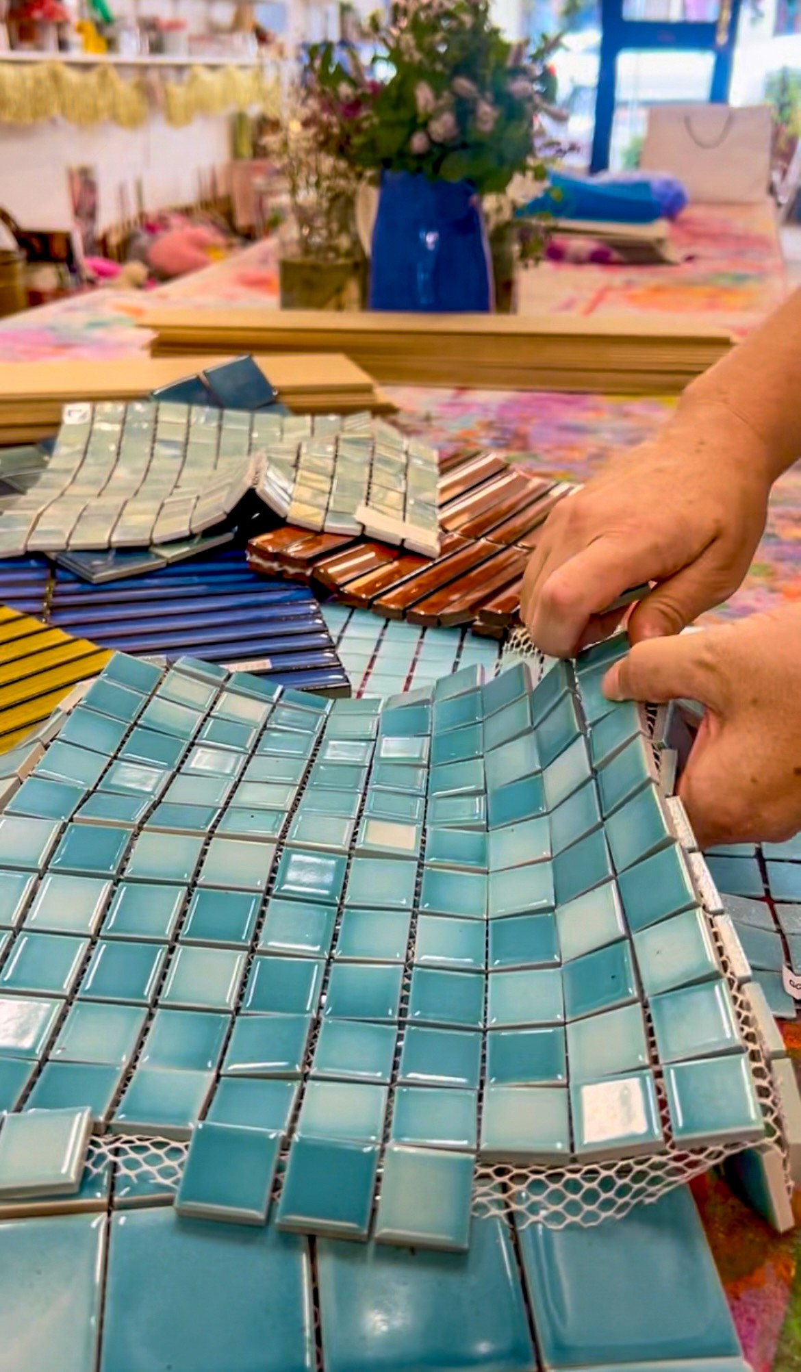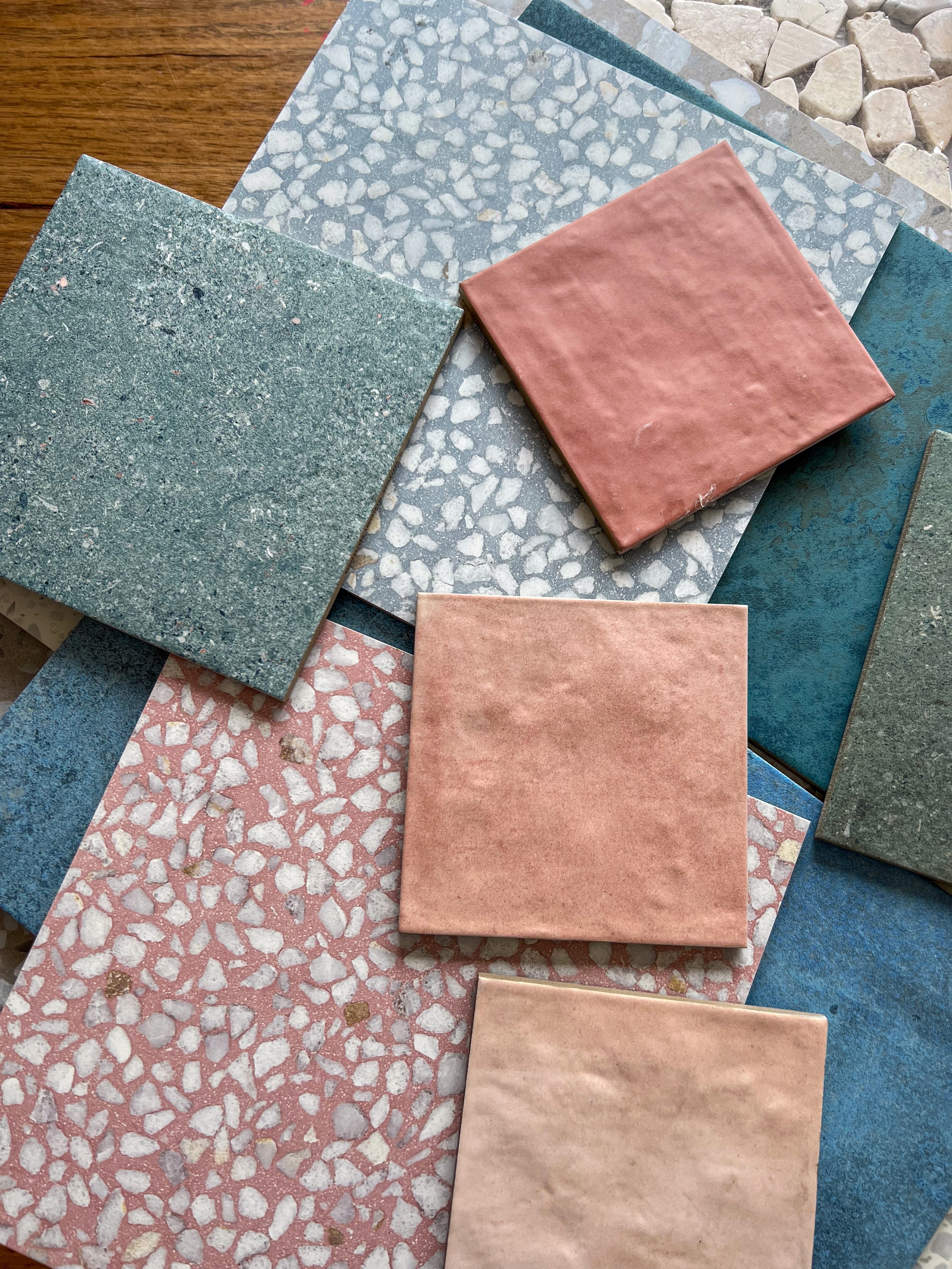 I went around to tile shops and collected samples in colours and textures I loved. If you ever do this yourself, try to find tiles that are a similar thickness. I didn't, and it made the finishing stage much harder!