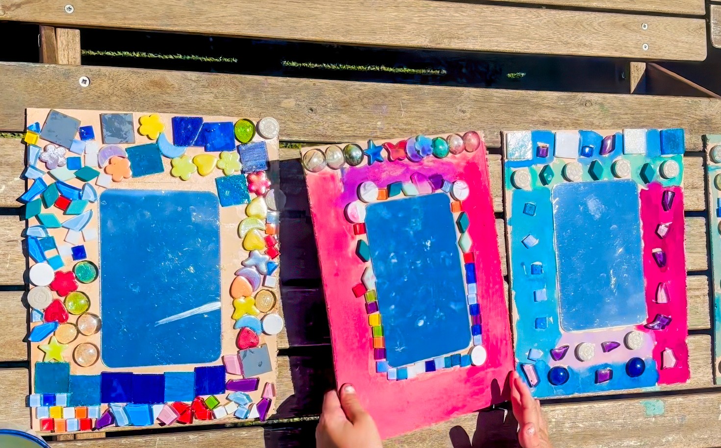 Our small wooden shadow boxes come out again because they are just too good. They are like tiny stages, and mosaics love a frame.