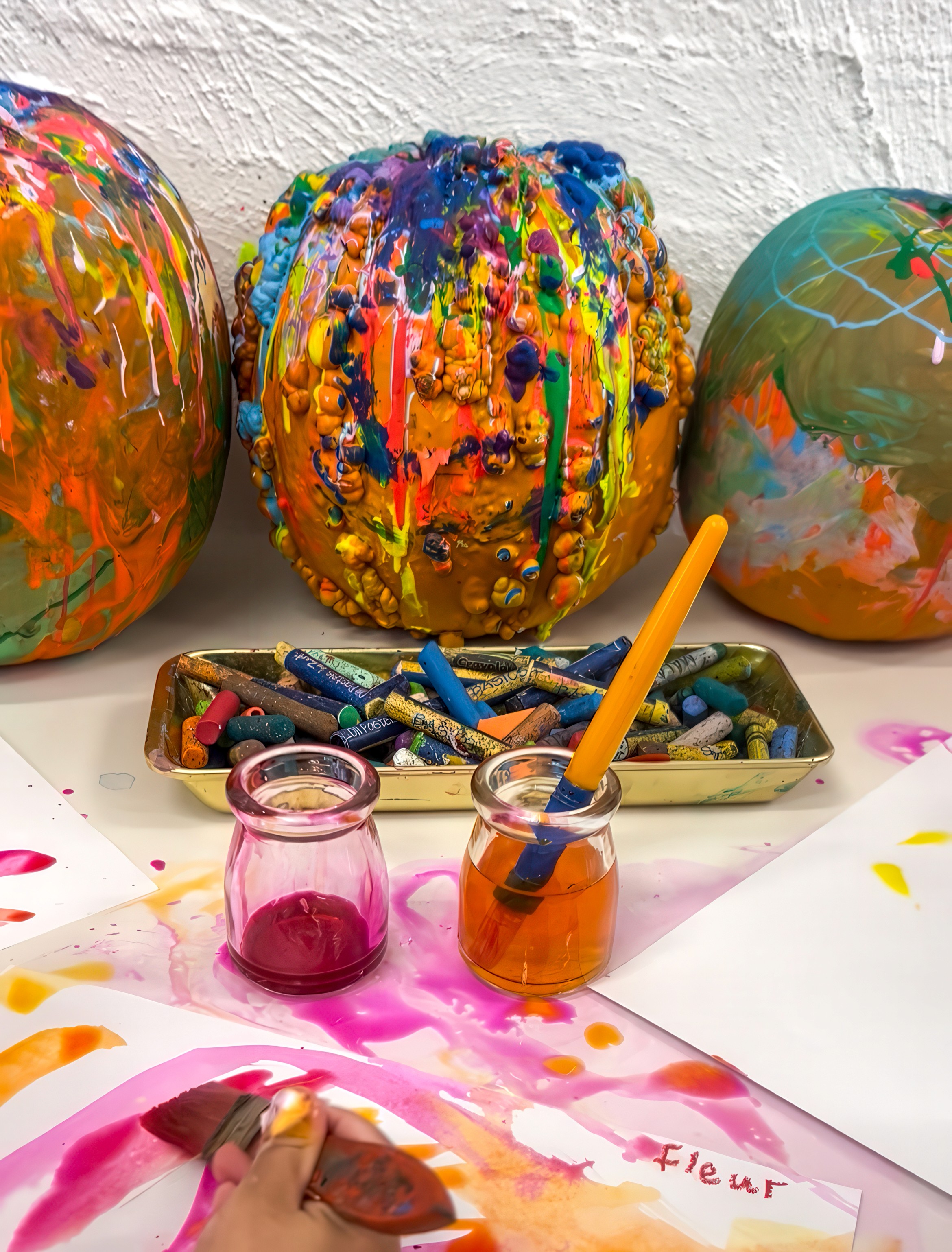 Paint runs across the curves in ways you cannot plan, which is exactly the joy of it. Don't worry if kids go wild with the bottles because if the pumpkin sits in a tray, the rainbow puddle left behind can become the material in another artwork later on. However much paint is used, it all belongs to the process.