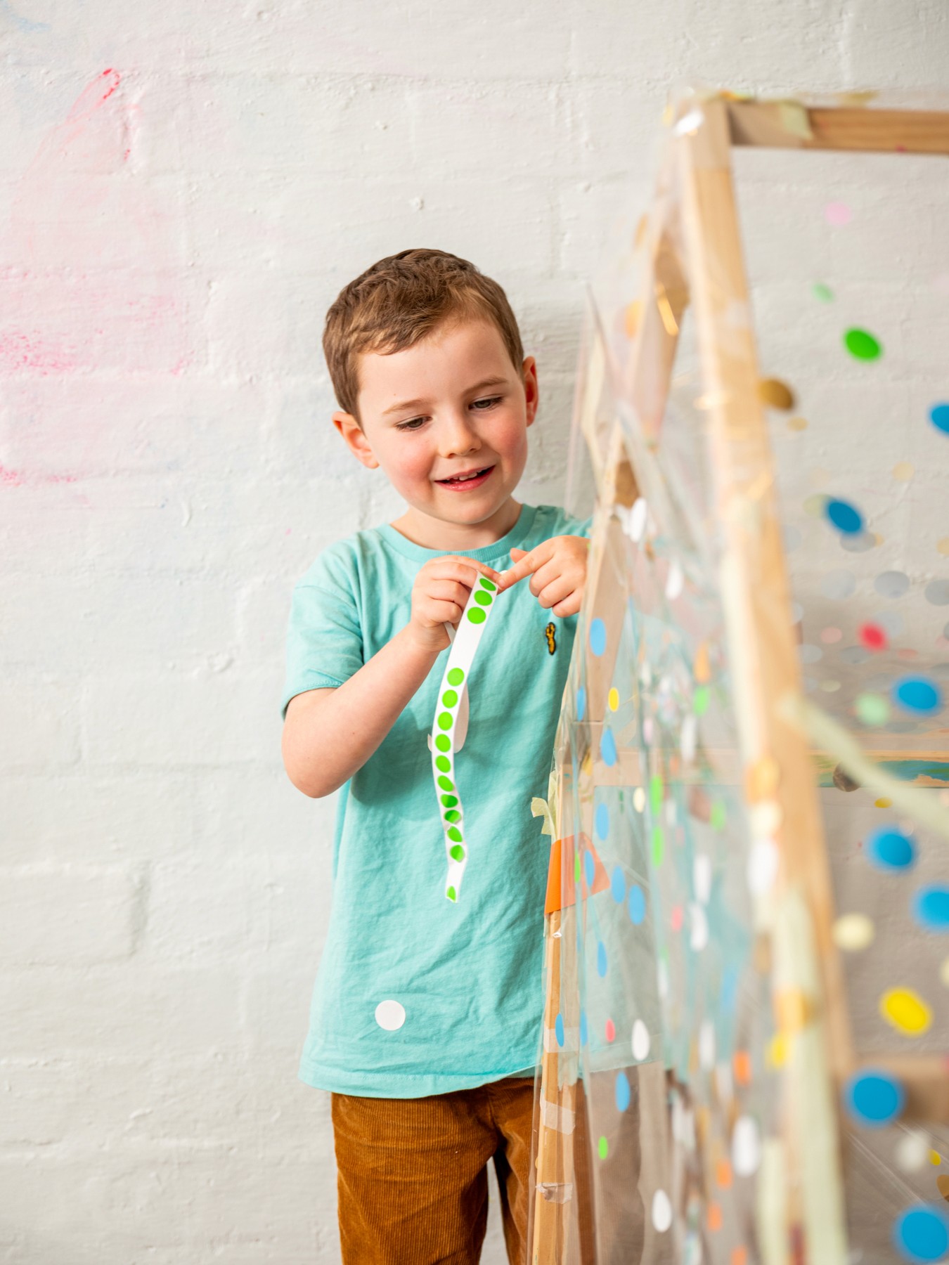 One of my favourite versions was when we used the wooden frame of a cubby house and wrapped it in clear cellophane. It became a glowing little structure that was covered inside and out with dots. Kids loved crawling in, sticking from the inside, then stepping out and seeing how the colours layered through the clear walls.
