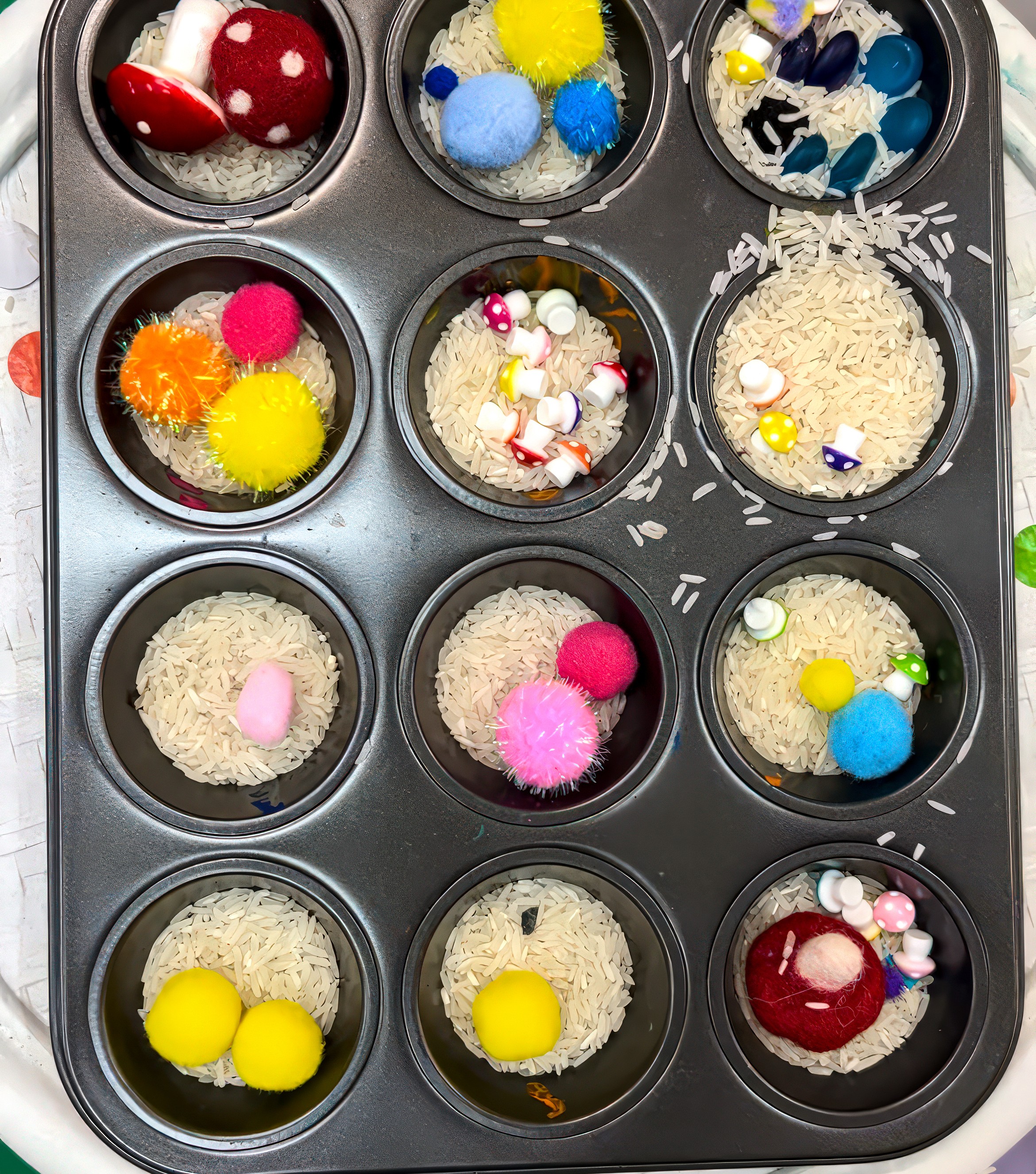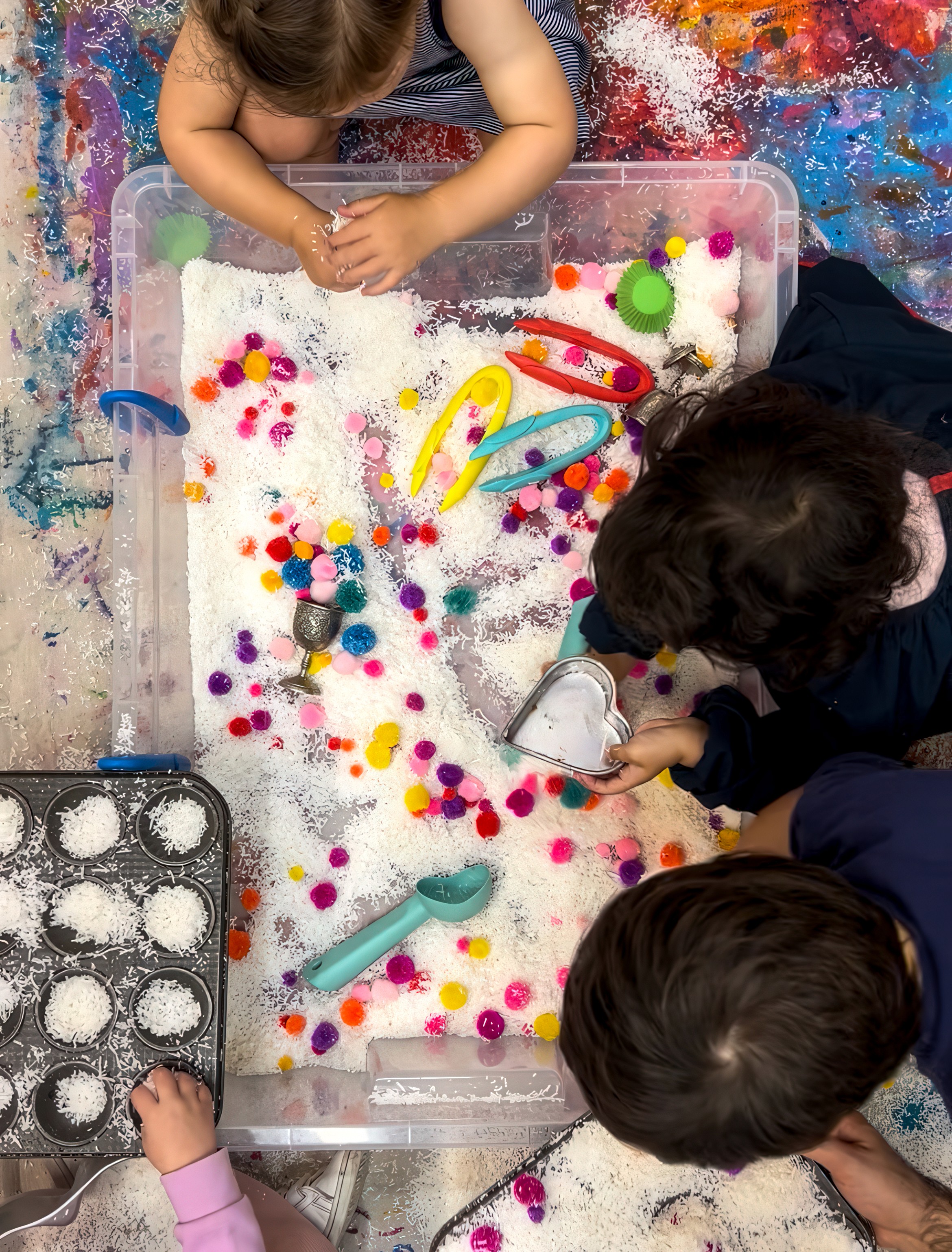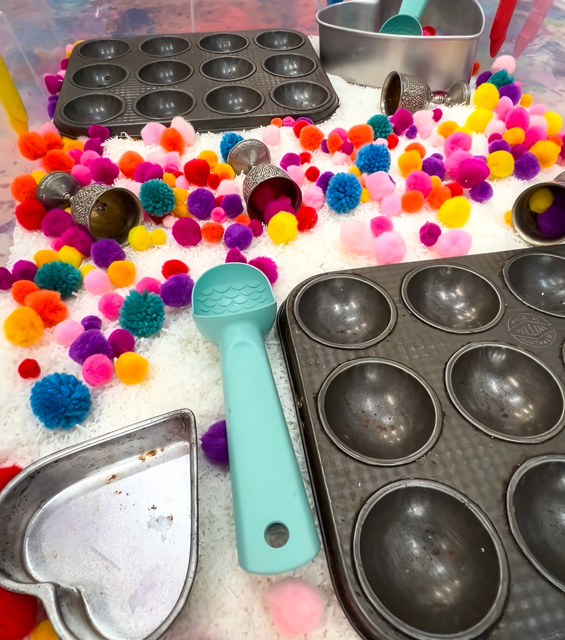 Fill a tub with pom poms in every size and colour! Sometimes we add another sensory tub 'base' to bulk it out a bit. Scatter in cups, bowls, scoops, and tweezers. Line the base with safety mirrors so the colours bounce and multiply.