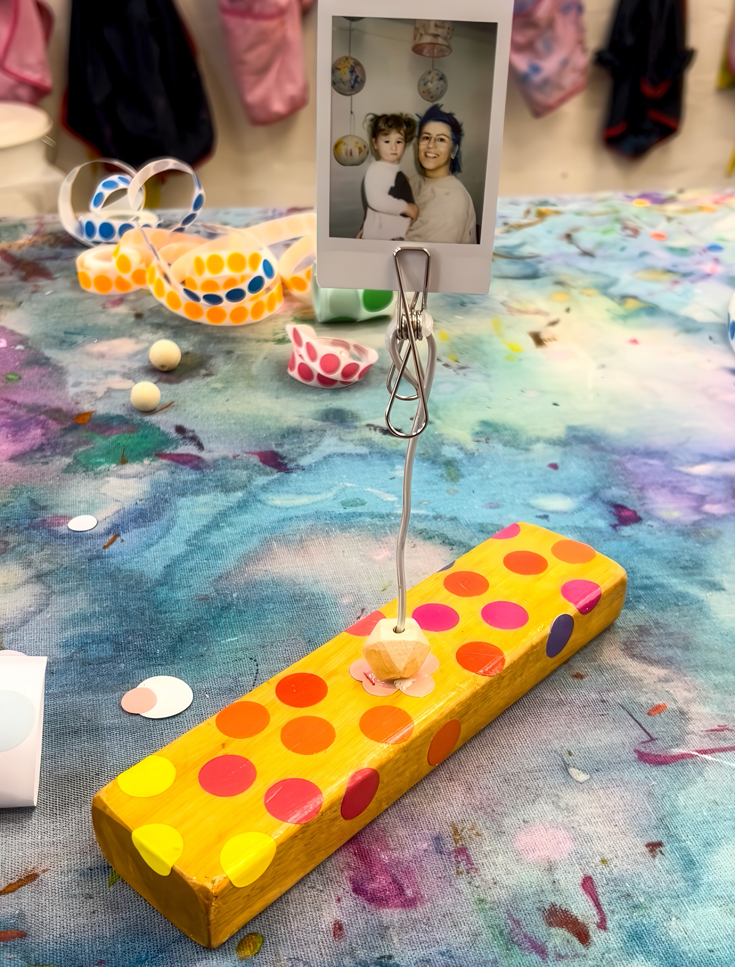 Start with a plain wooden block. Lay out trays of dot stickers and labels in every size and colour you can find.
