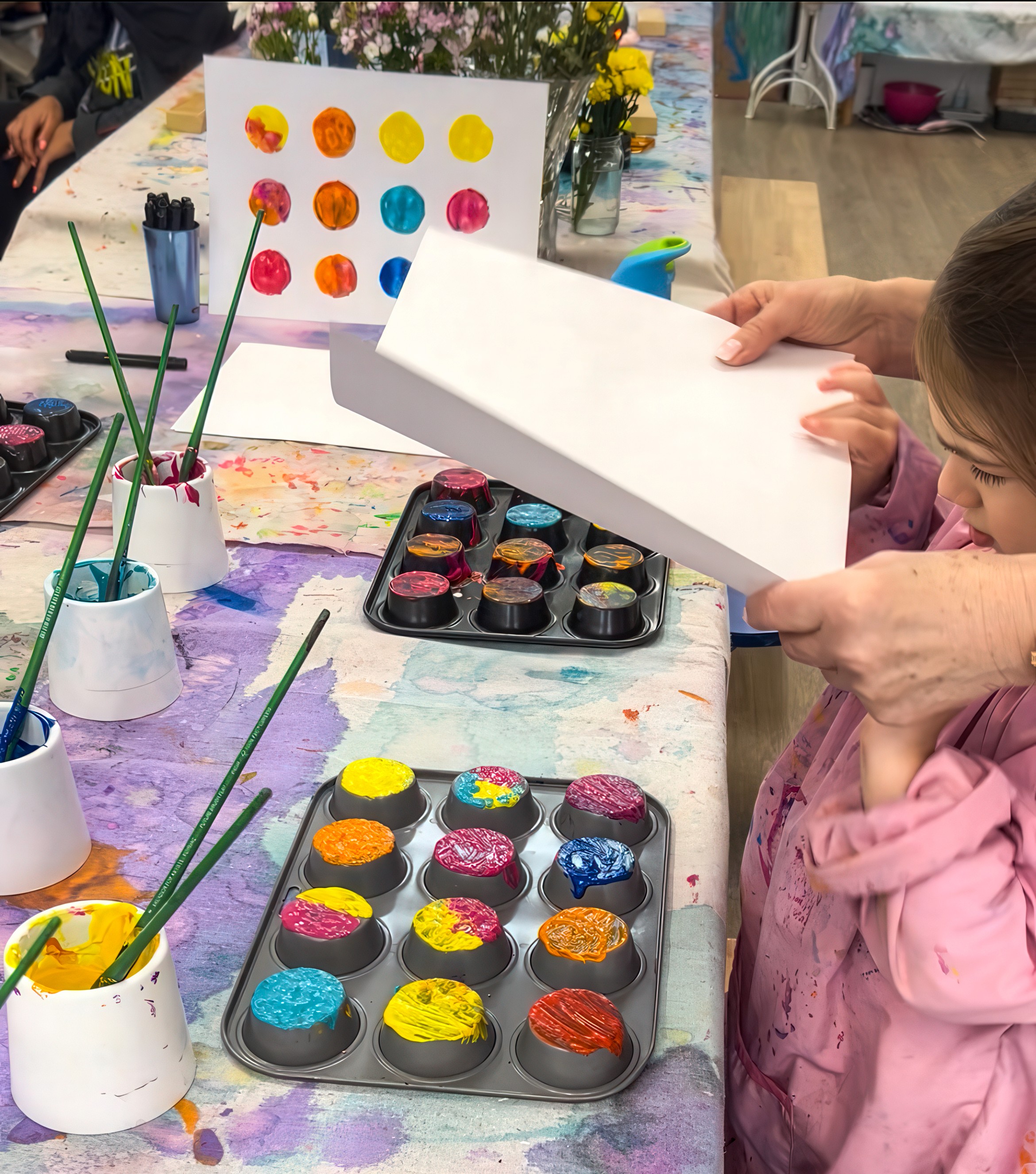 Load up the circles with brushes, sponges, or even fingertips. Keep it simple with one colour per jar or mix directly on the tray and watch marbling magic appear. Lay a sheet of A3 paper over the top and press down with your palms, or flip the tray dramatically onto the paper. Peel it back and it feels like magic; a whole field of circles appearing in one go!