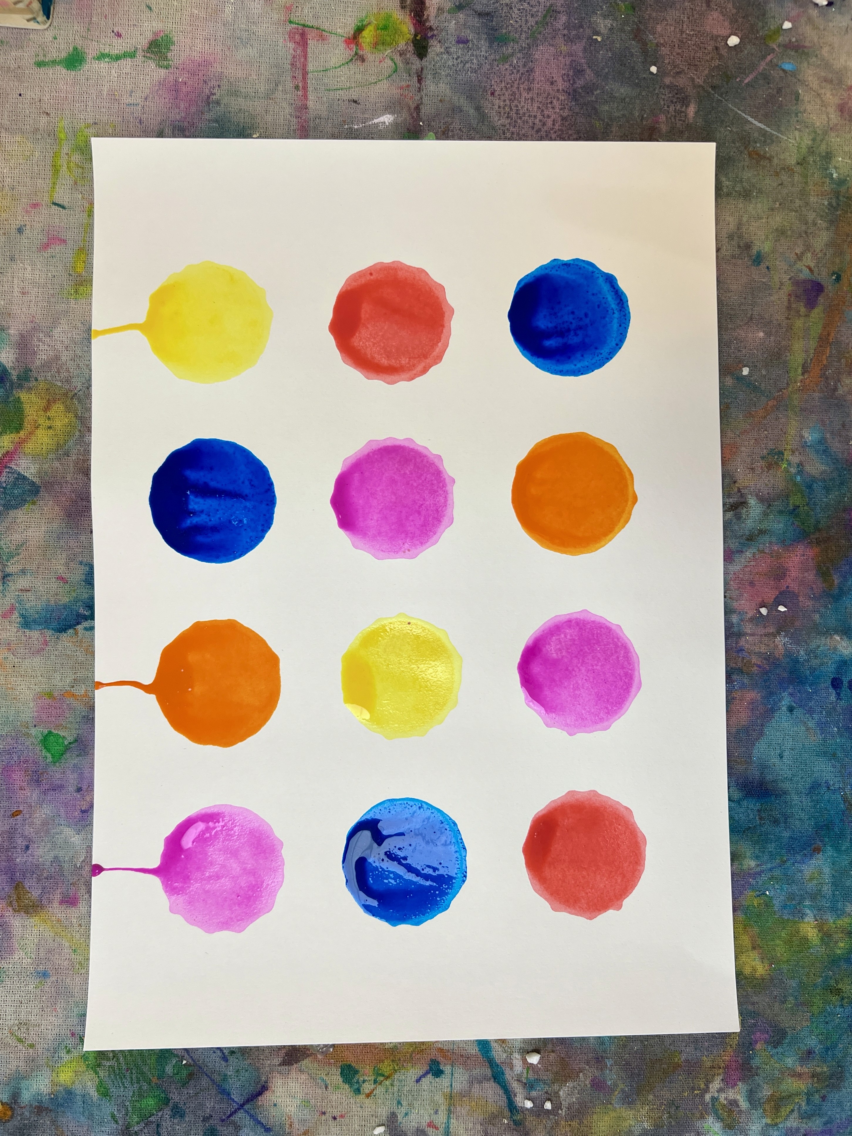 Try wet-on-wet watercolour painting too. This is where you brush water directly onto the page first, then drop in colour and watch it bloom. Some circles stay crisp, others spread into soft, glowing pools.