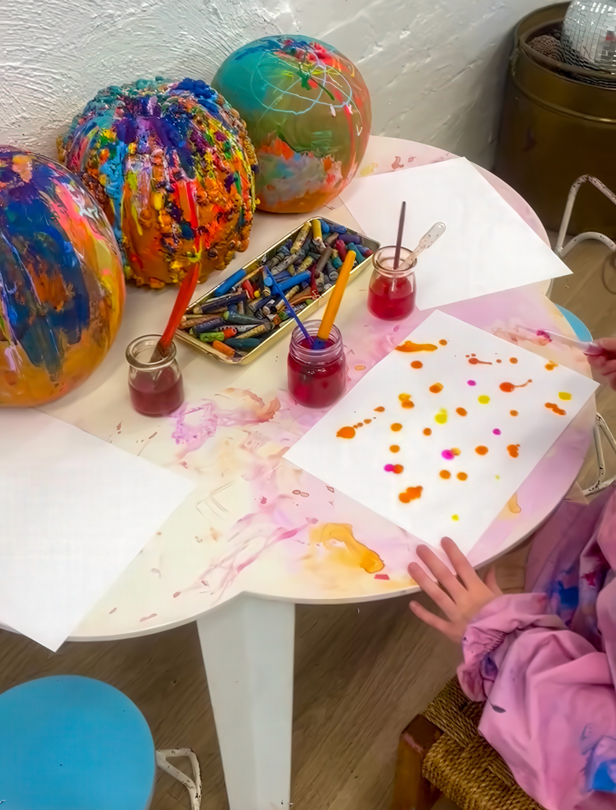 At Smudge, I always go for washable paint so that the play can happen again and again. Line up squeezey bottles, tubs of bright colour, spoons, and brushes. The pumpkin is ready to be transformed!